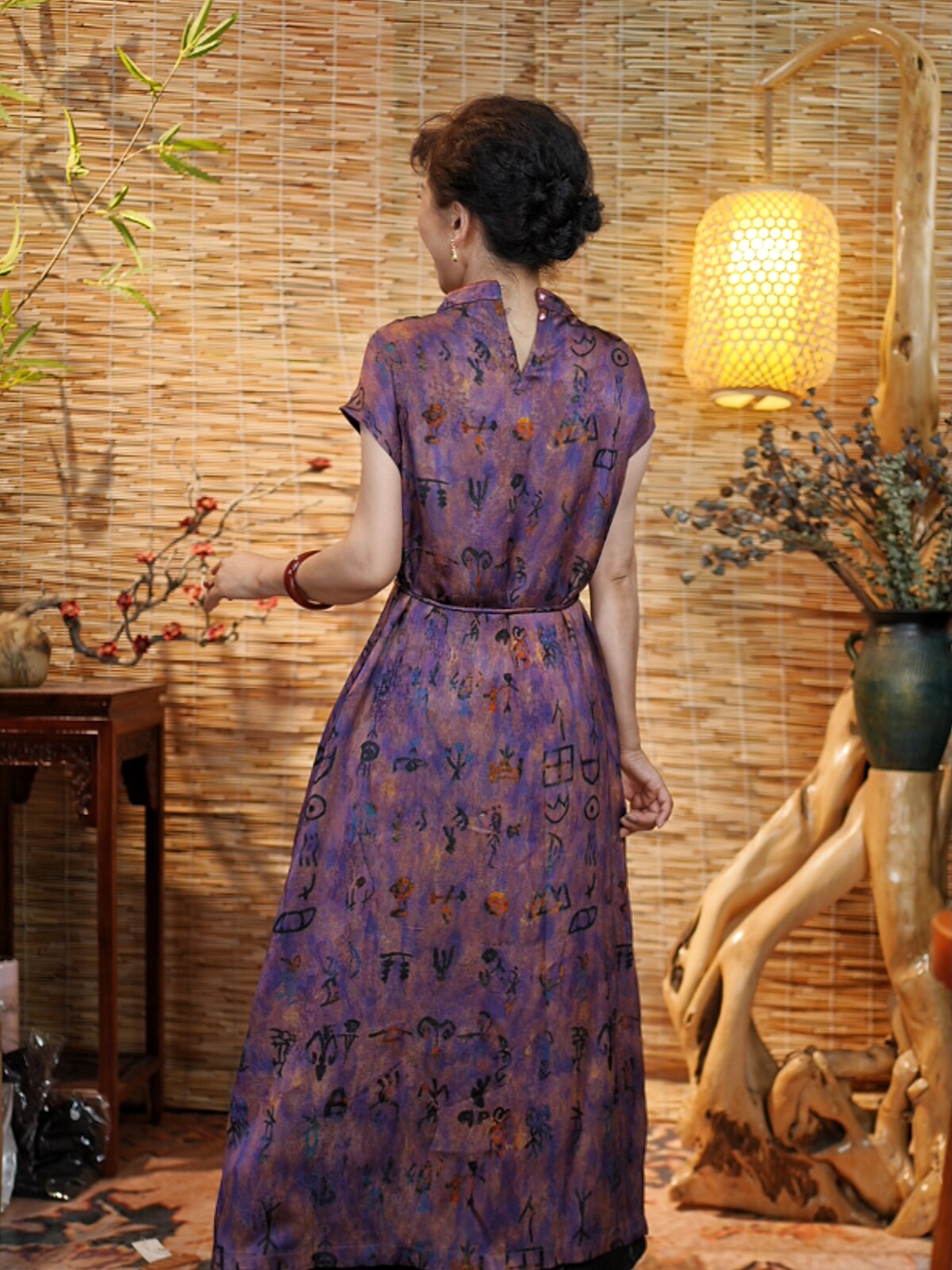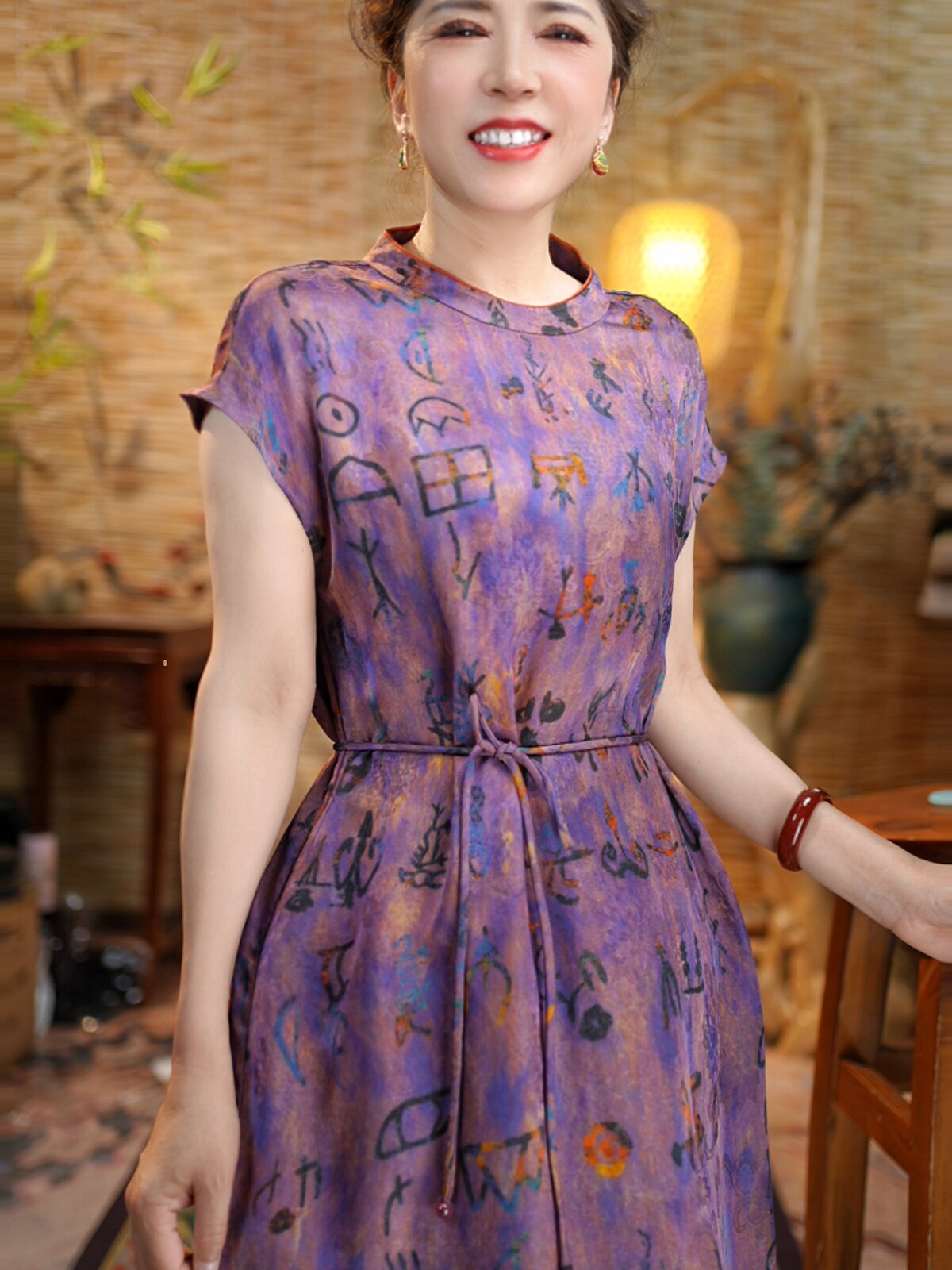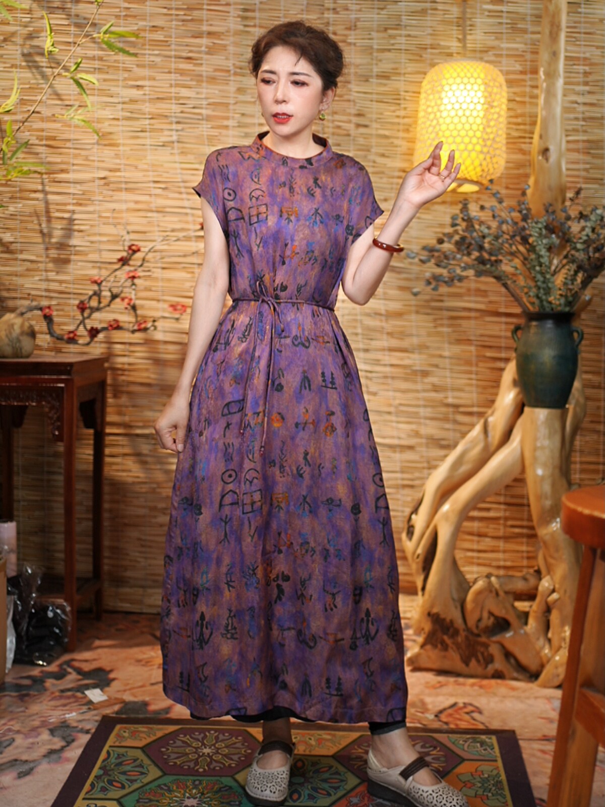 [Secret Purple Pattern] Slim Printed Retro Totem Dress Cheongsam Light Professional Style Waist Summer Jacquard