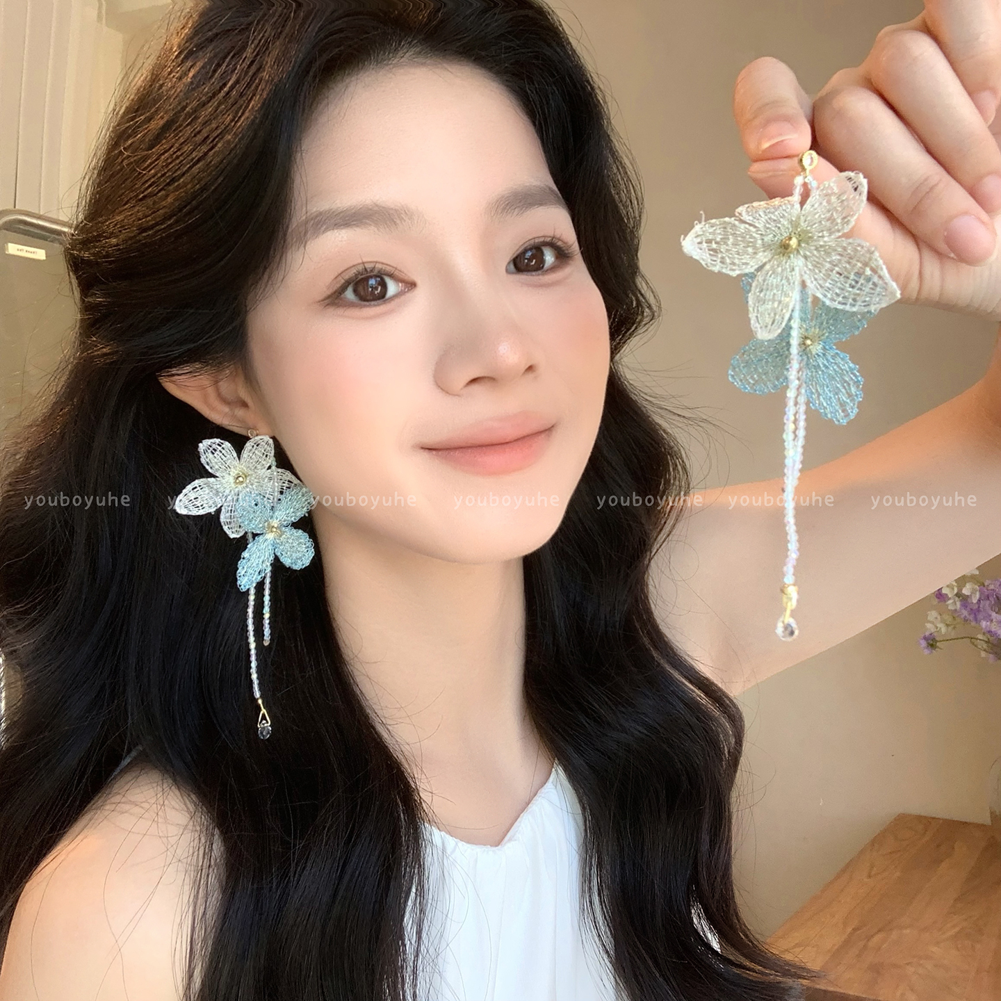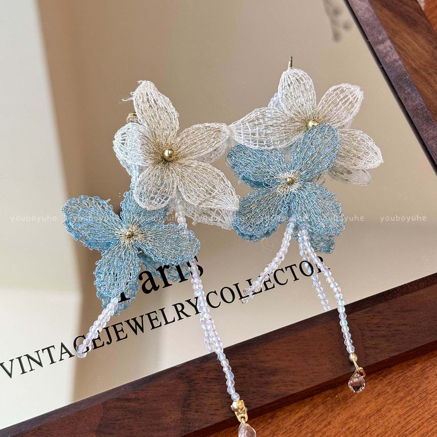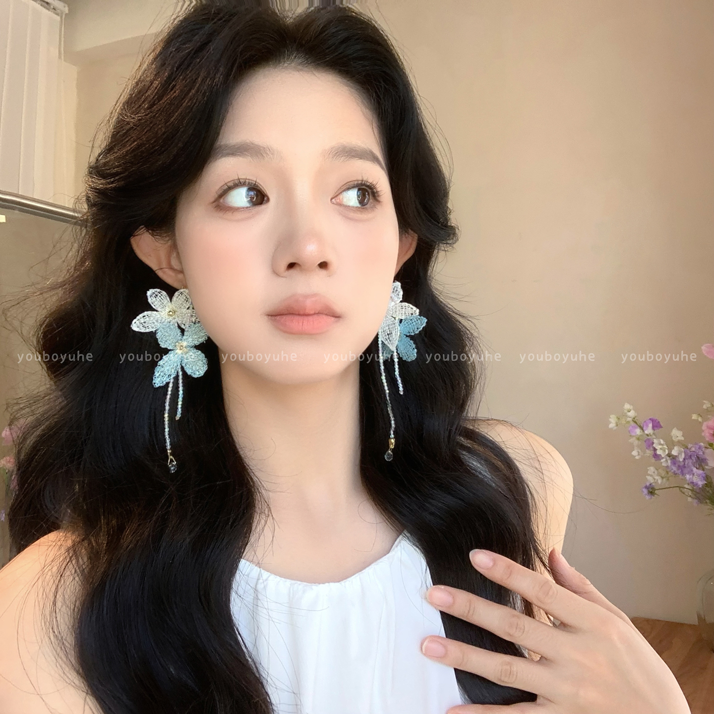 Handmade Embroidered Contrasting Color Flower Earrings for Women, Exaggerated Seaside Earrings, Autumn and Winter Vacation Style, Non-Pierced Ear Clips