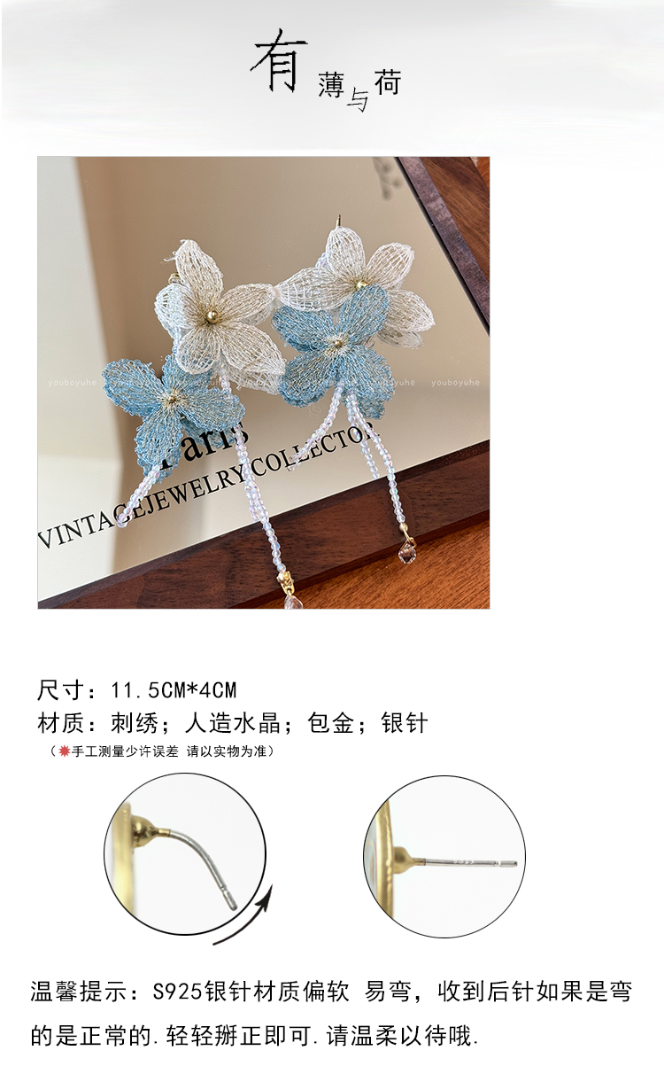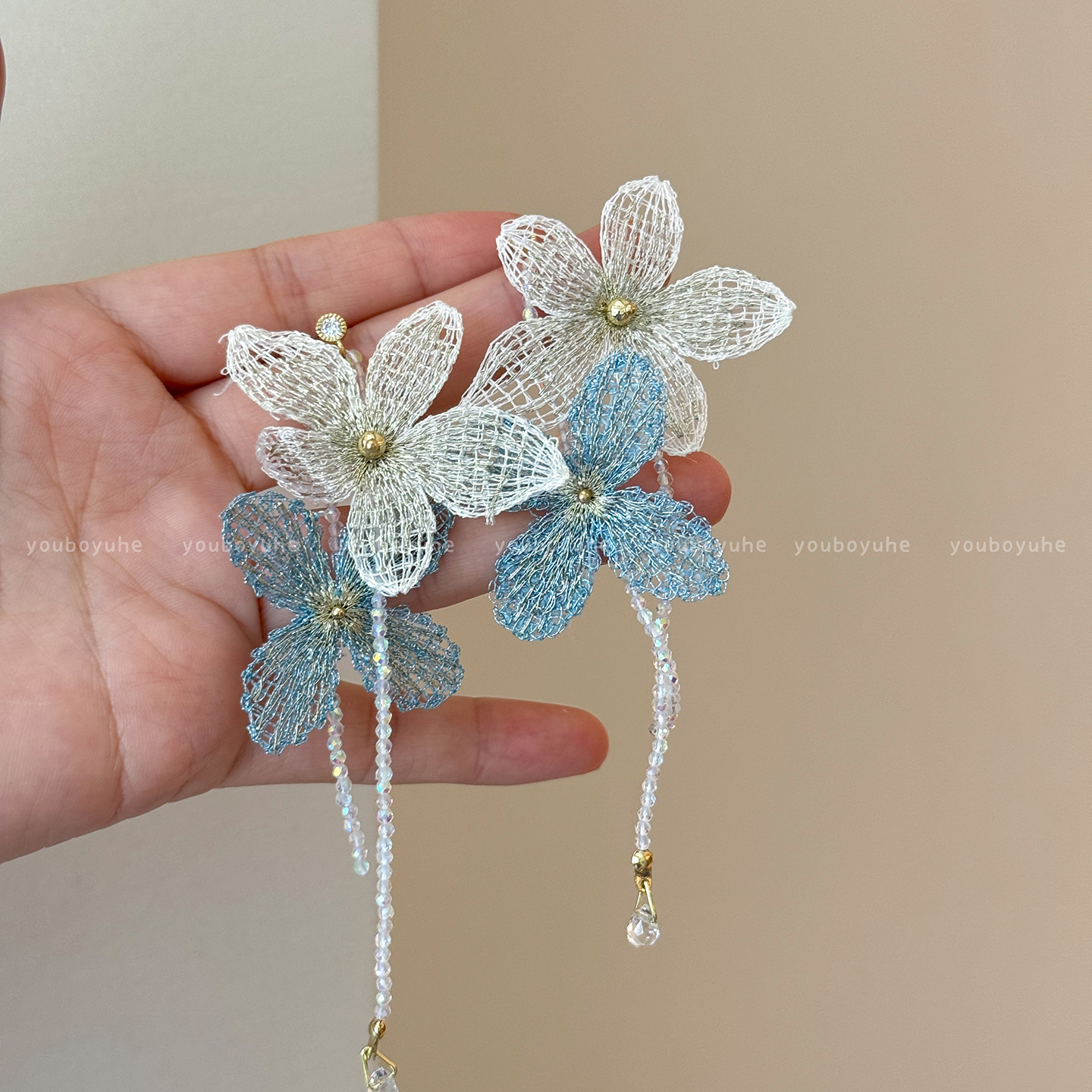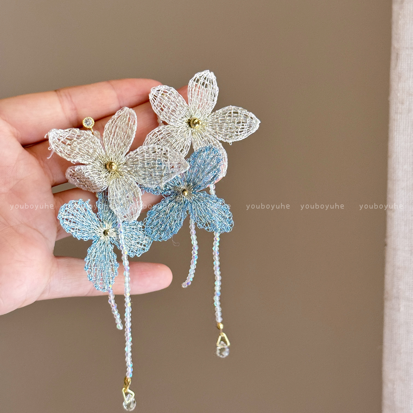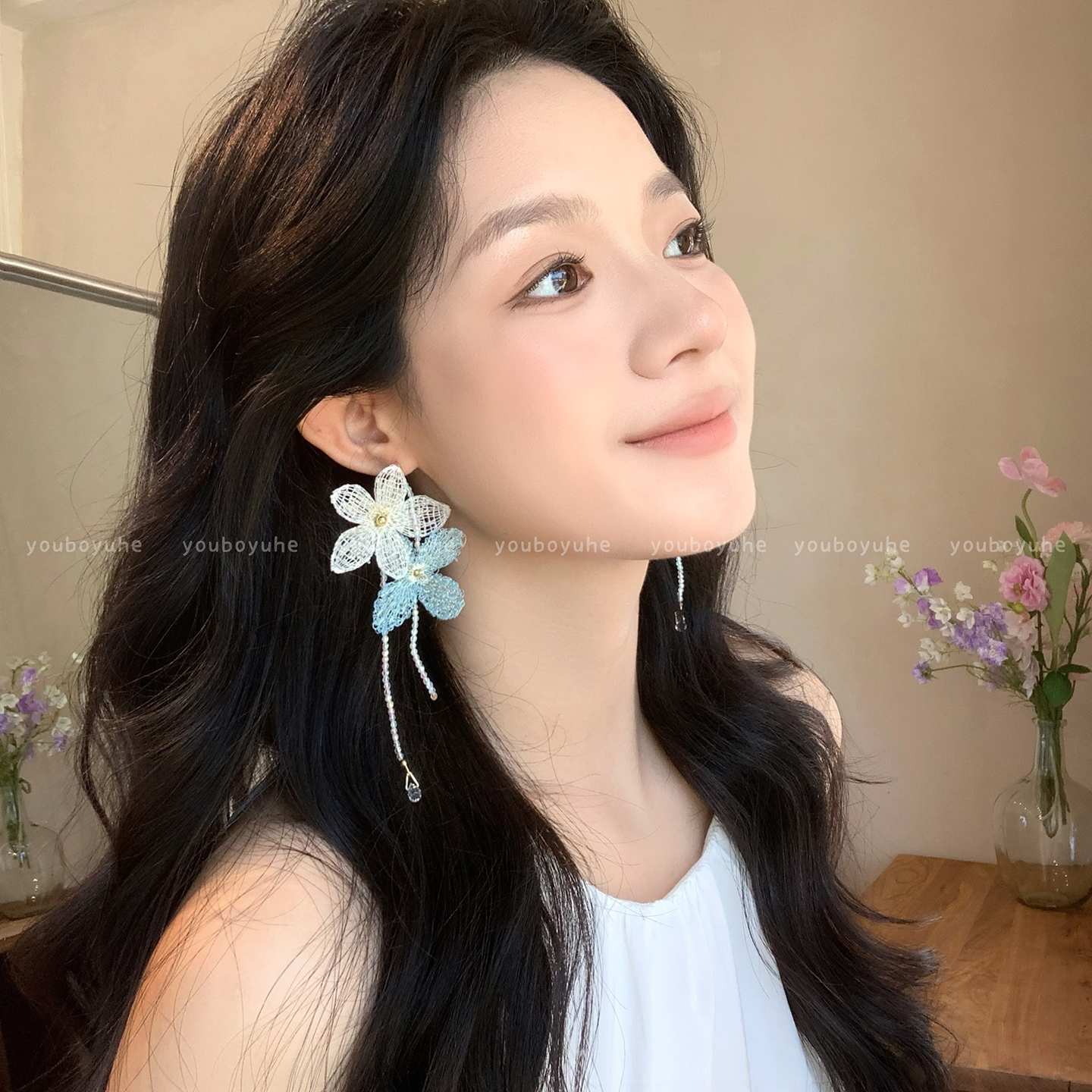 Handmade Embroidered Contrasting Color Flower Earrings for Women, Exaggerated Seaside Earrings, Autumn and Winter Vacation Style, Non-Pierced Ear Clips