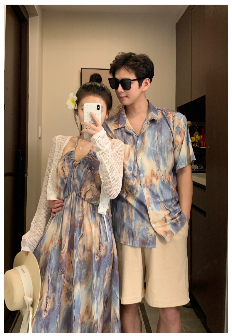 Beach Vacation Couple Outfits: Summer Tie-Dye Short-Sleeve Shirt, Halter Neck Long Dress, French-Style Dress, One Top and One Skirt