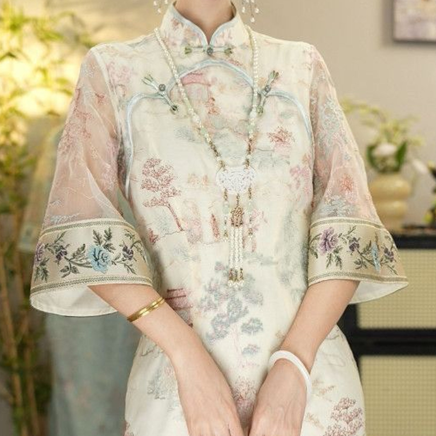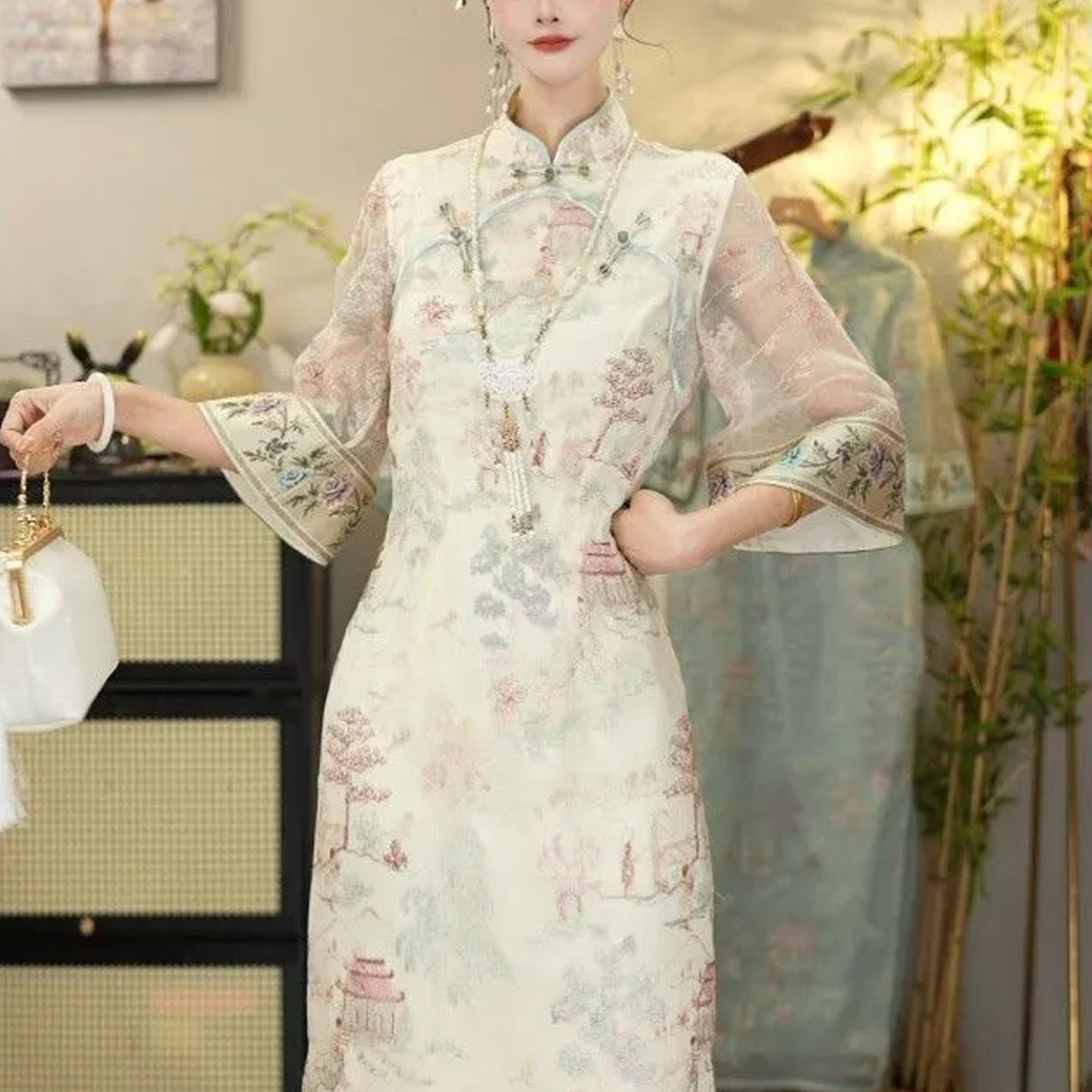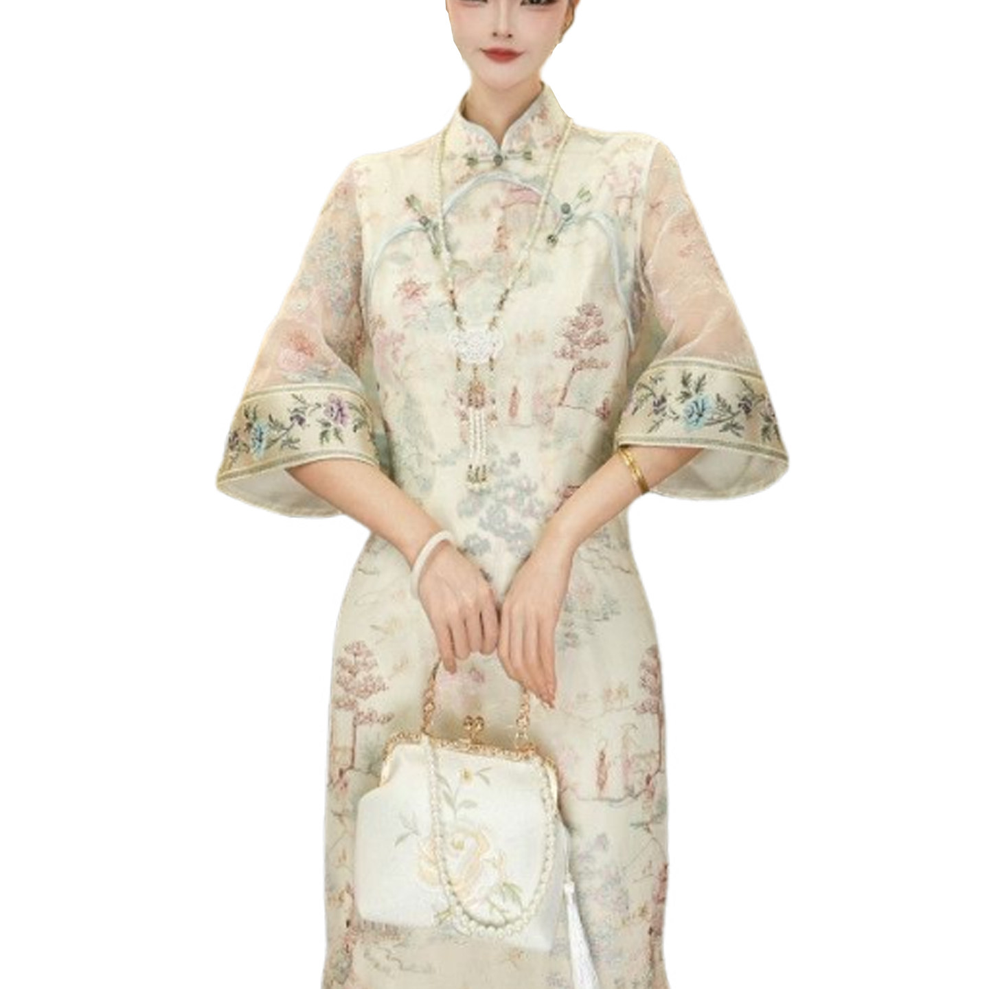 New Chinese-Style Improved Cheongsam Dress with Stand Collar and Button Closure for Women, Summer New Model, Elegant and Slimming, Three-Quarter Sleeve Long Dress