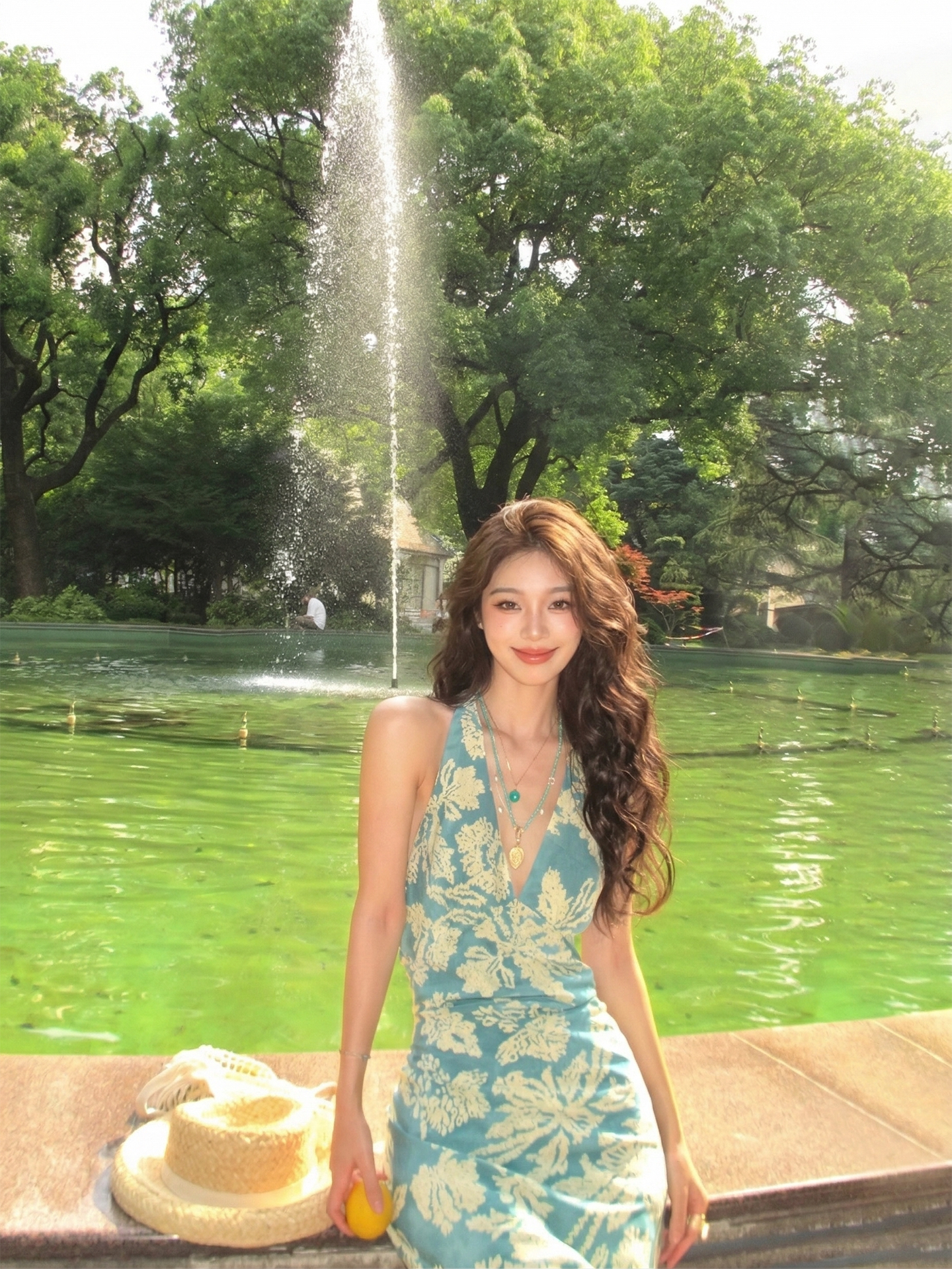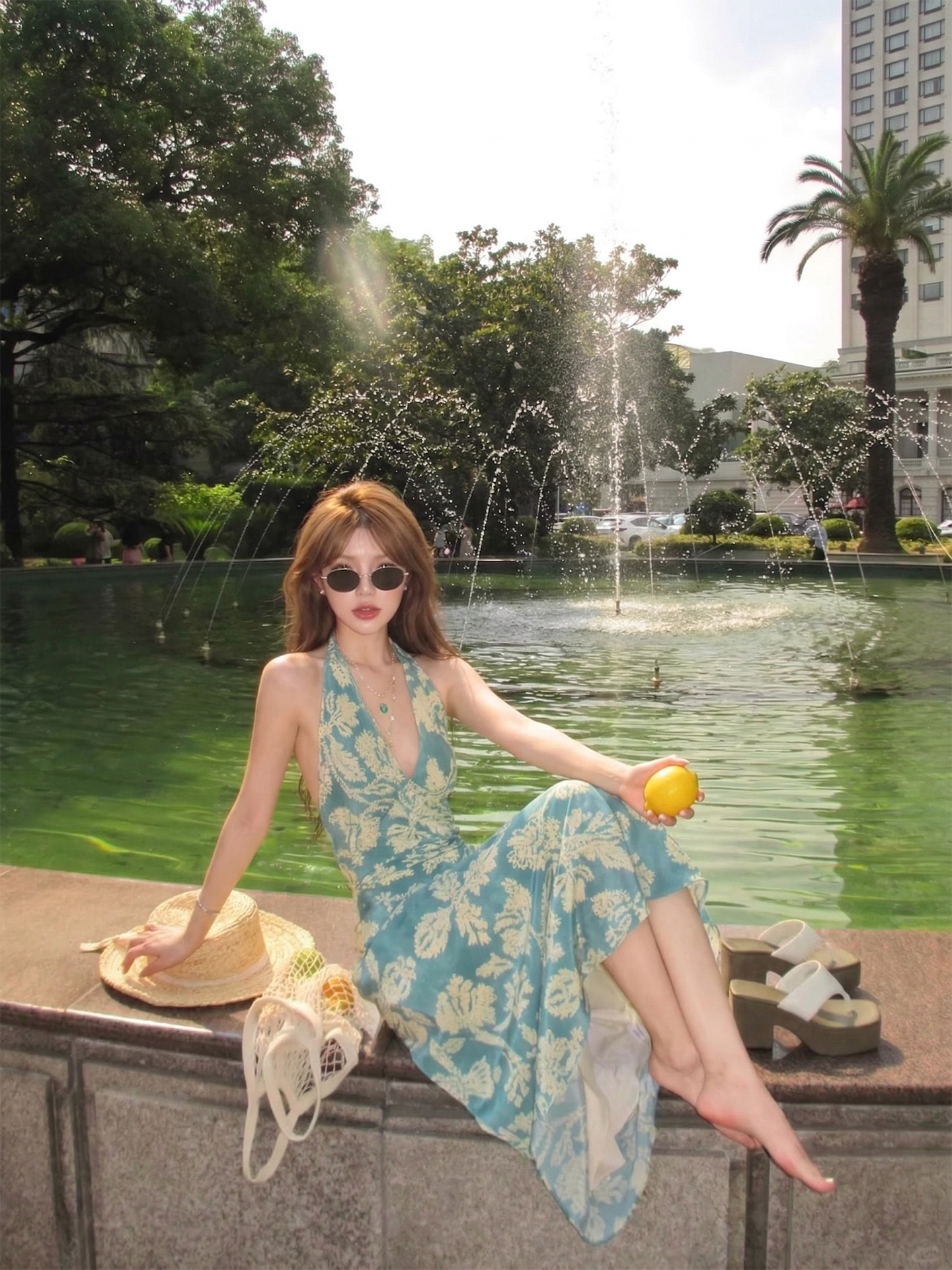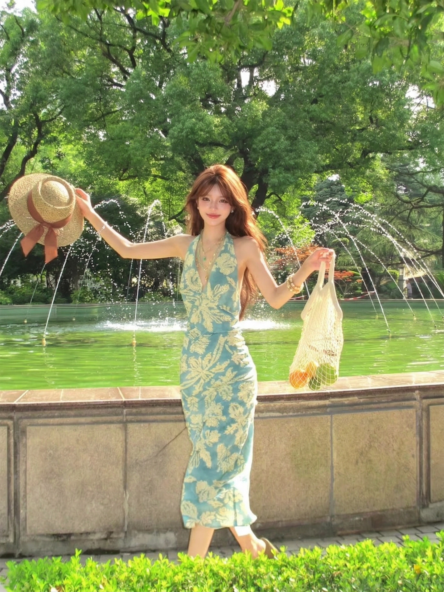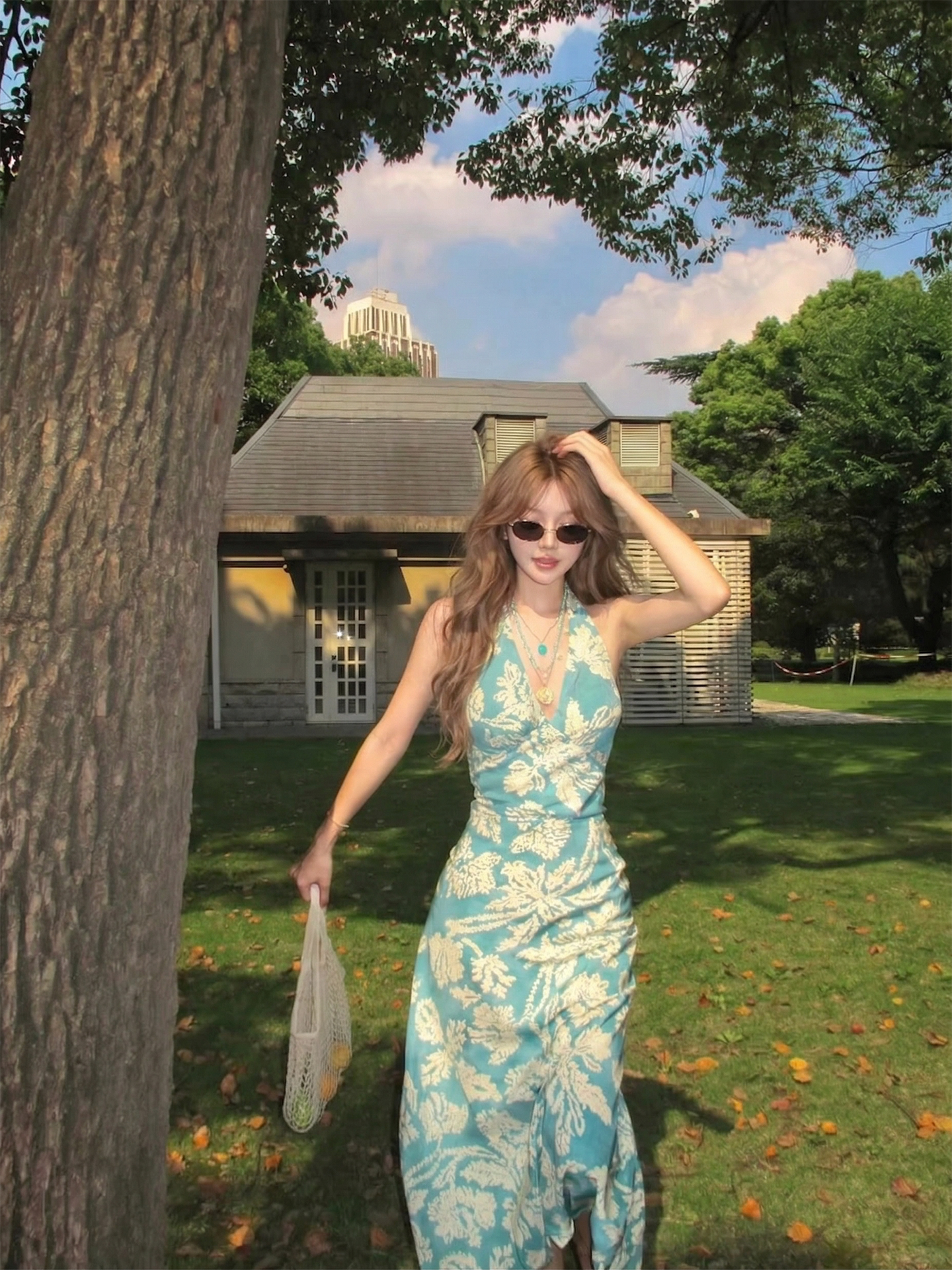 Seaside Super Pretty Peacock Blue V-Neck Floral Halter Neck Spaghetti Strap Dress for Women, Summer Southern French Vacation Style Backless Long Dress