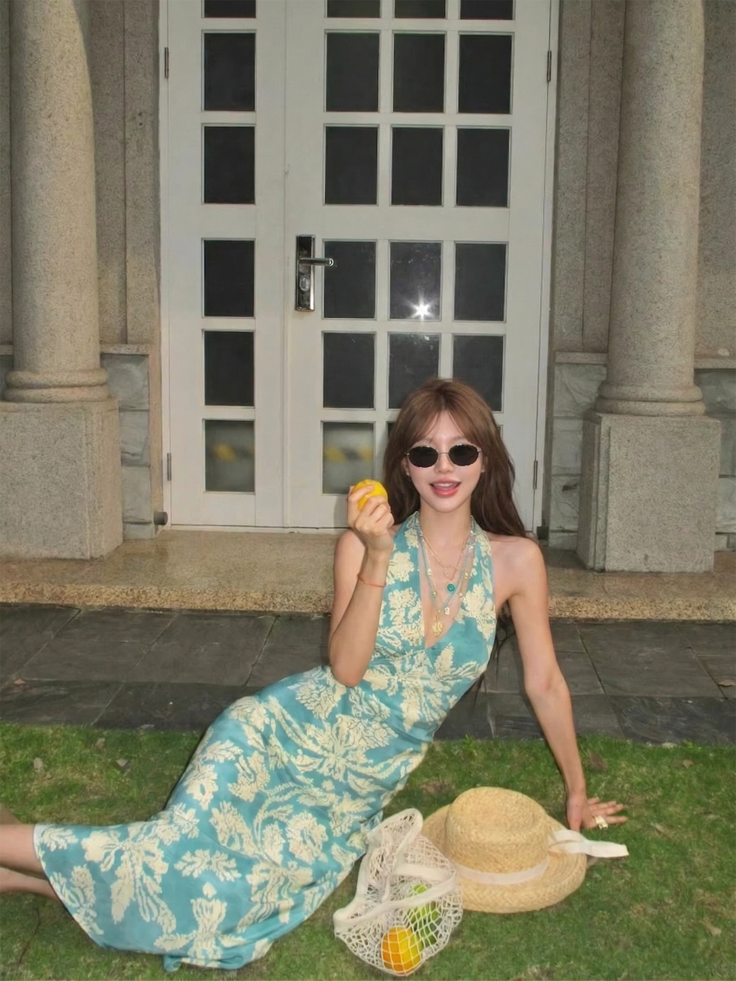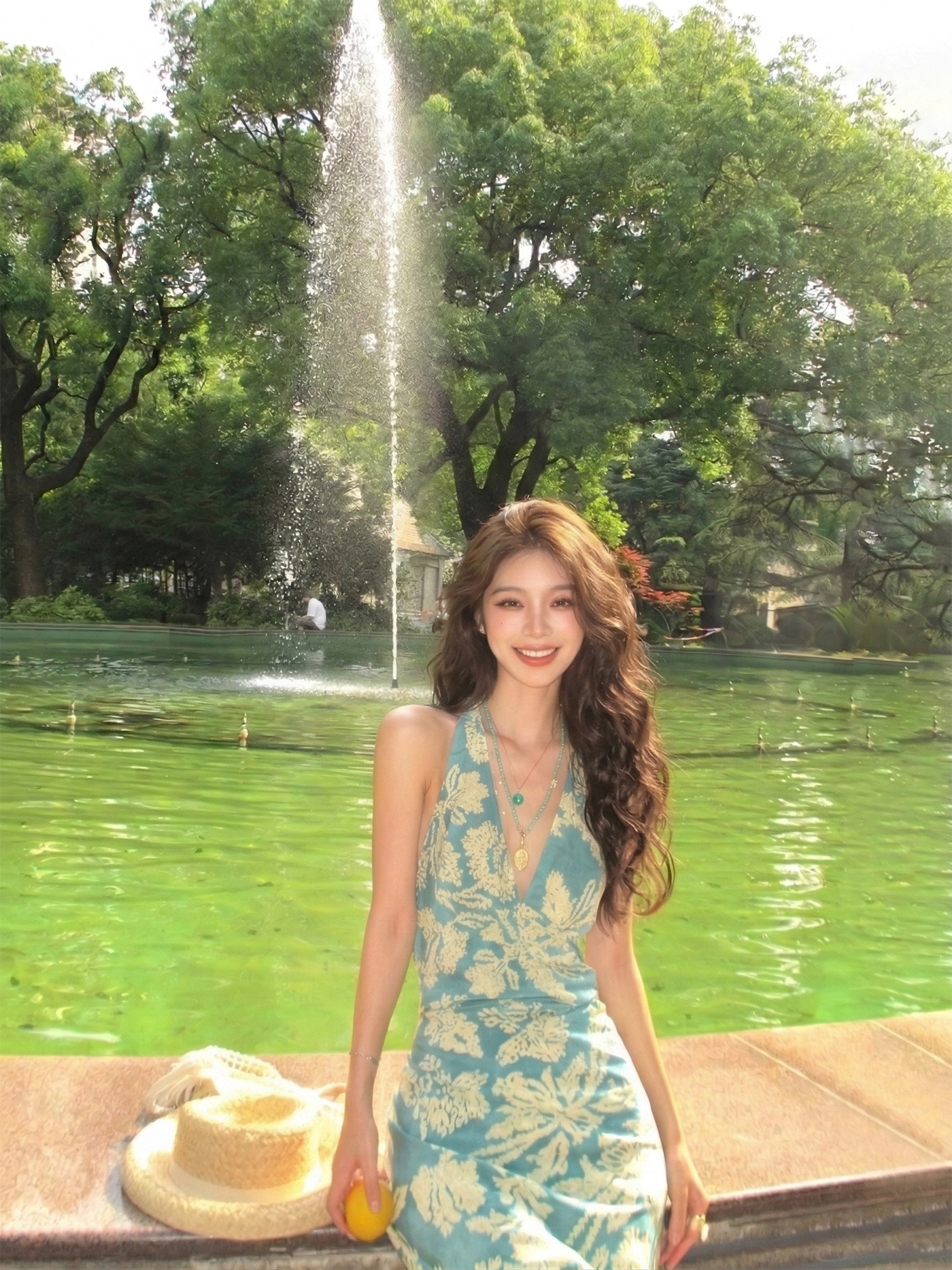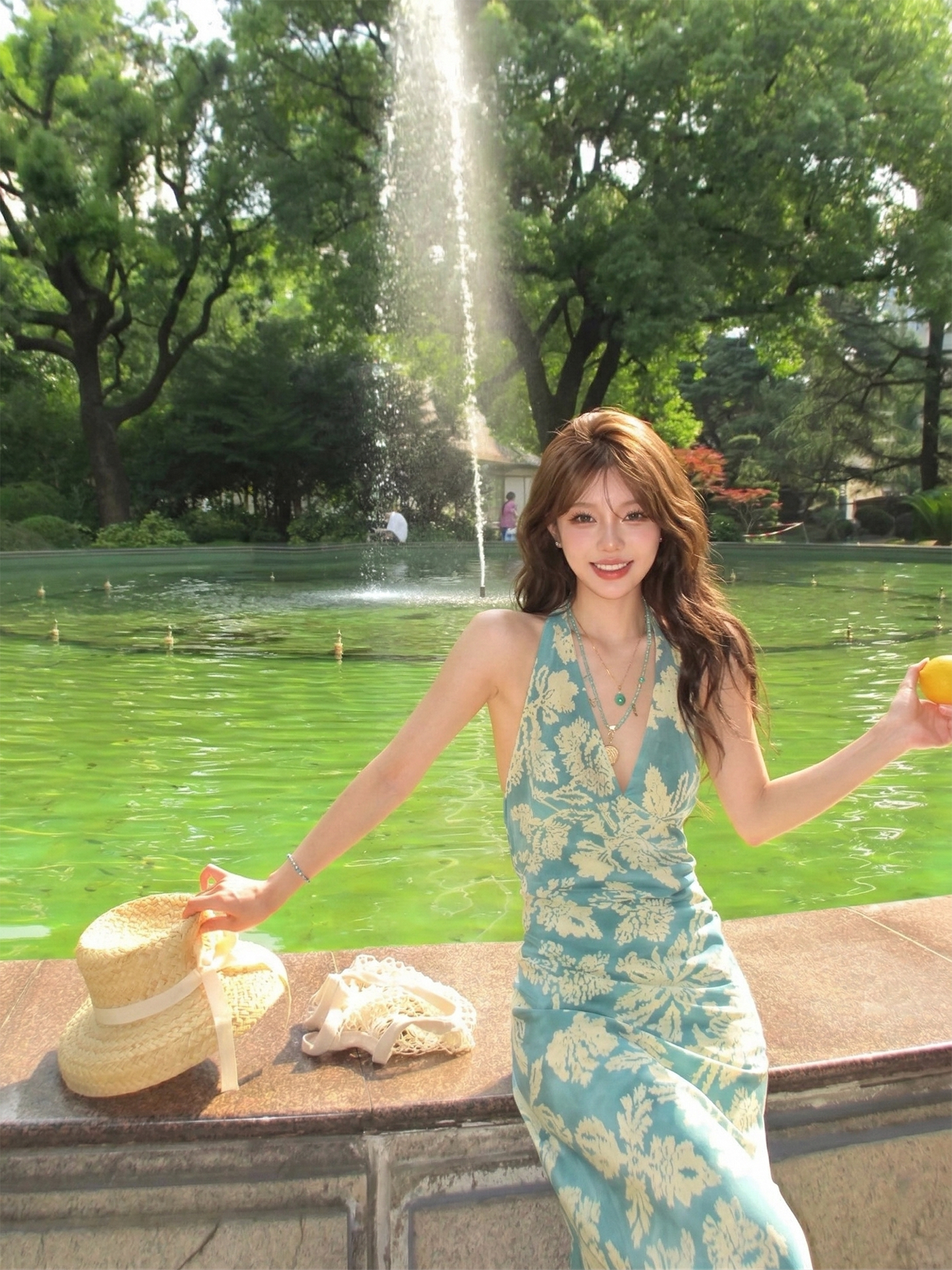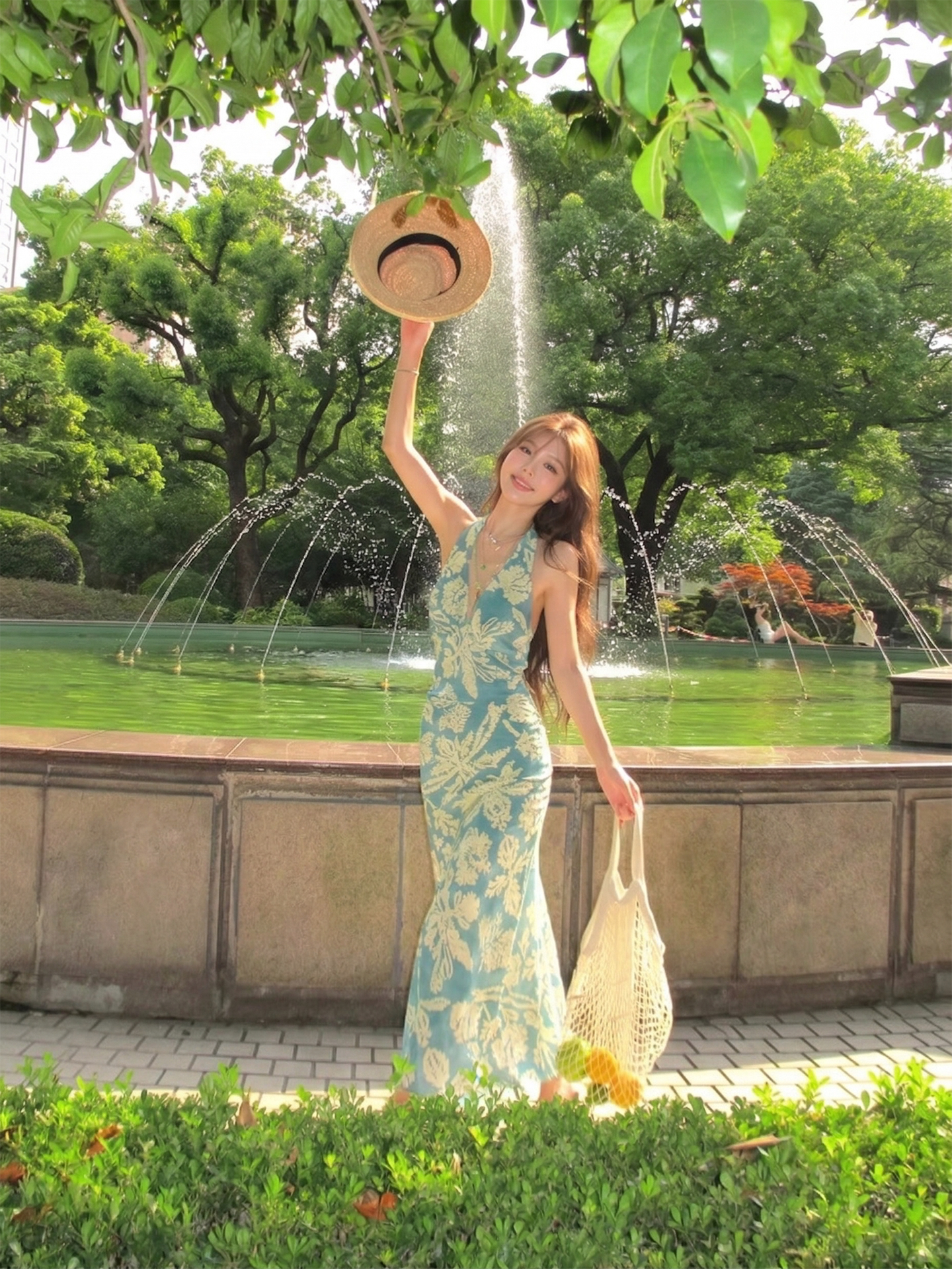 Seaside Super Pretty Peacock Blue V-Neck Floral Halter Neck Spaghetti Strap Dress for Women, Summer Southern French Vacation Style Backless Long Dress