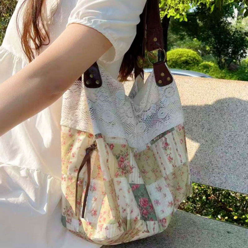 Forest-Style Vintage Lace Floral Plaid Patchwork Fabric Bag 2025 New Casual Versatile Shoulder Tote Commuter Bag