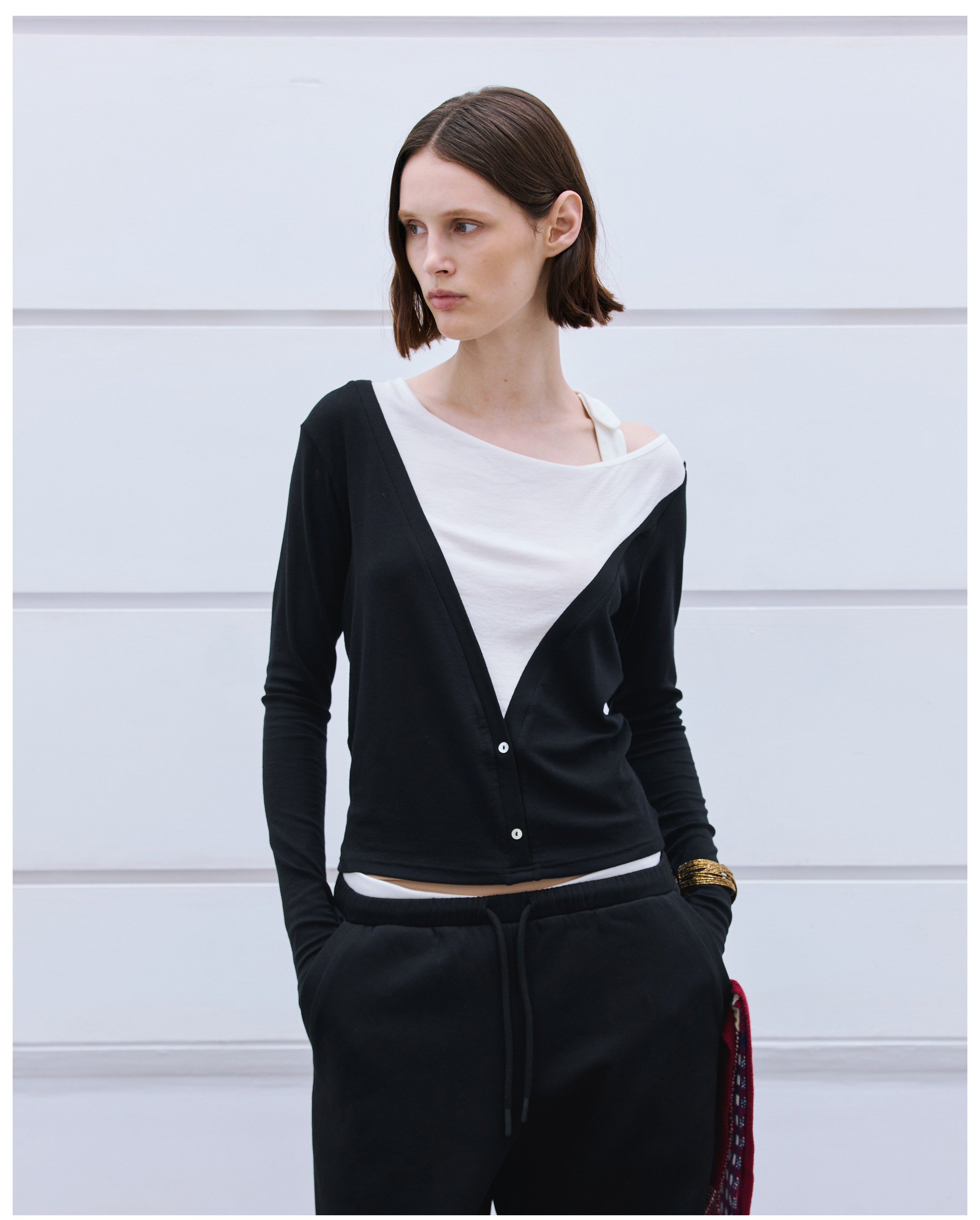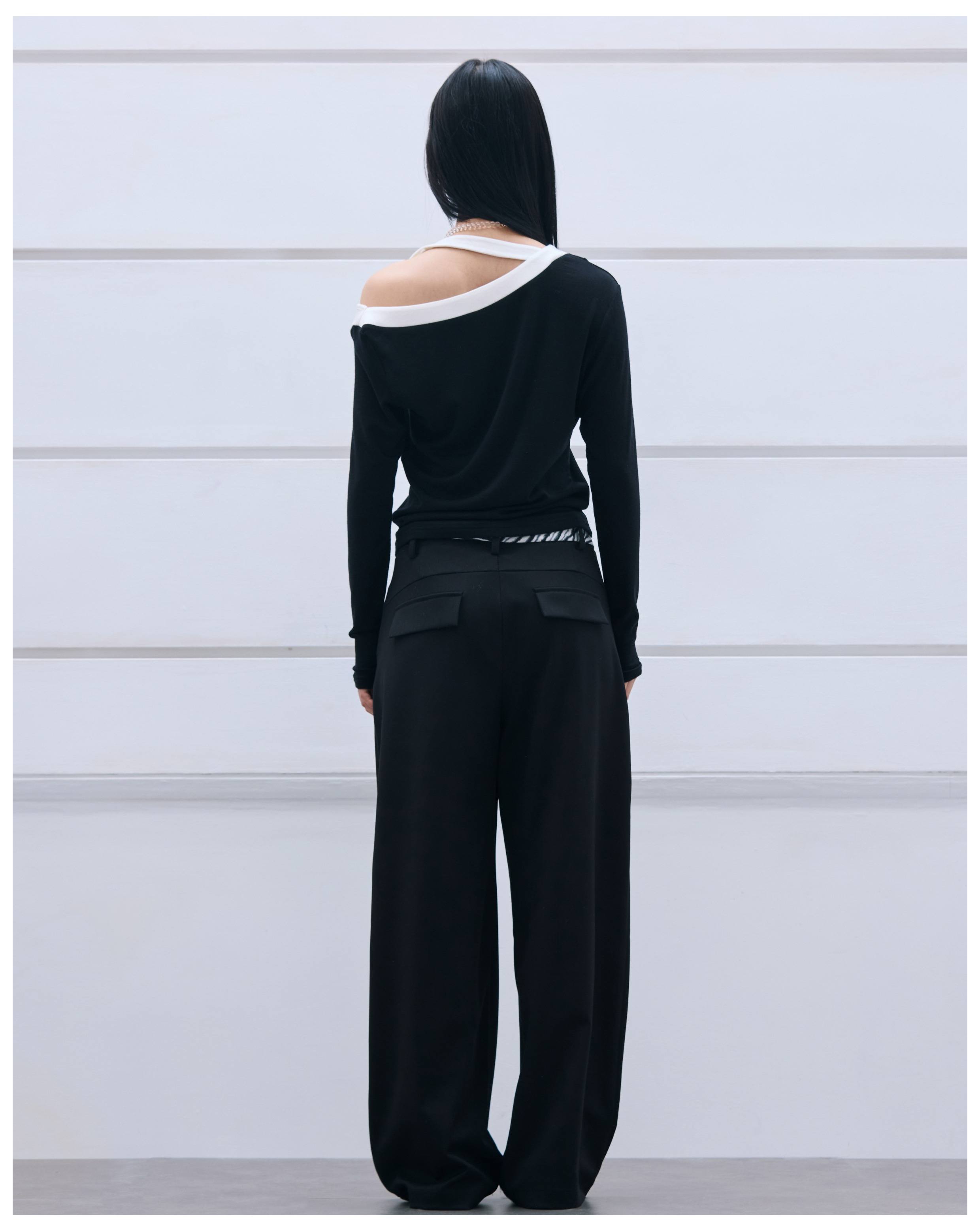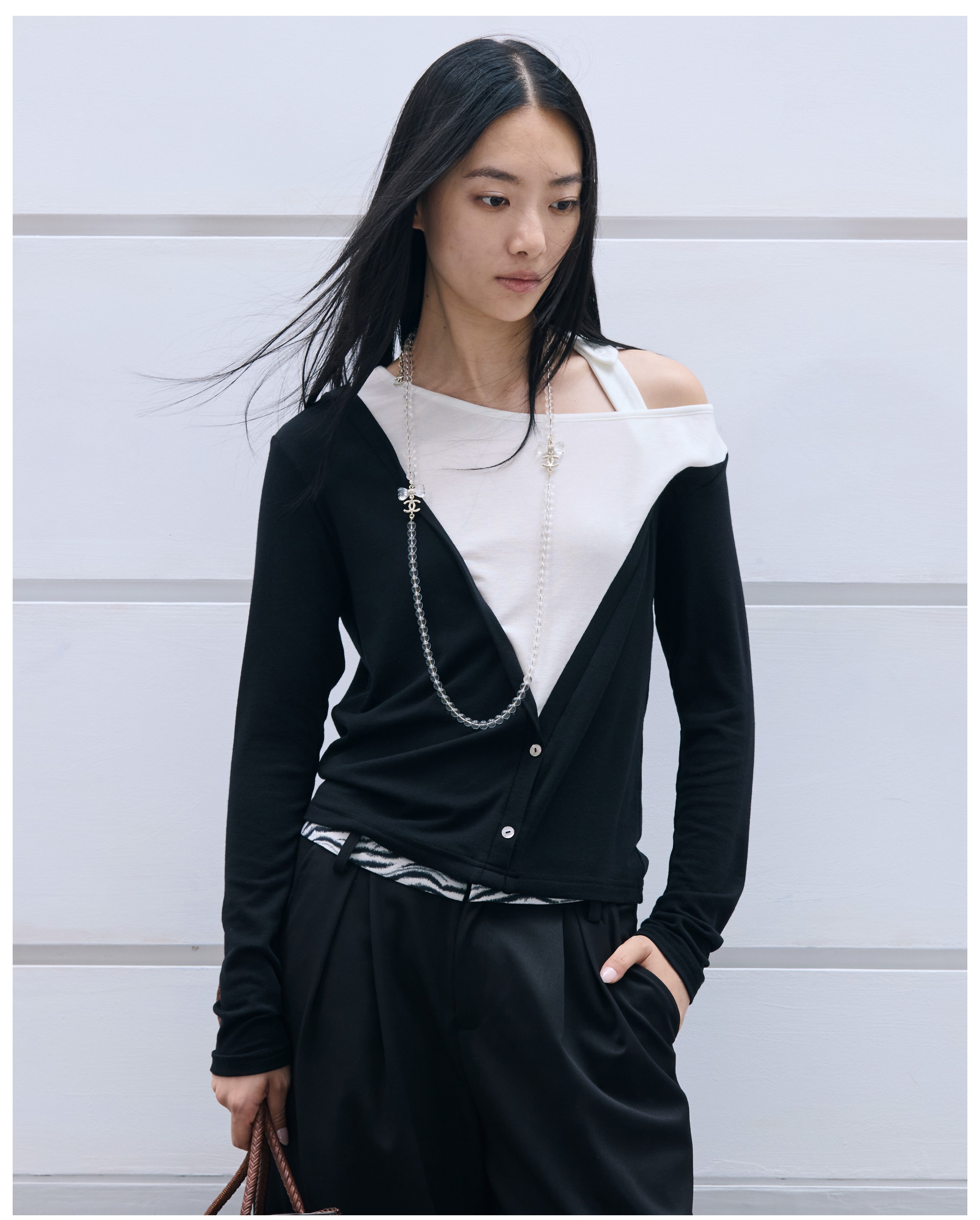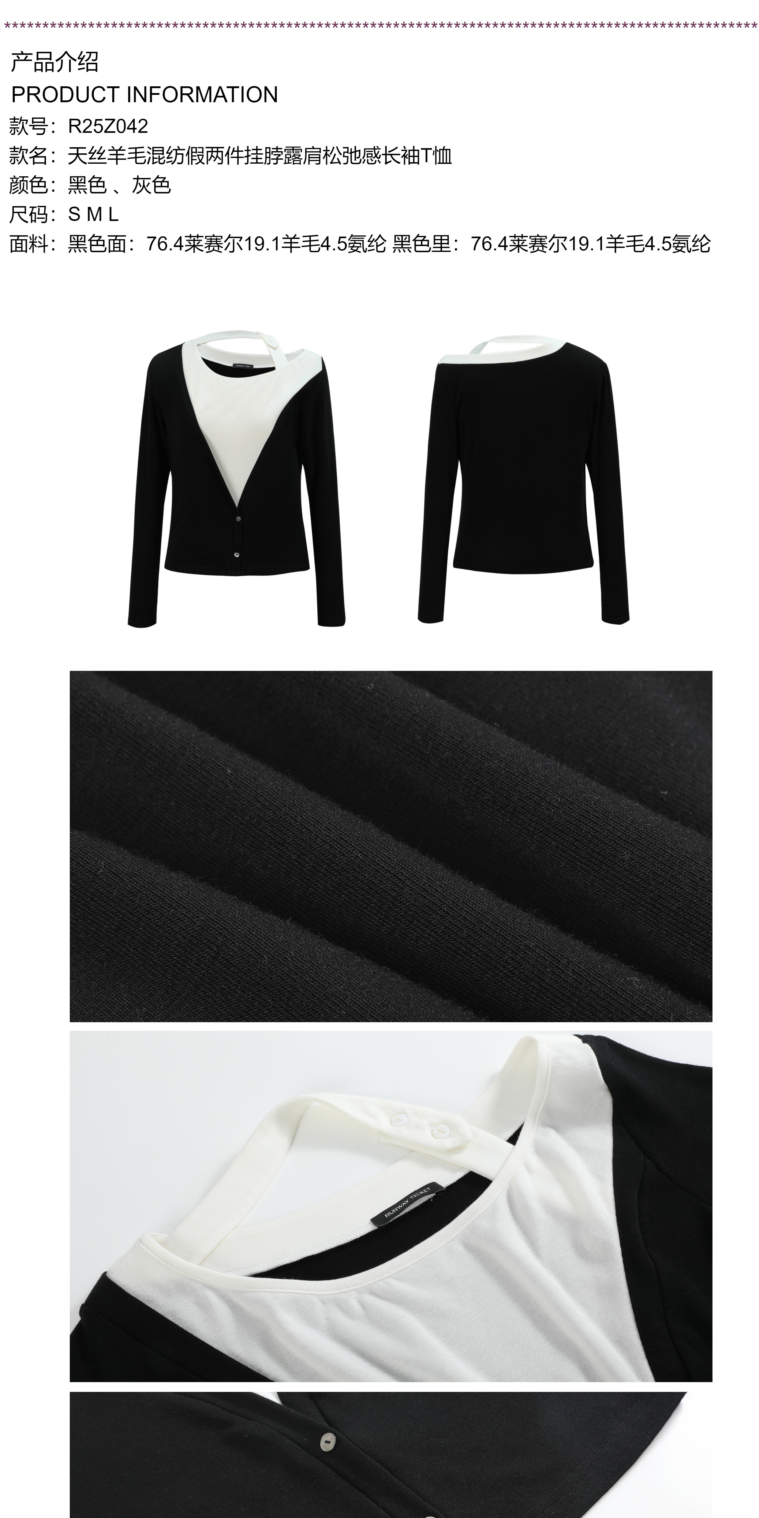 Runway Ticket 【Zhang Yifan's Style】Tencel Wool Faux Two-Piece Halter Neck Off-Shoulder Long-Sleeve T-Shirt for Women