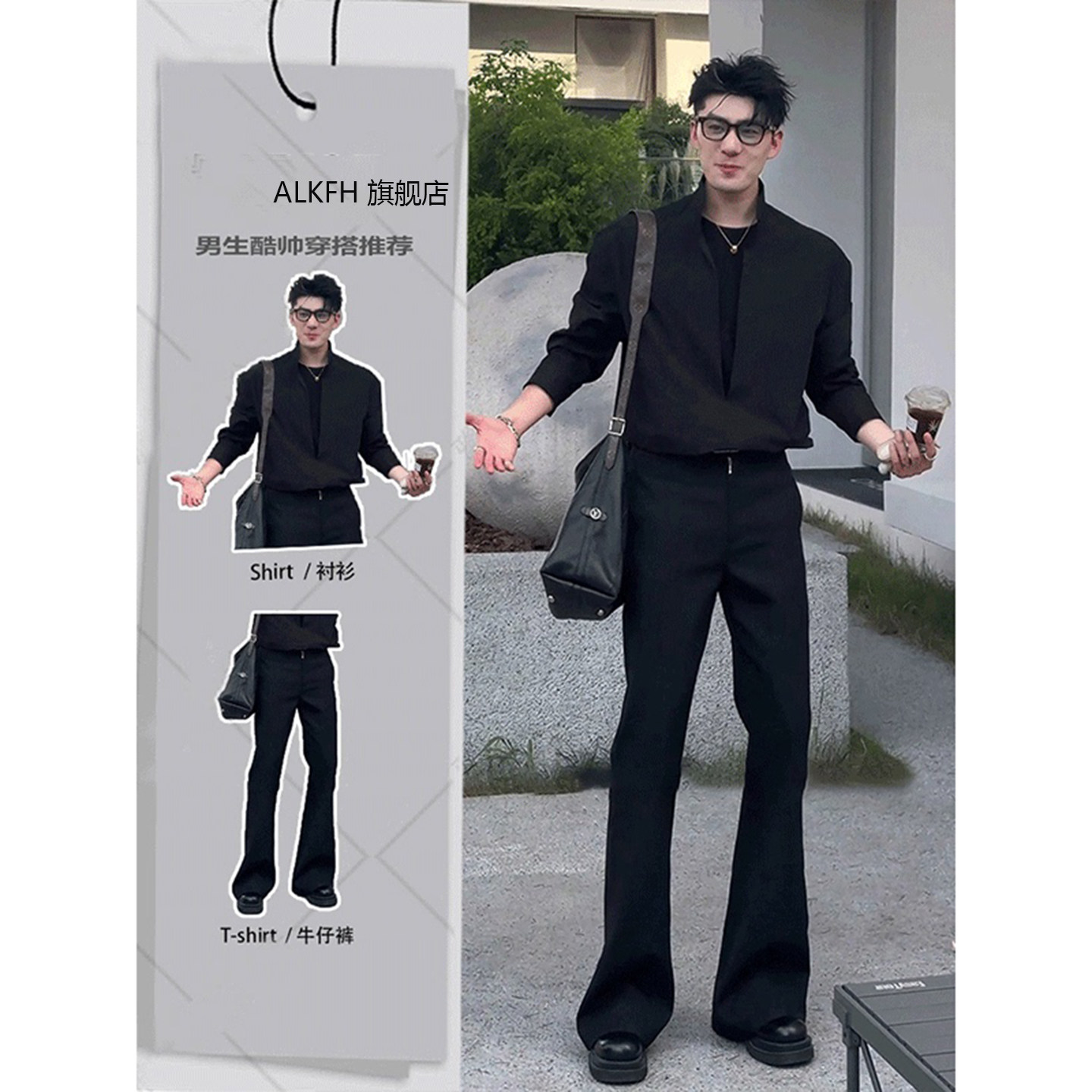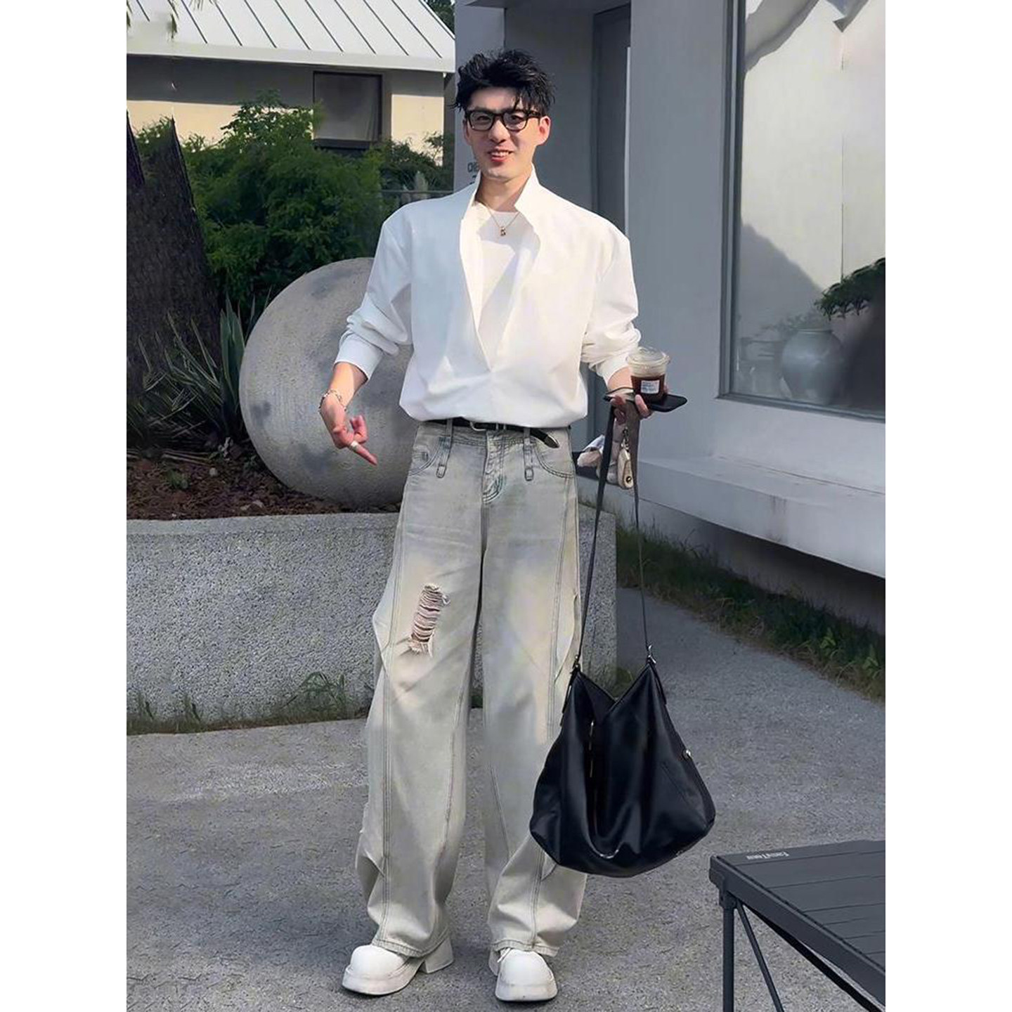 Old Money Style Fake Two-Piece Ice Silk Casual Suit for Men, Summer Cool and Handsome Outfit, Complete Set with American-Style Workwear Ripped Pants