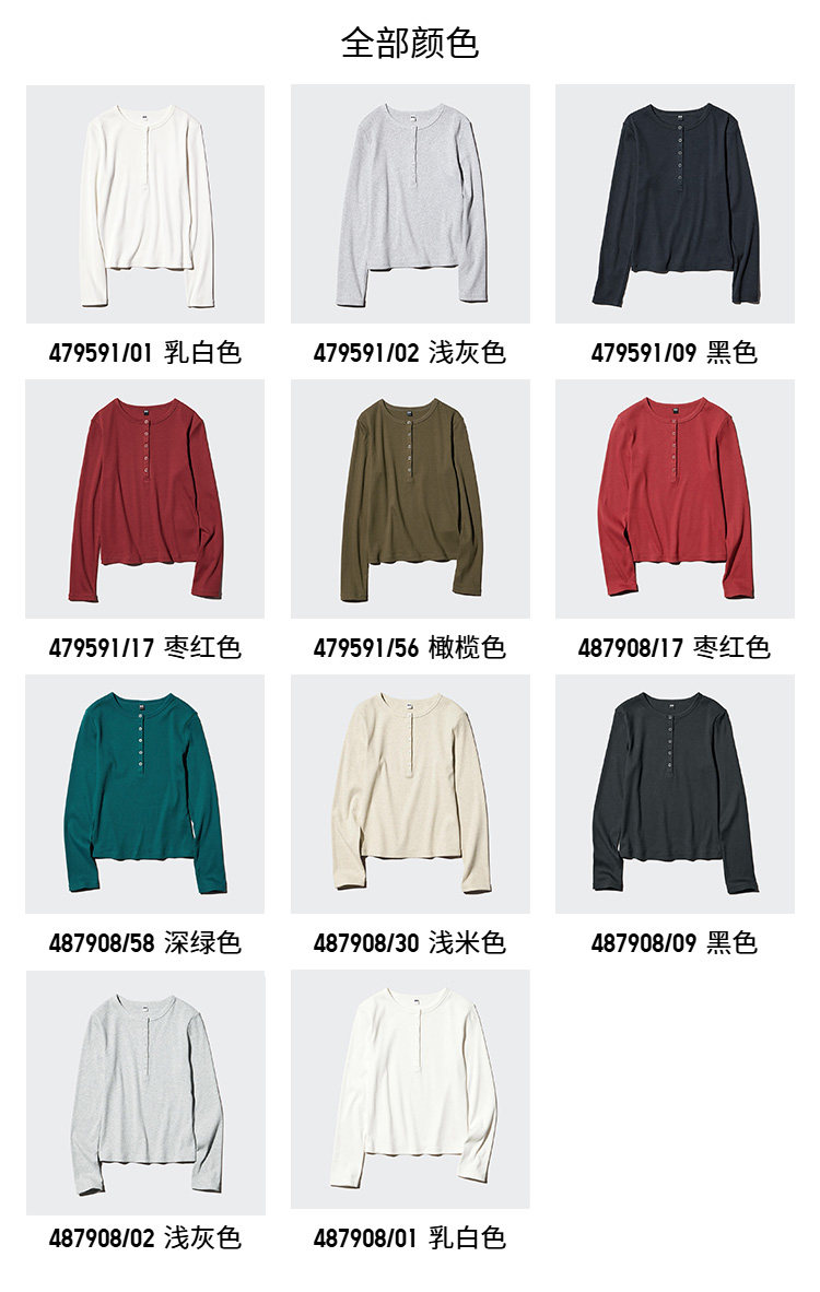 Uniqlo Women's Ribbed Henley Collar T-Shirt/Long Sleeve Slim Fit Short Base Layer 479591 487908