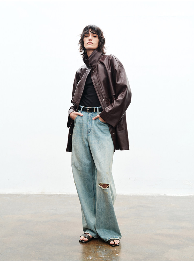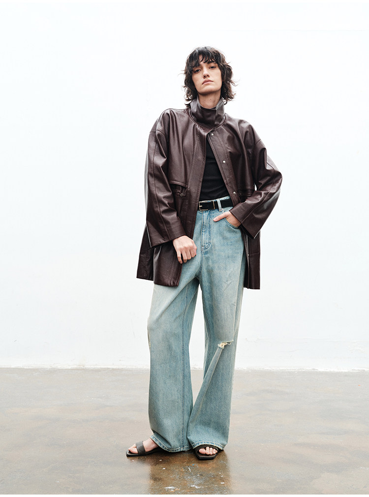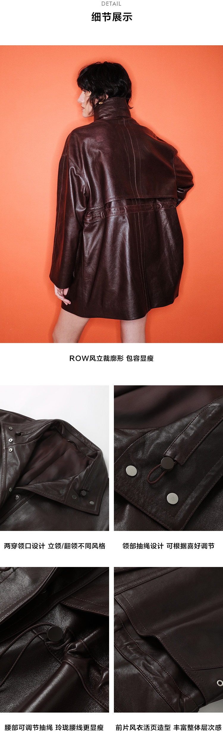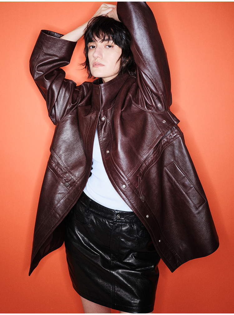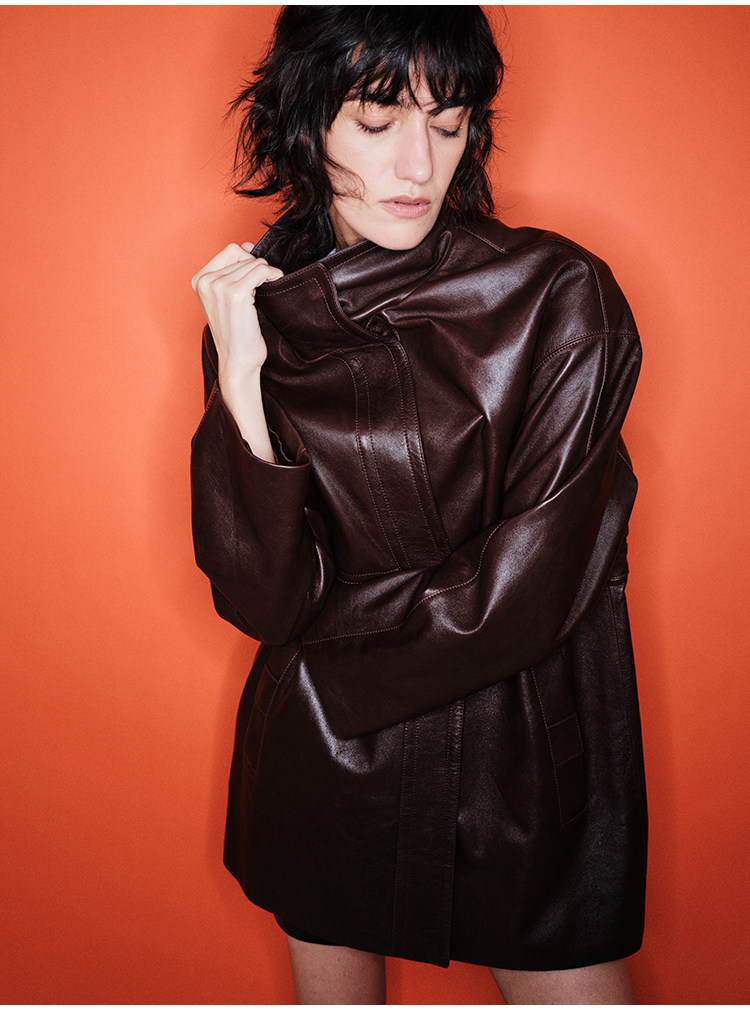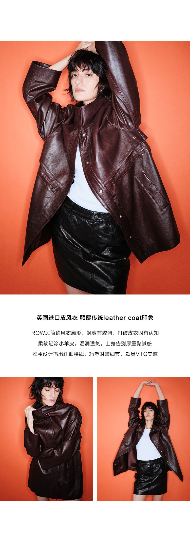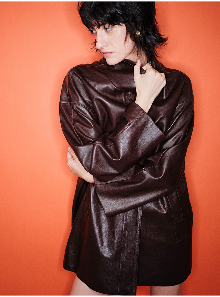 Ayuko|Vegetable-Tanned Oil-Waxed Lambskin, Pleated Waist, Retro-Modern Mid-Length Soft Leather Trench Coat