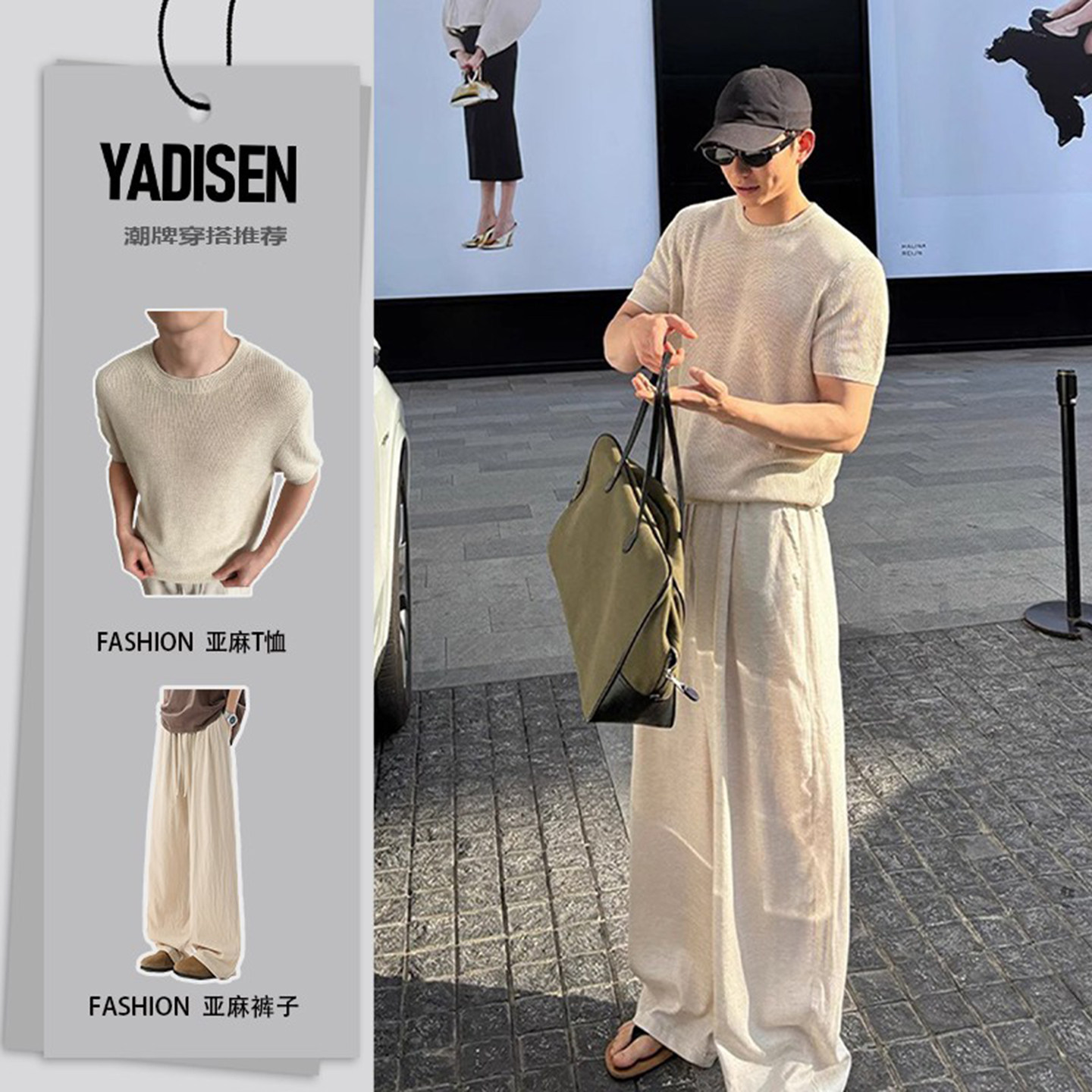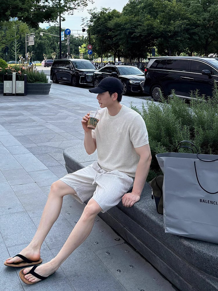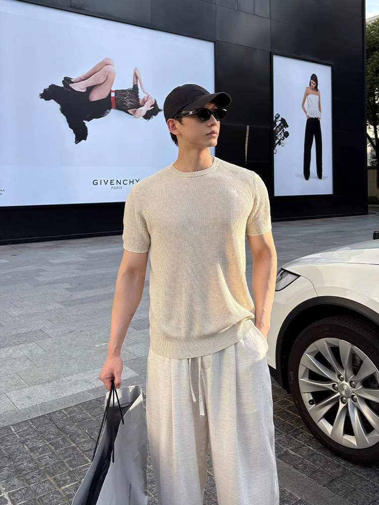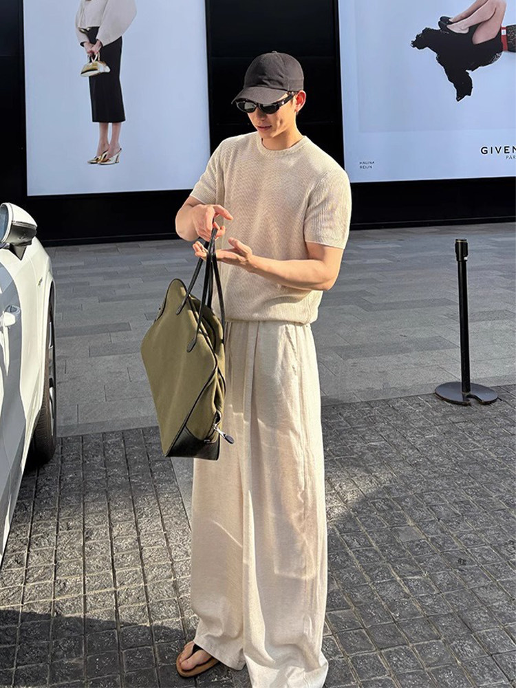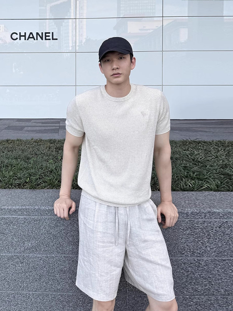 Apricot-Colored Knitted Short-Sleeve T-Shirt for Men, Lightweight and Breathable for Summer, Paired with a Set of Linen Pants in a Classic Style