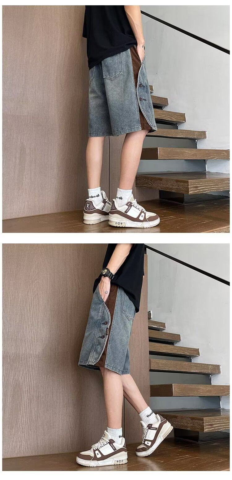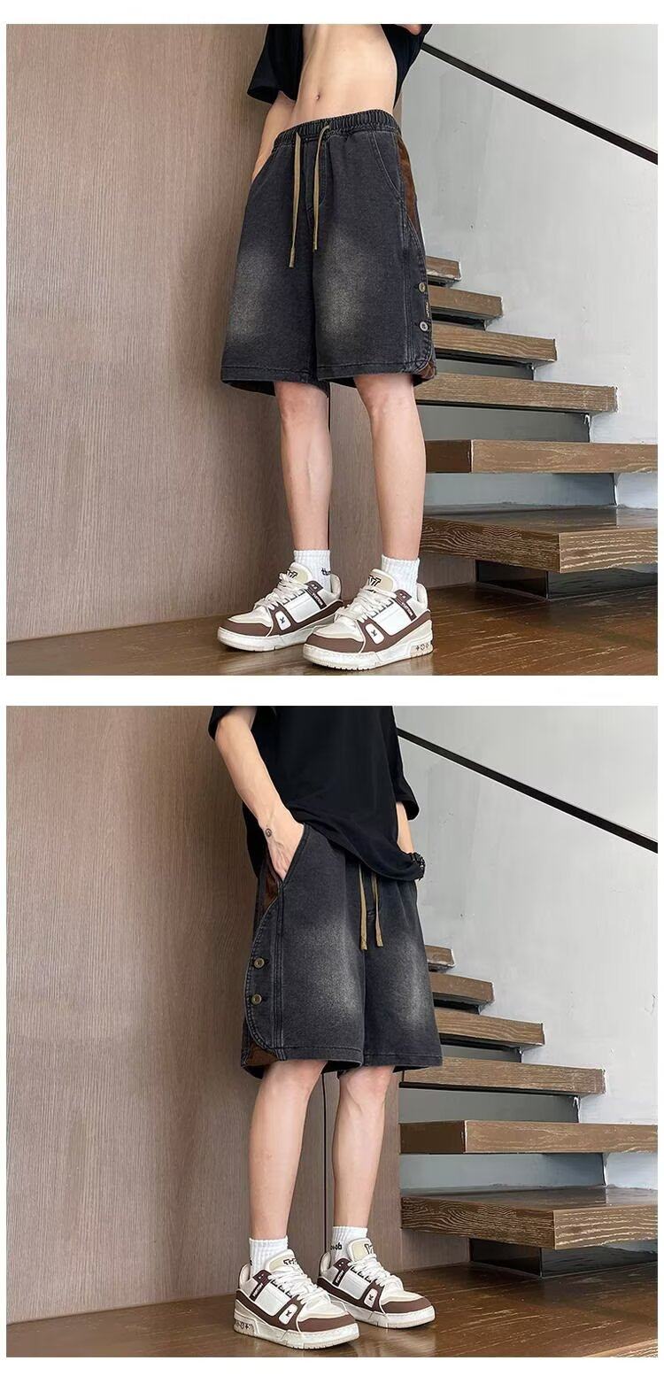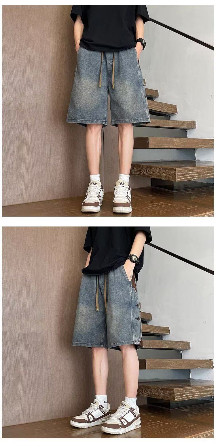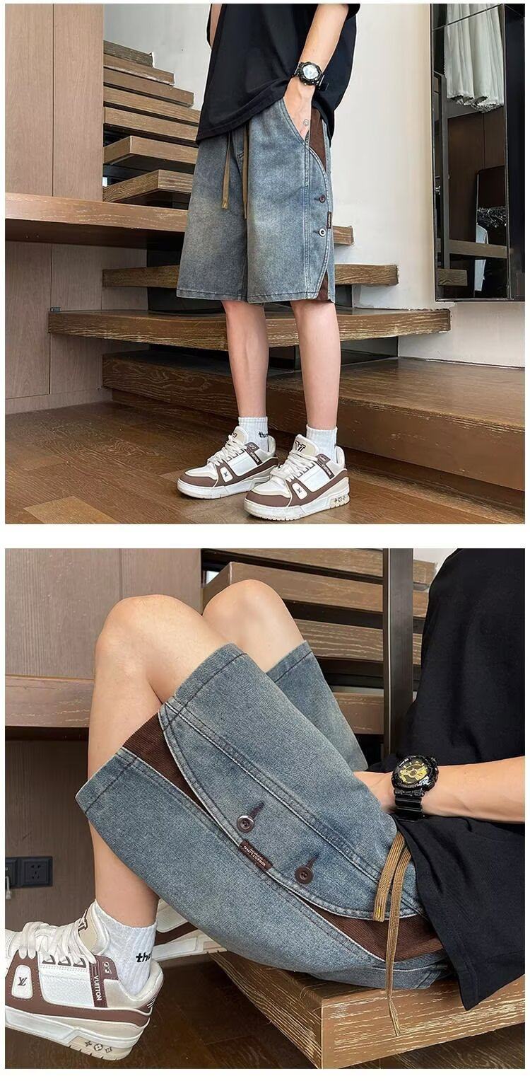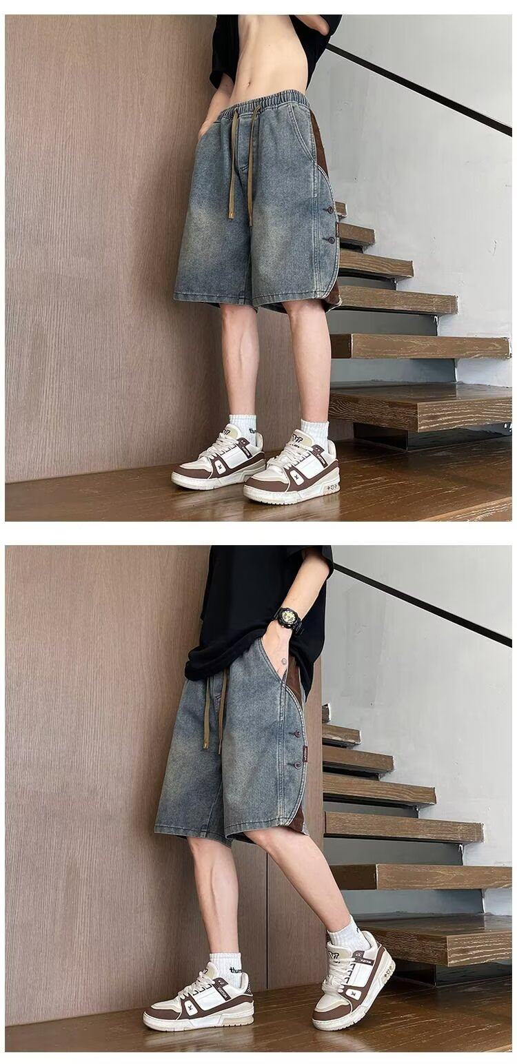 American Retro Denim Shorts for Men, Summer Thin Loose Trendy Brand Patchwork Five-Point Shorts, Casual Cool Mid-Length Pants