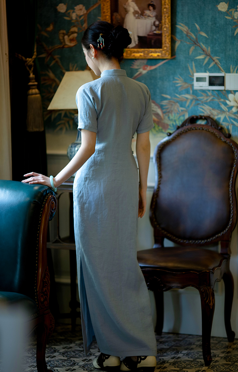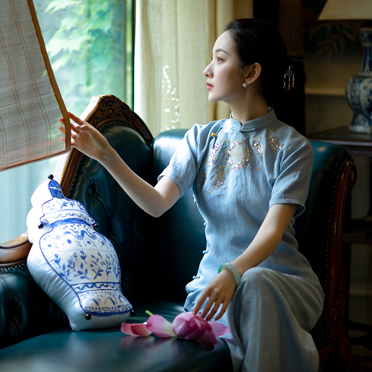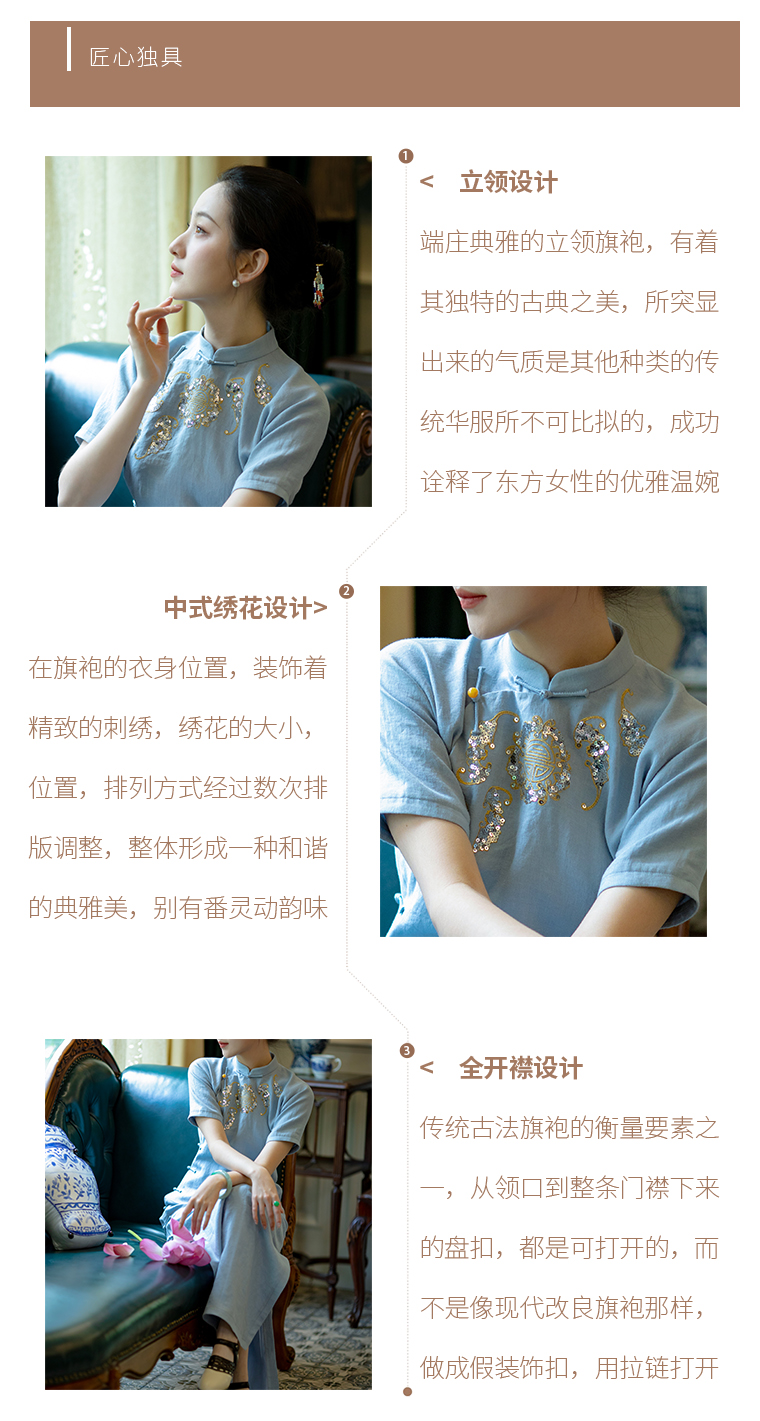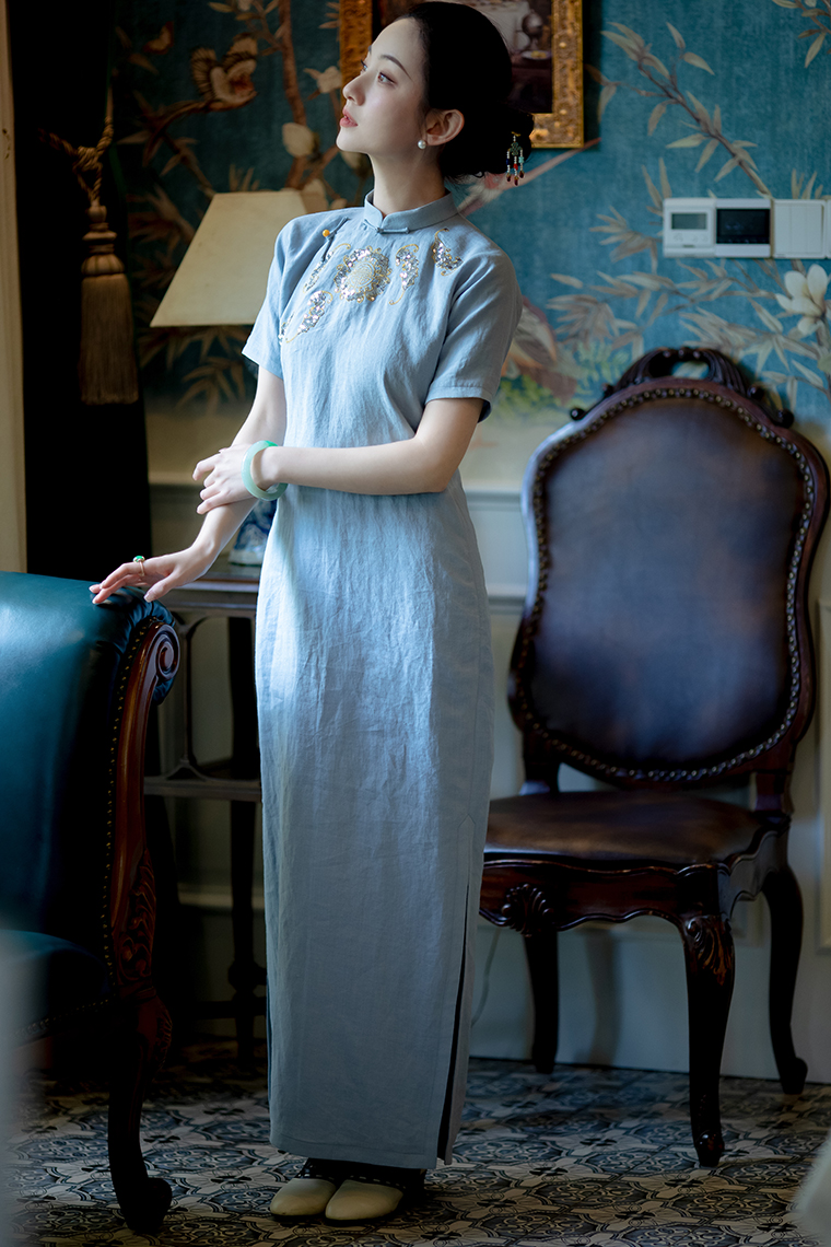 Fuluo Zhi Xiao丨2025 Summer New Collection丨Vintage Ramie Embroidered Floral Quarter-Sleeve Stand Collar Traditional Daily Cheongsam