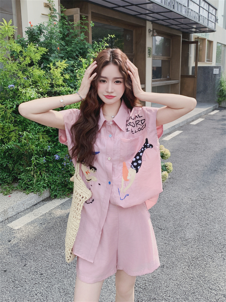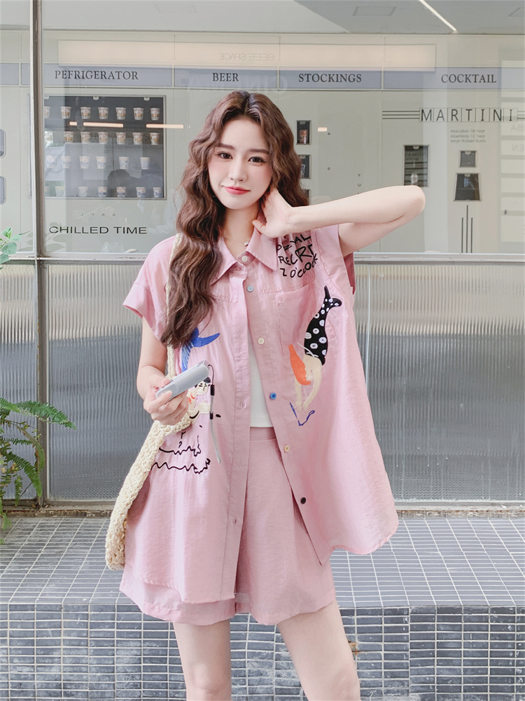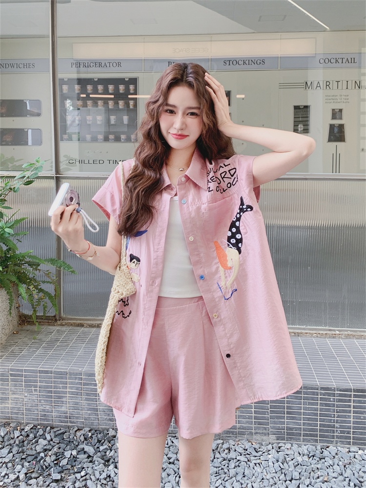 Summer Dopamine Pink Collared Shirt and Wide-Leg Shorts Two-Piece Set 150kg Plus Size Casual Fashion Suit
