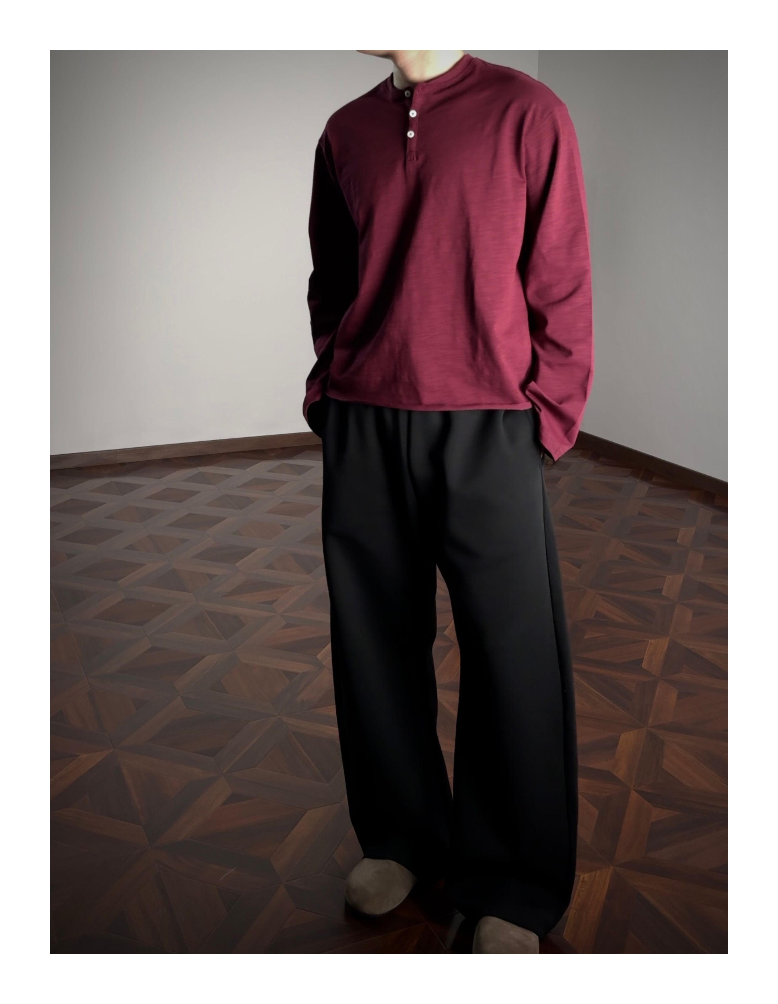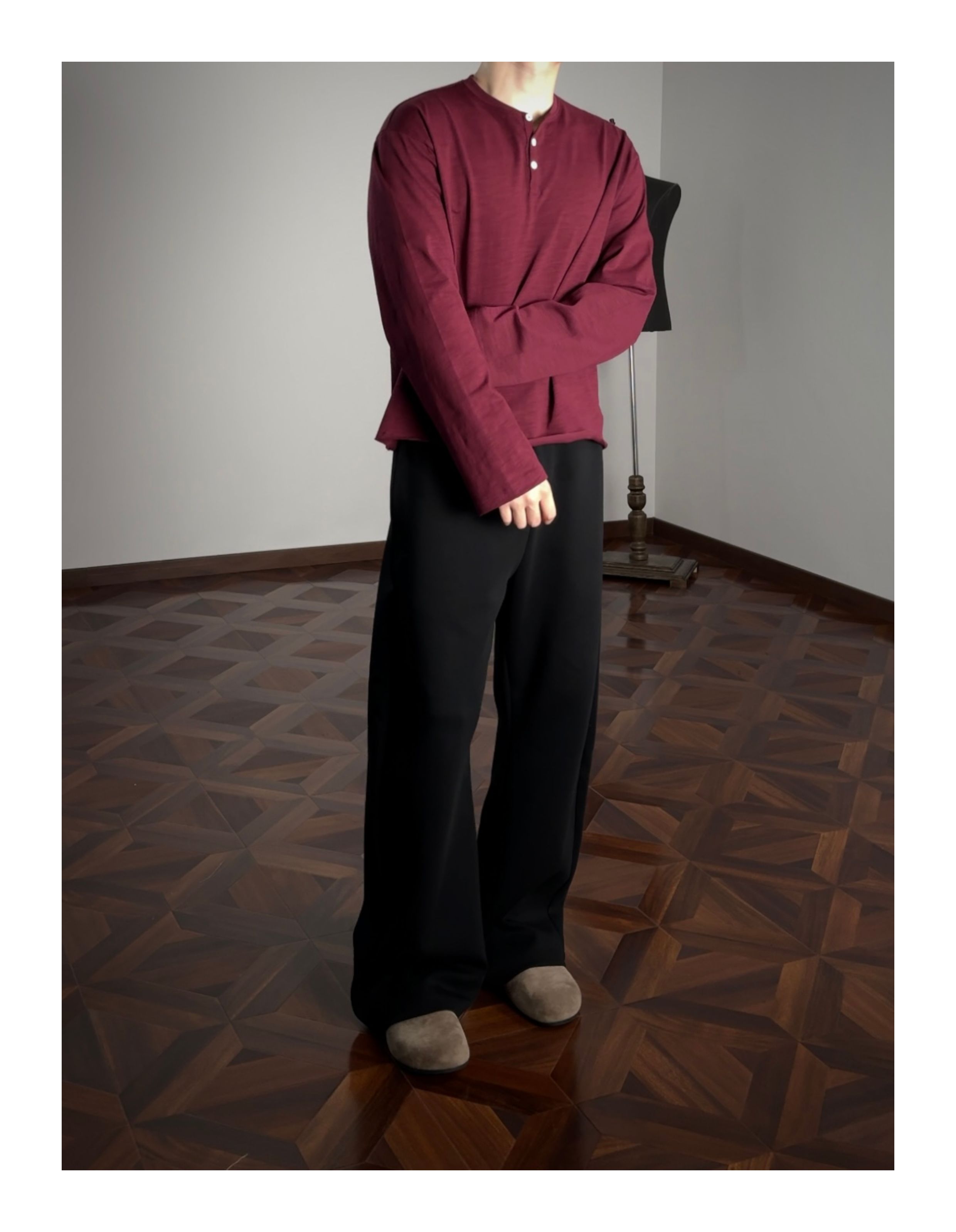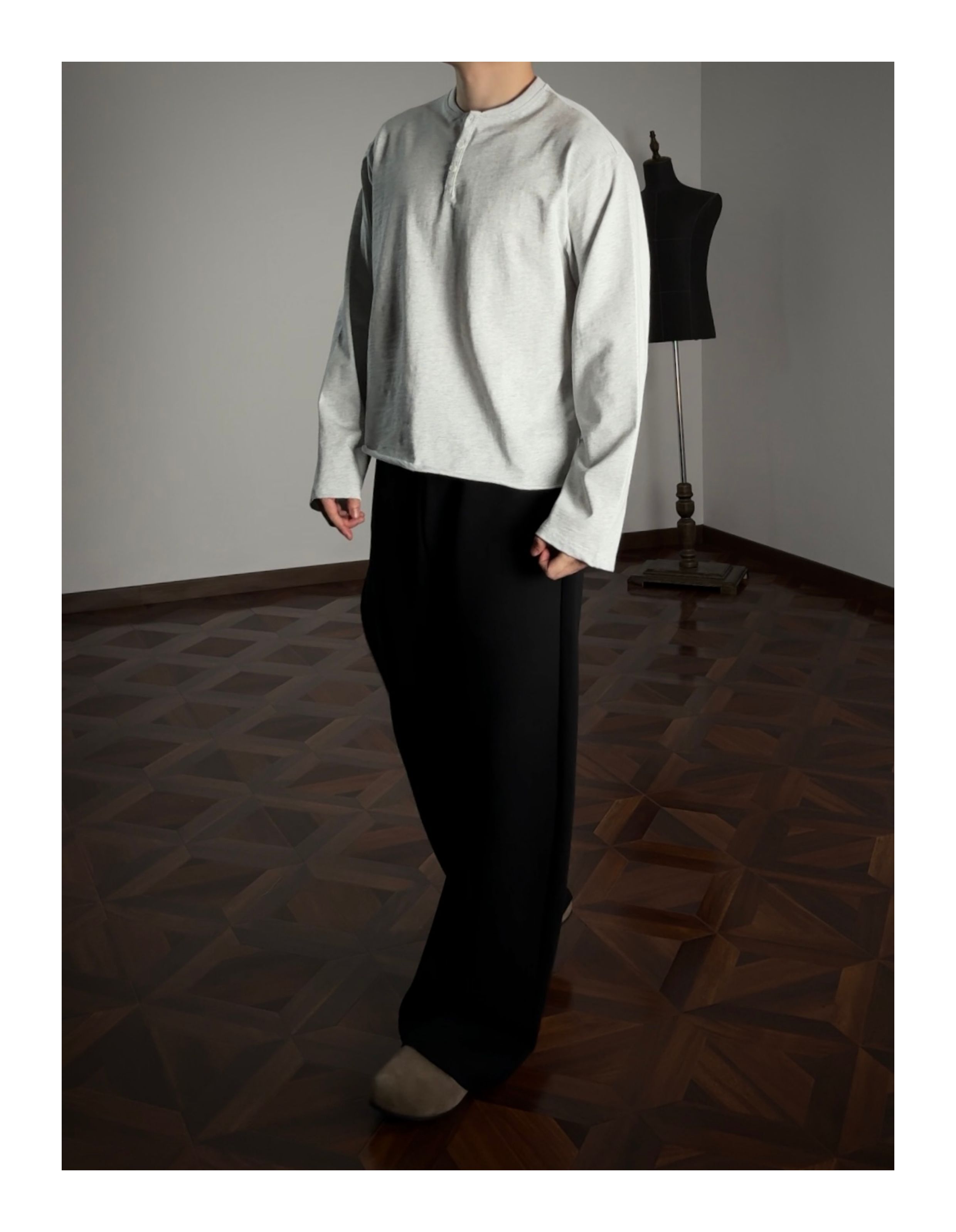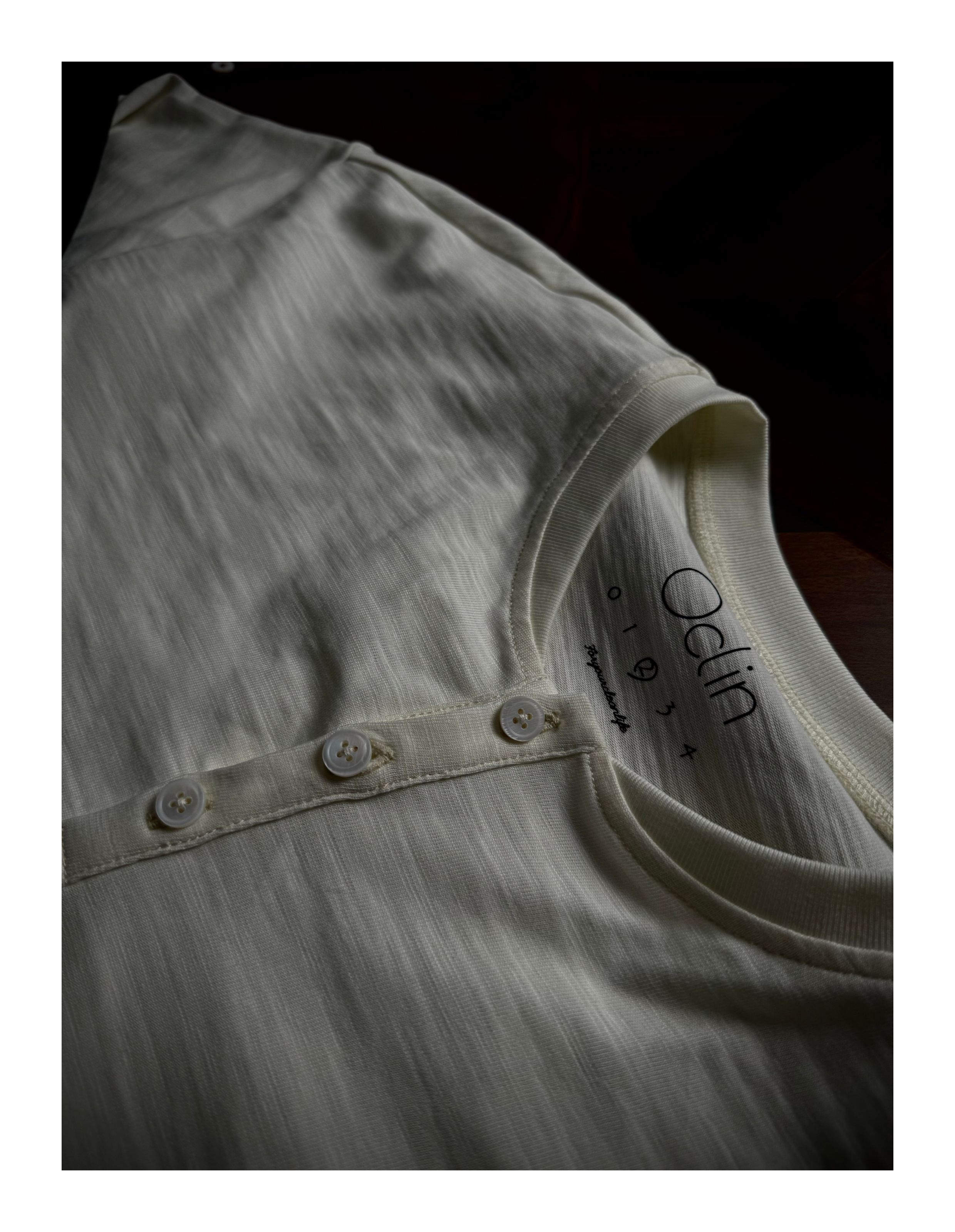 Oclin Bamboo Texture Henry Collar Long-Sleeve Shirt with Rolled Hem, Short and Wide Fit, Pure Cotton Commuter Essential, Shell Buttons