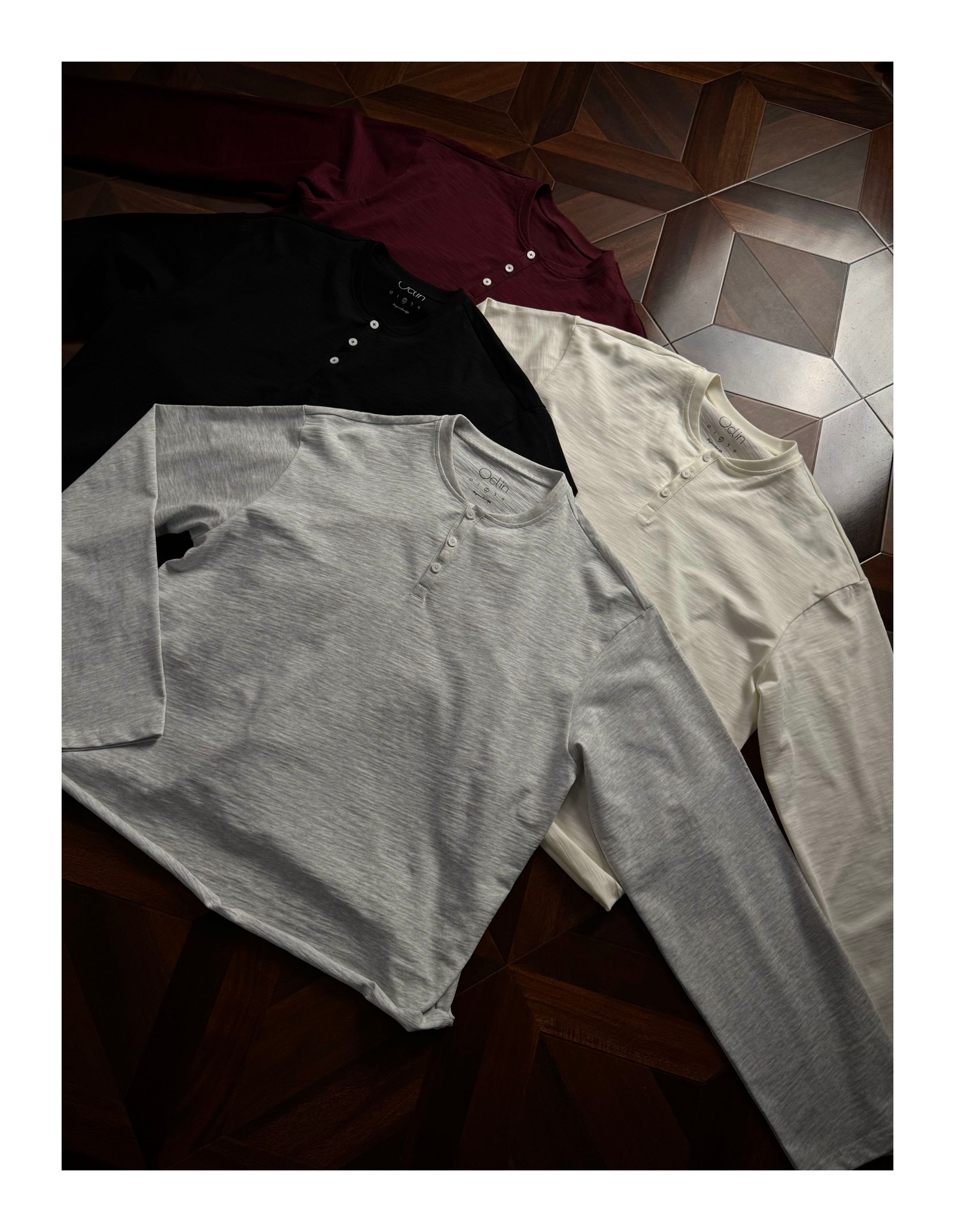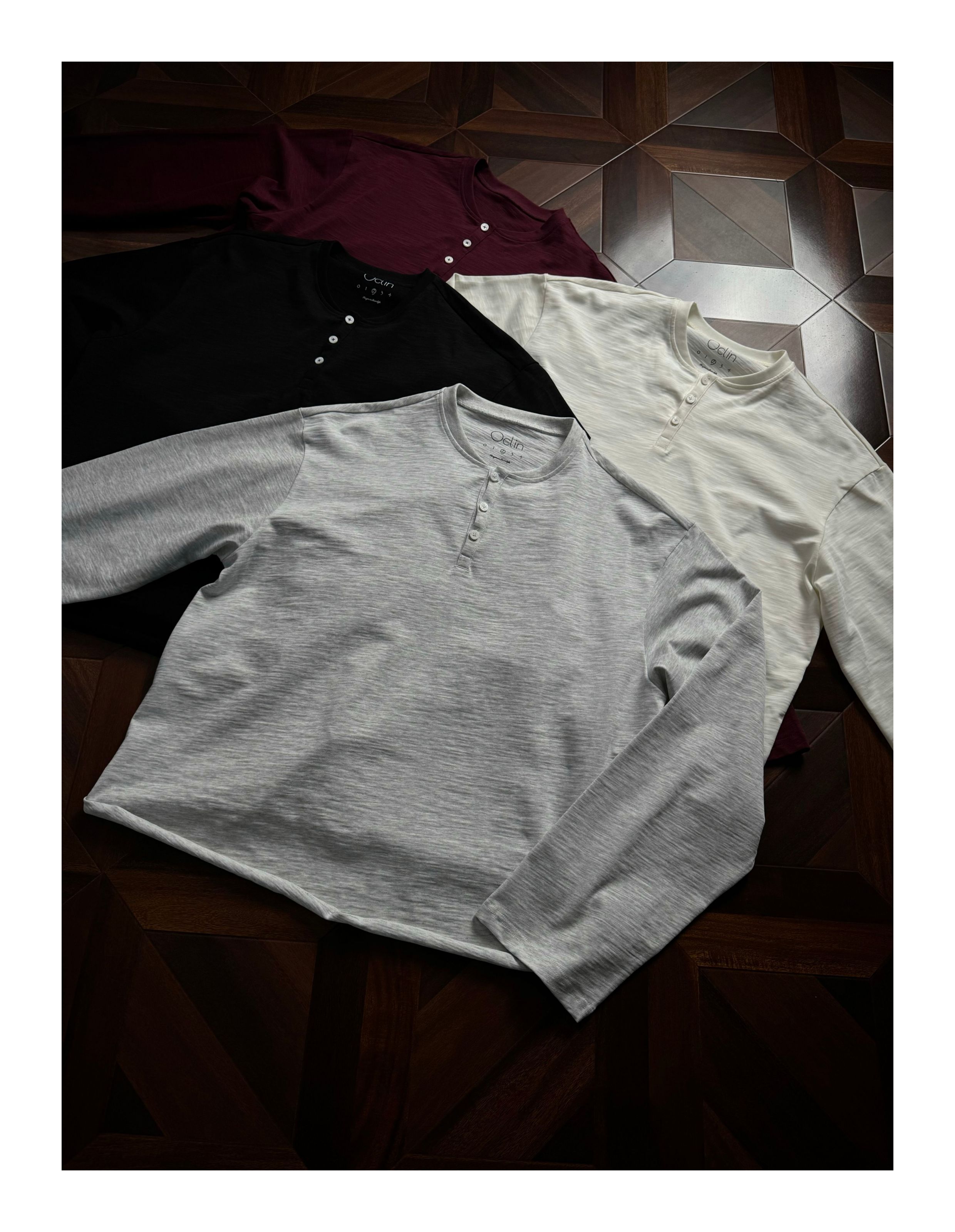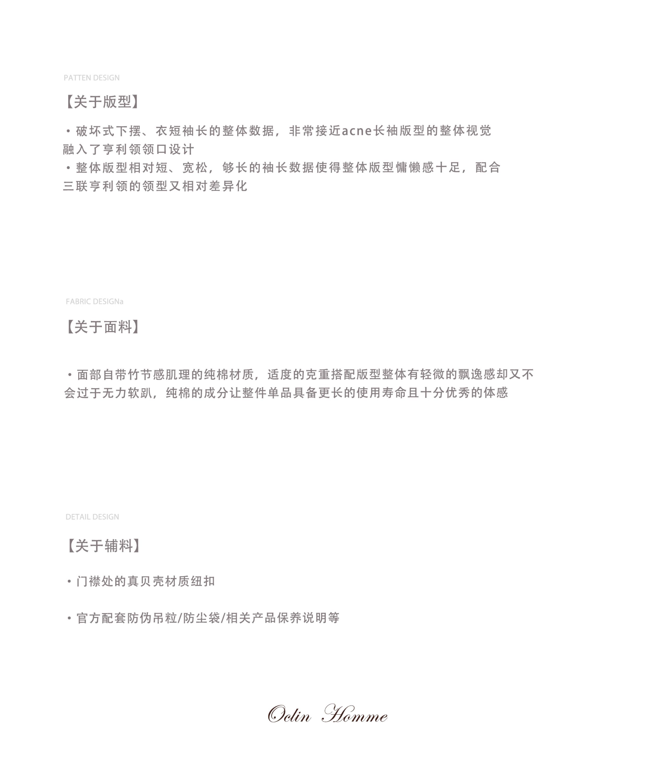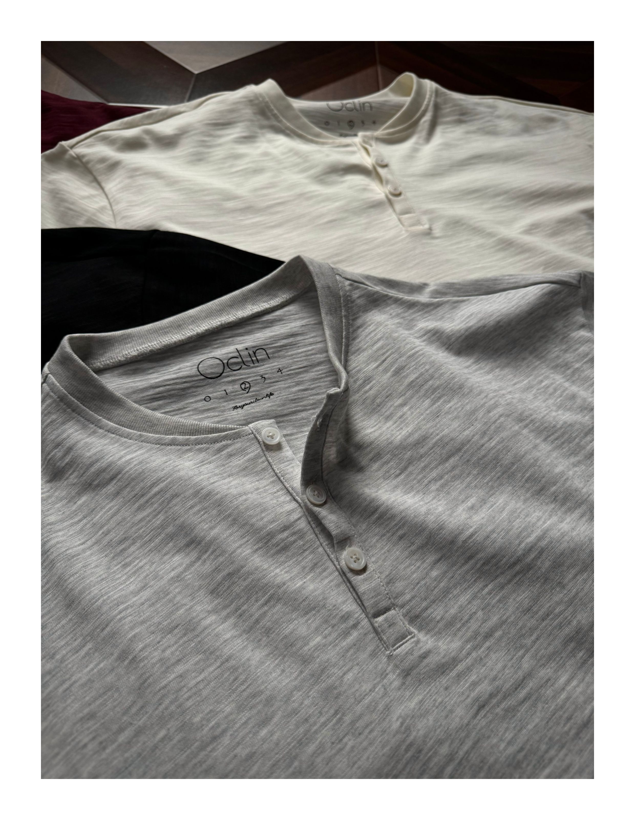 Oclin Bamboo Texture Henry Collar Long-Sleeve Shirt with Rolled Hem, Short and Wide Fit, Pure Cotton Commuter Essential, Shell Buttons
