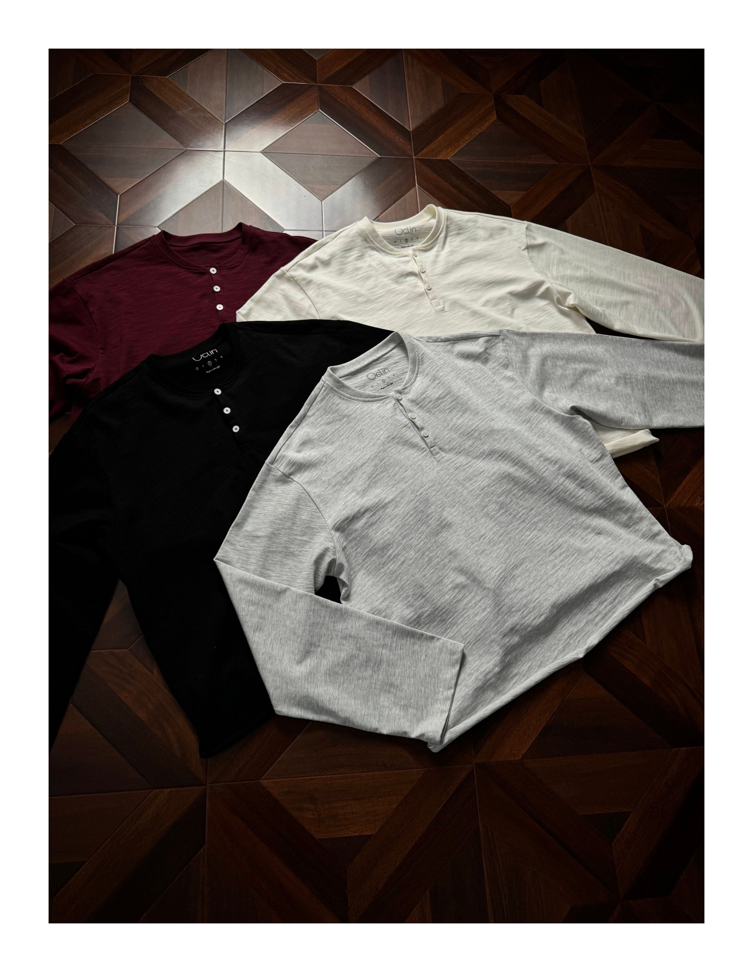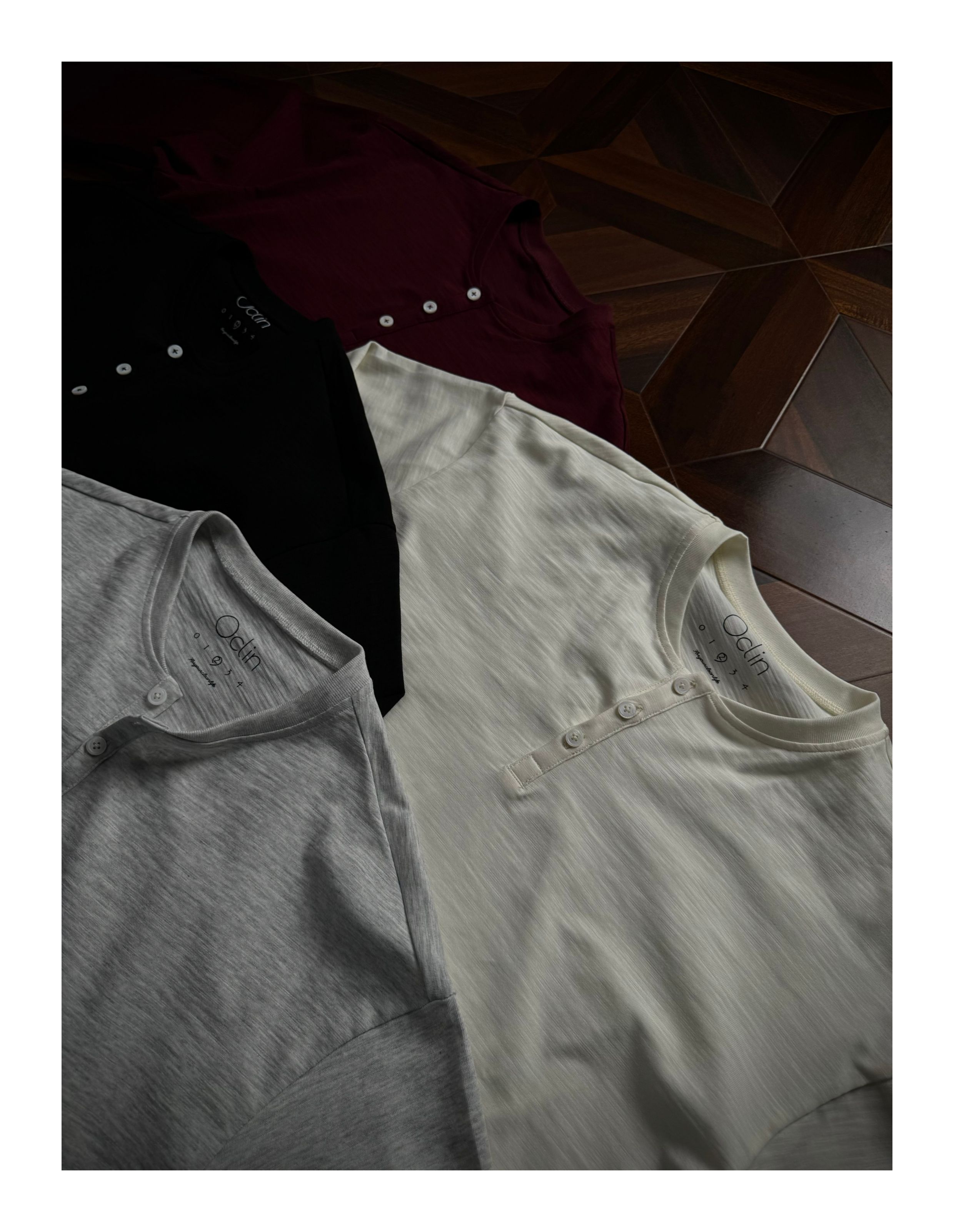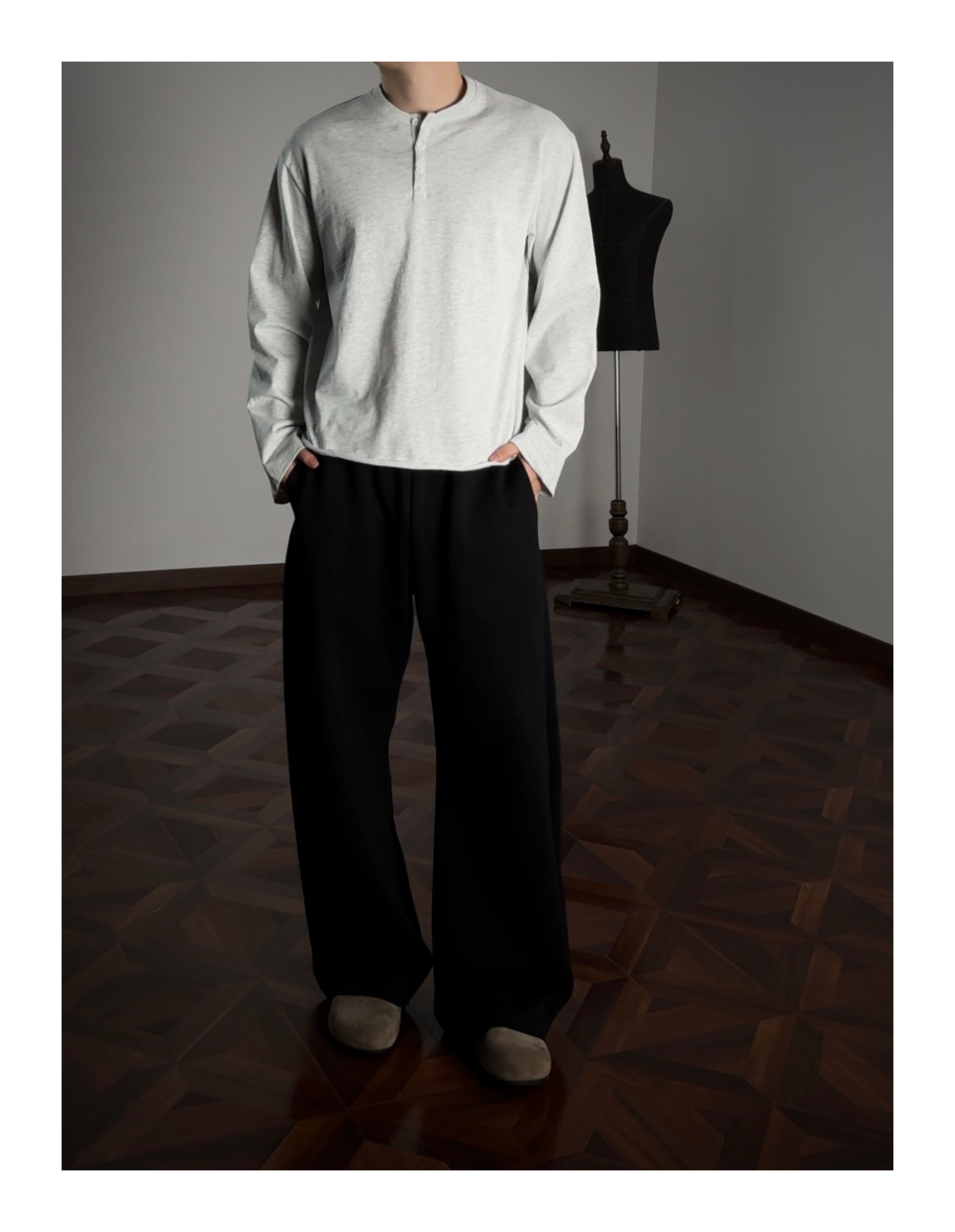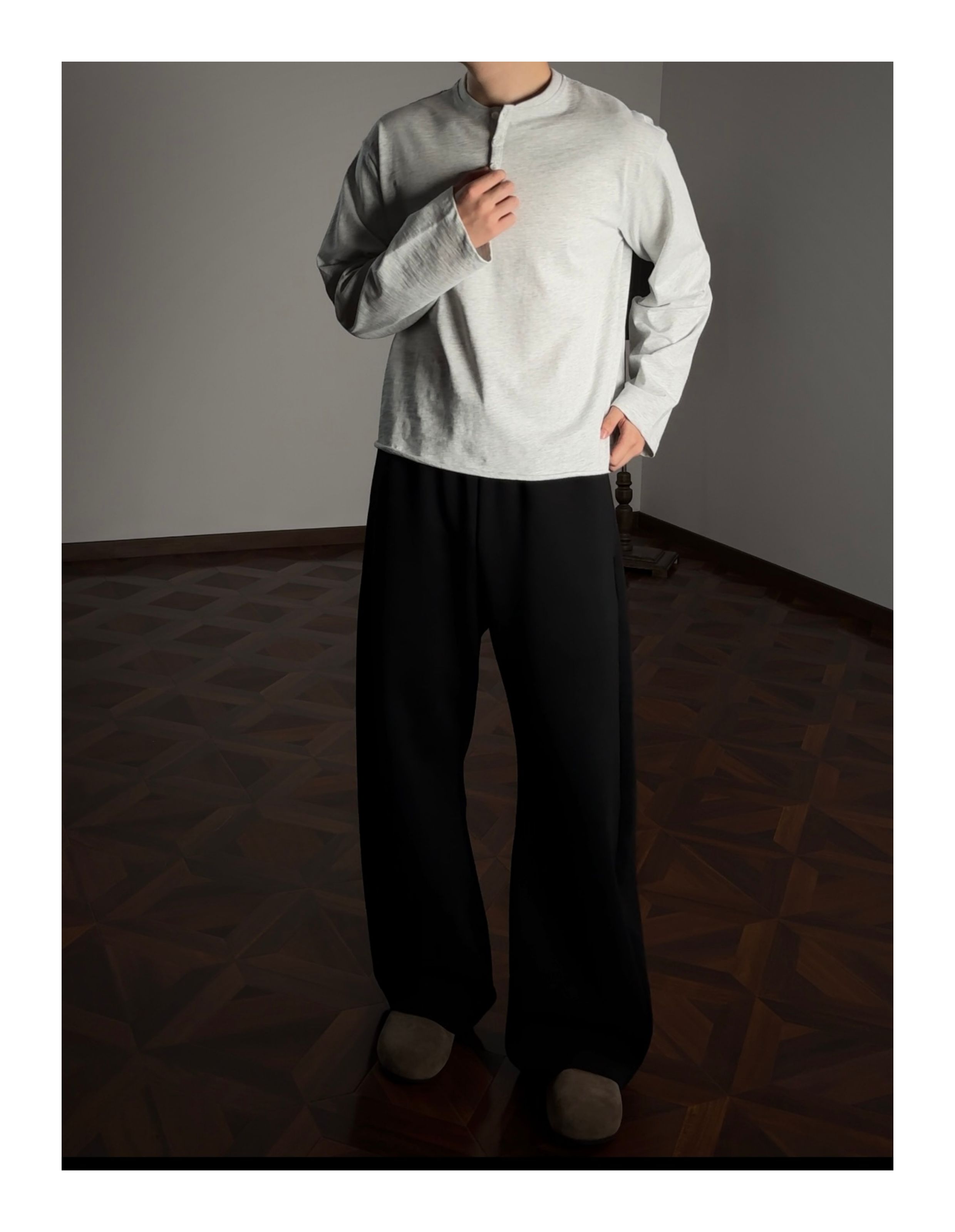 Oclin Bamboo Texture Henry Collar Long-Sleeve Shirt with Rolled Hem, Short and Wide Fit, Pure Cotton Commuter Essential, Shell Buttons