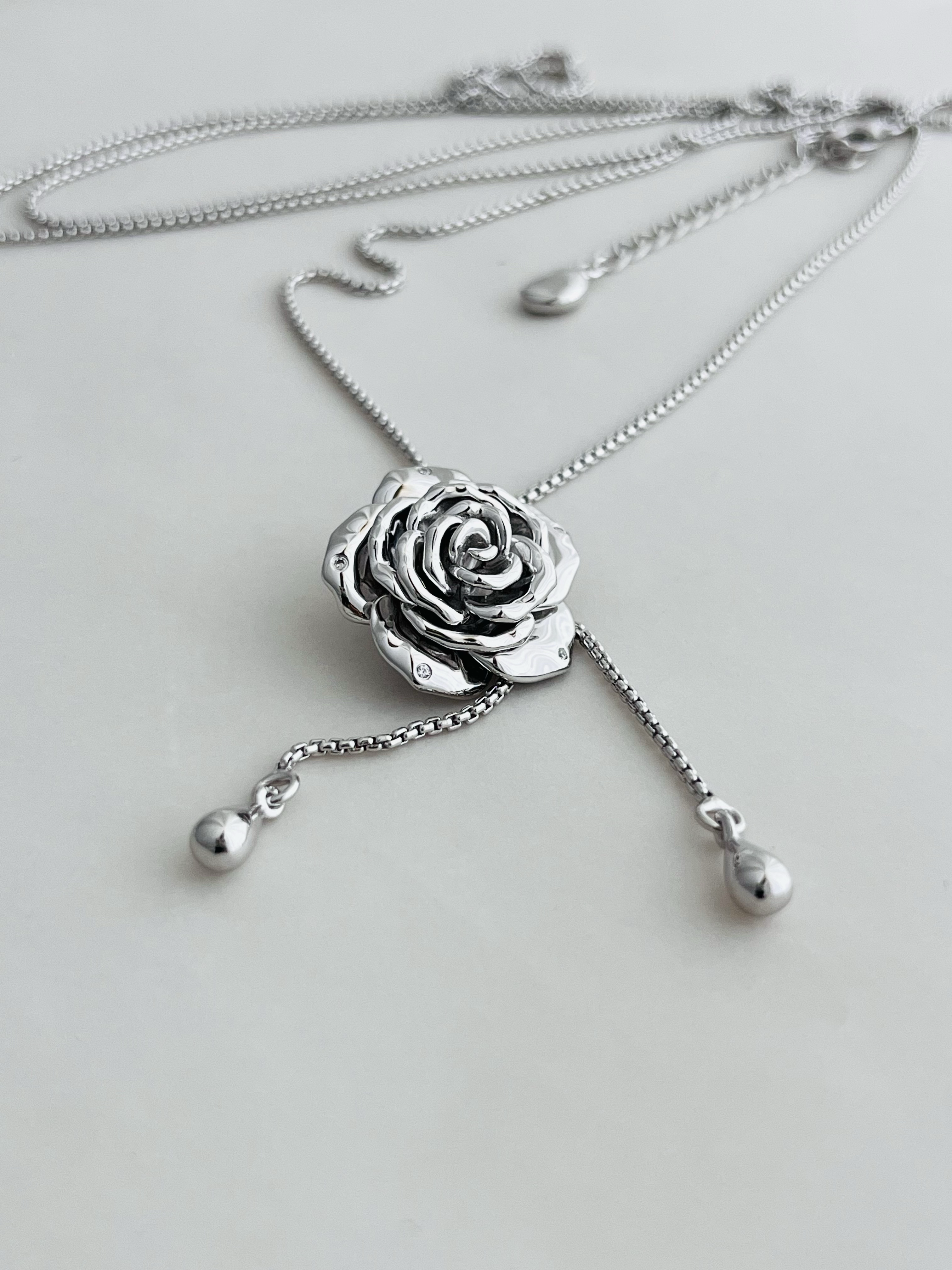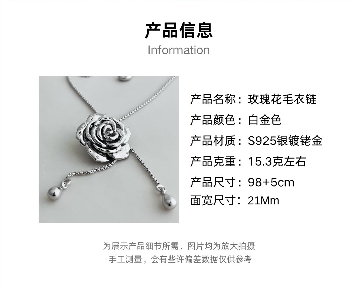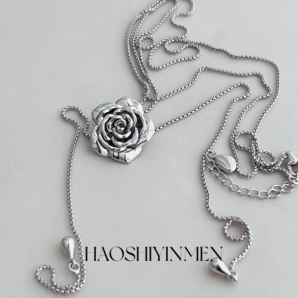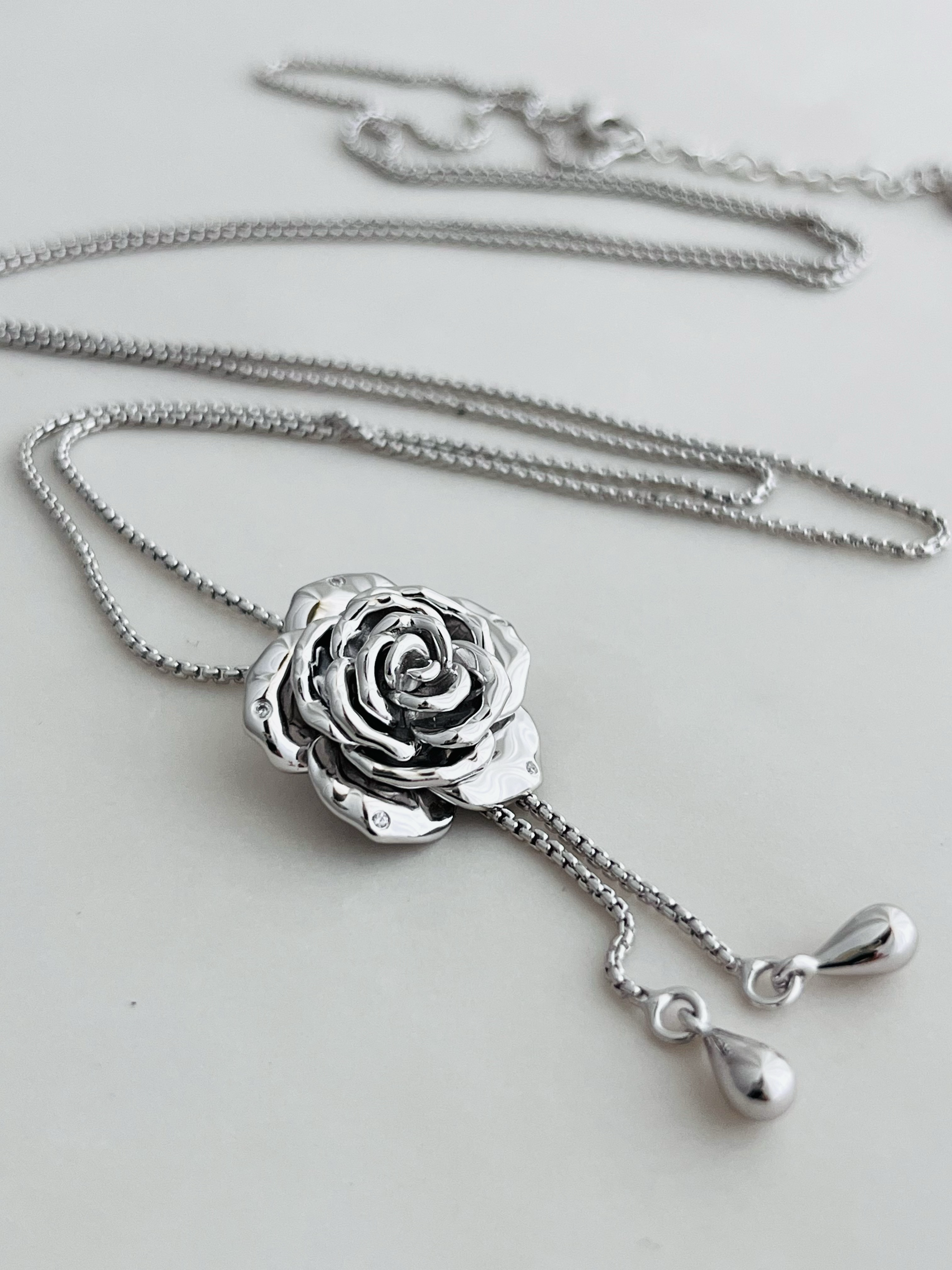 Designer Style All-Over S925 Sterling Silver Rhodium-Plated Vintage Camellia Necklace Niche High-End Fashion Sweater Chain