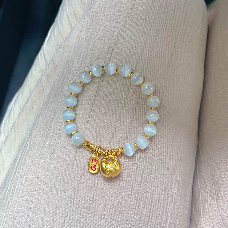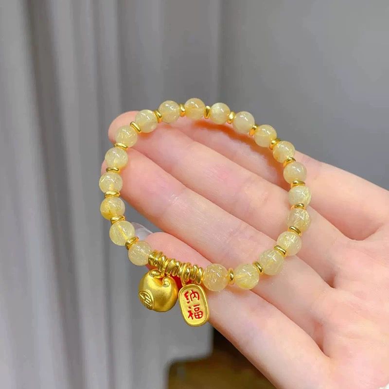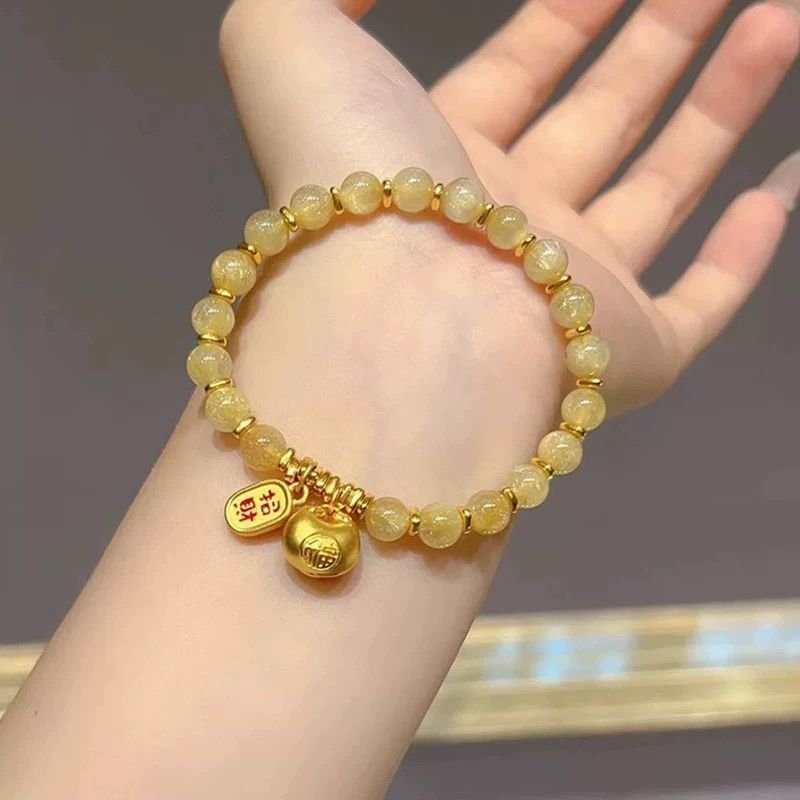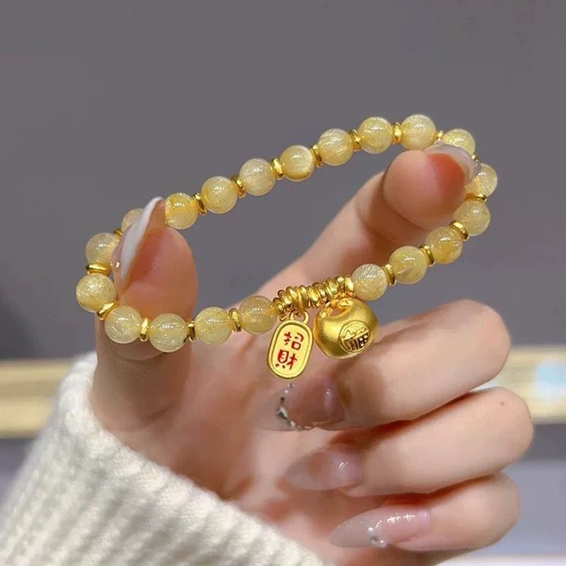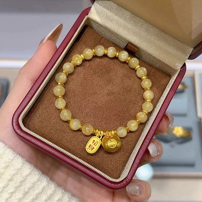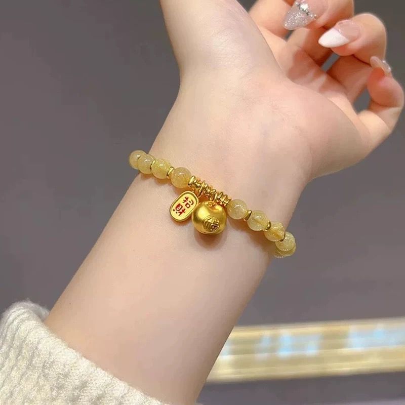 Gold and Blonde Crystal Chubby Fortune Bracelet for Women, Pure Gold 999, Attracts Wealth and Good Fortune, Gold Bracelet, Birthday Gift for Girlfriend