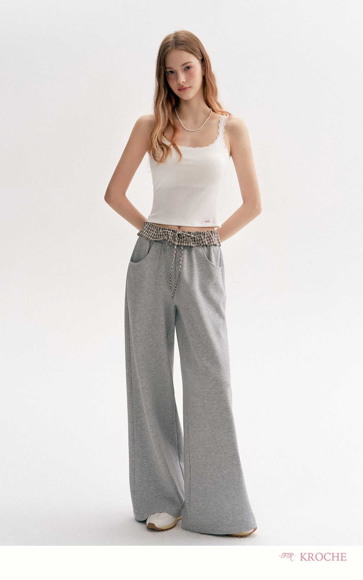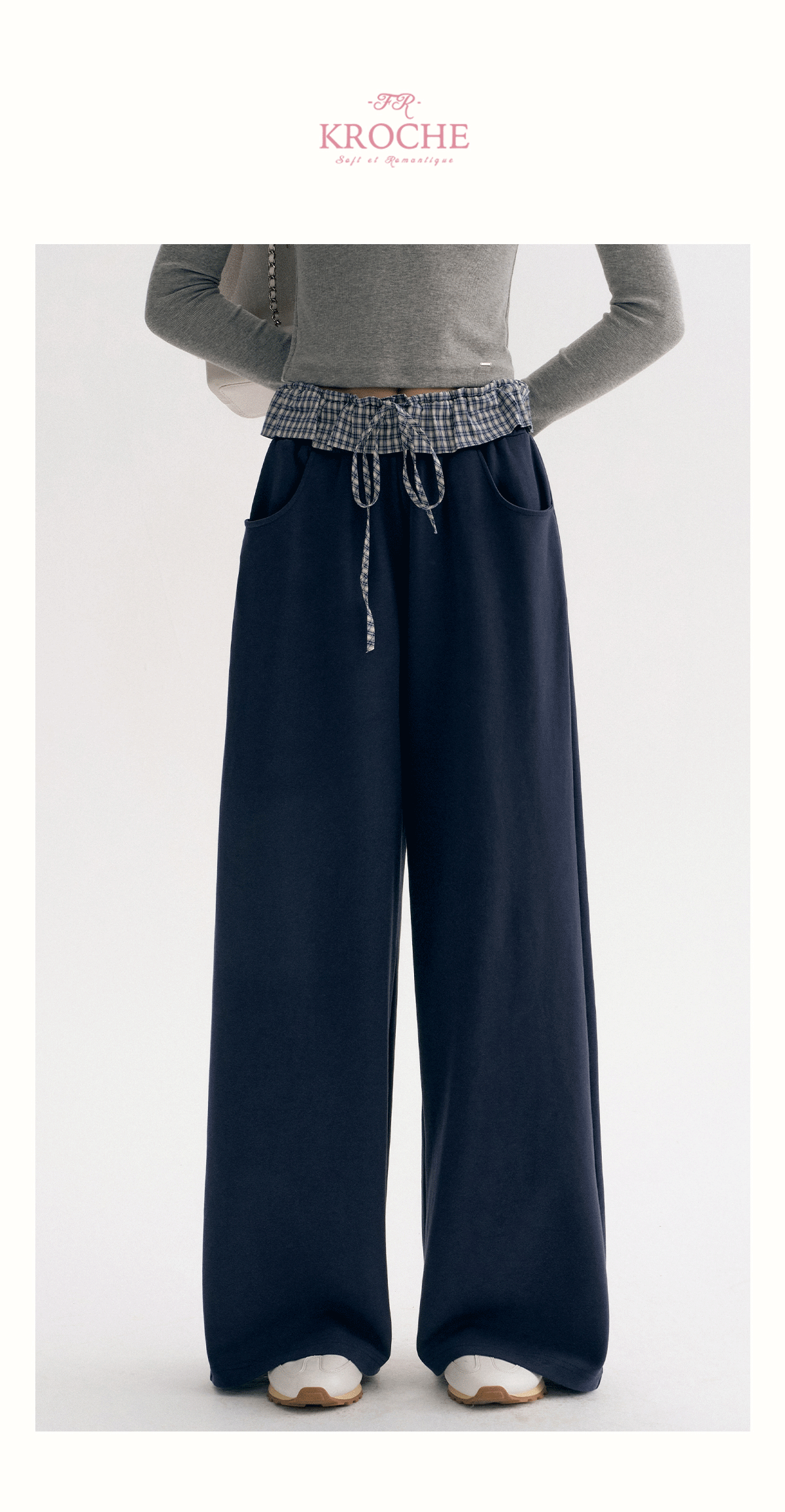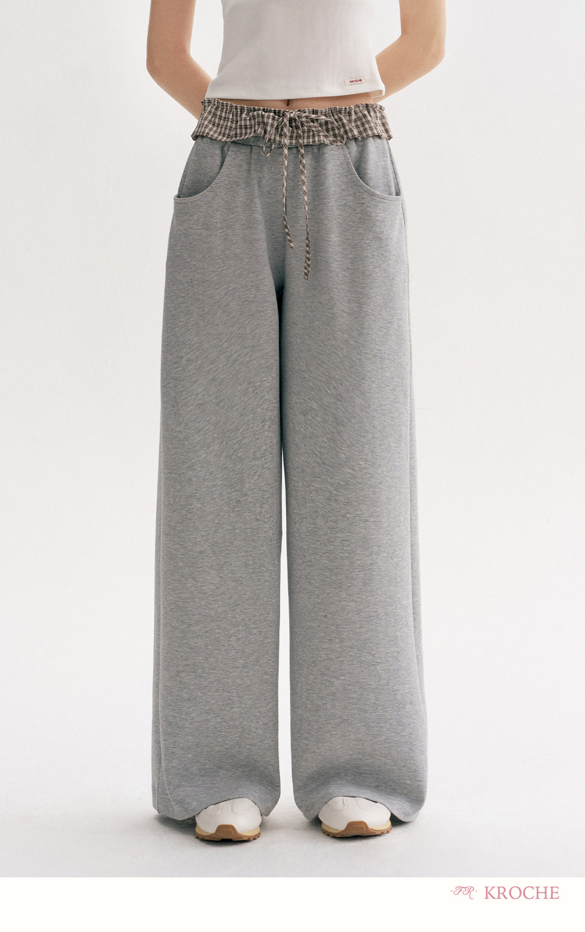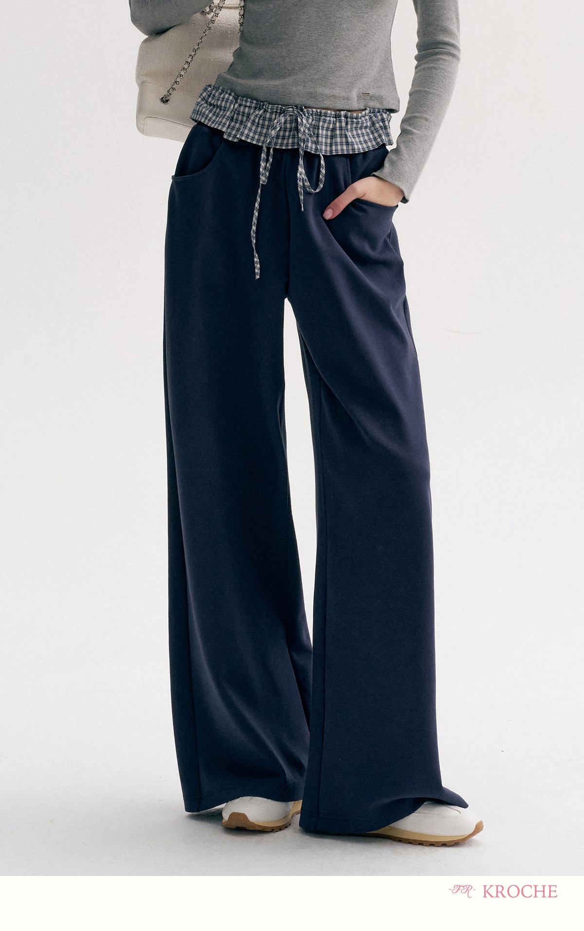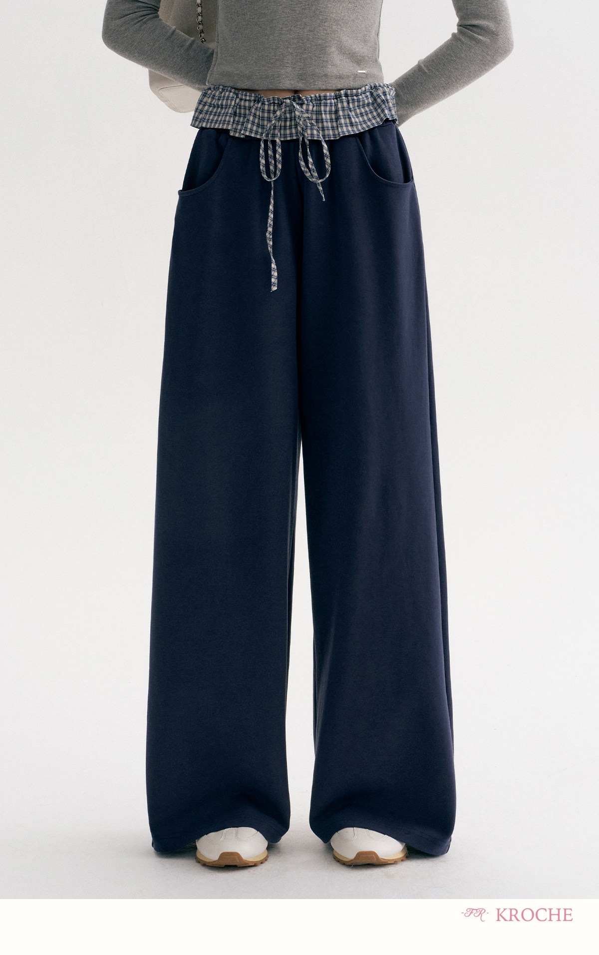 Amy's Same Style Kroche Color-Blocked Plaid Lace Patchwork Elastic Waist Drawstring Wide-Leg Casual Sweatpants