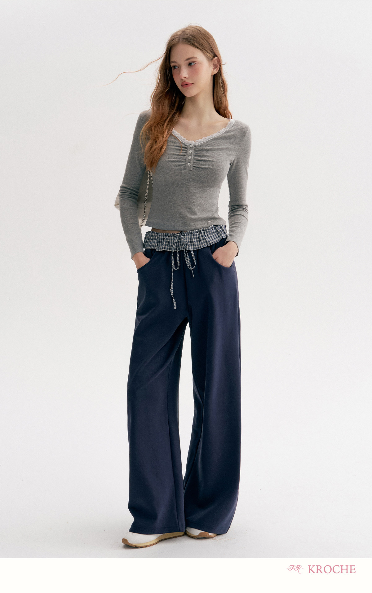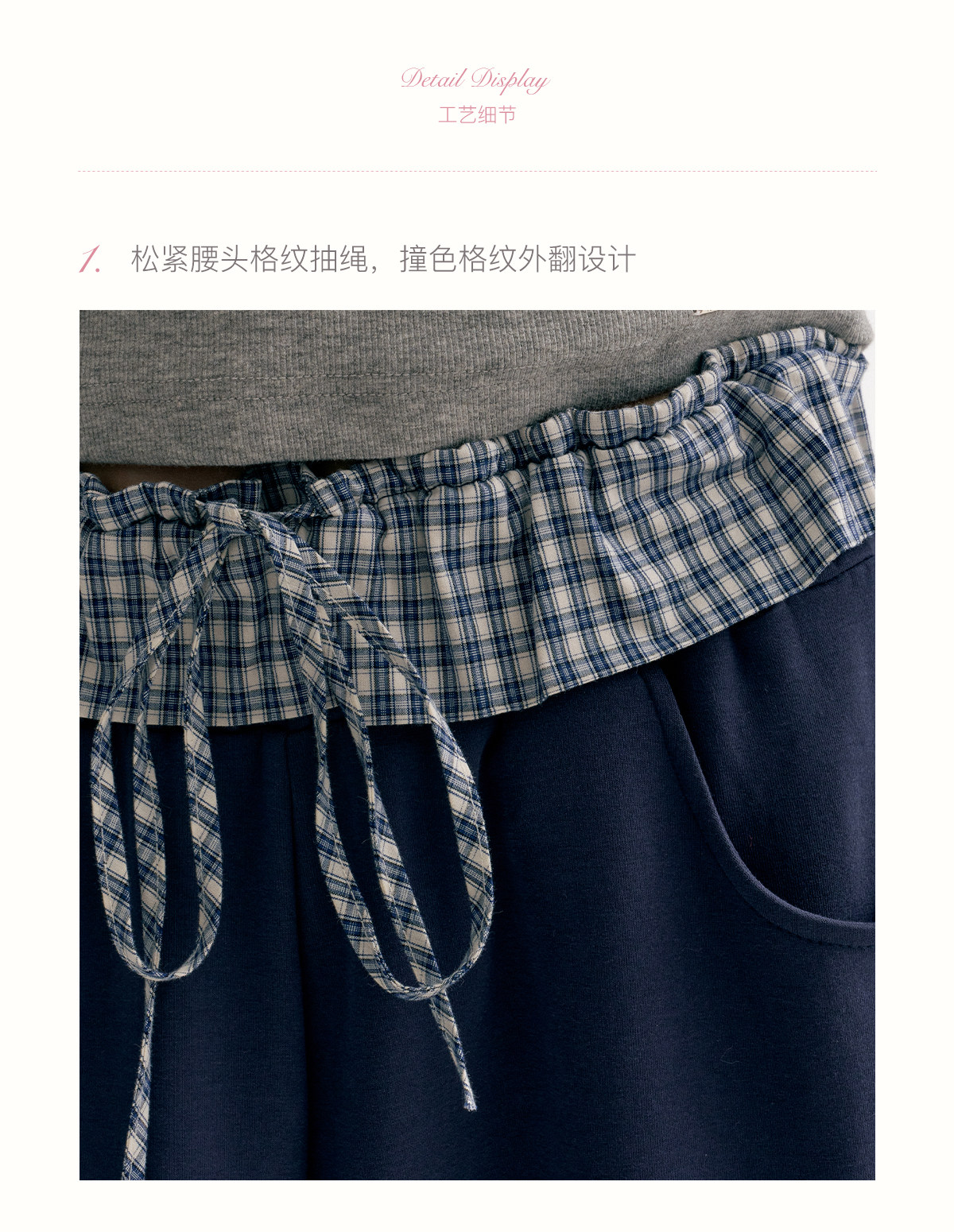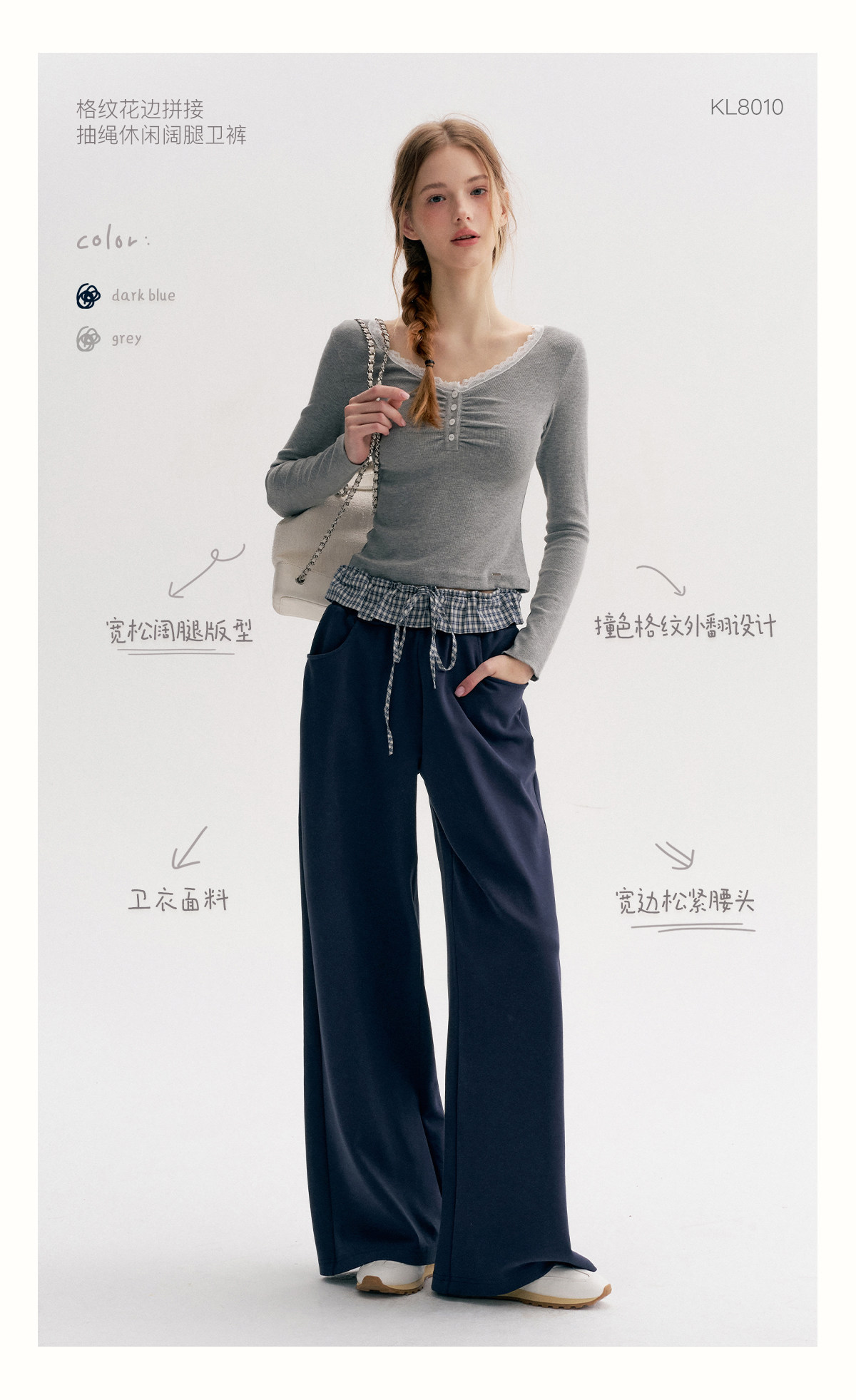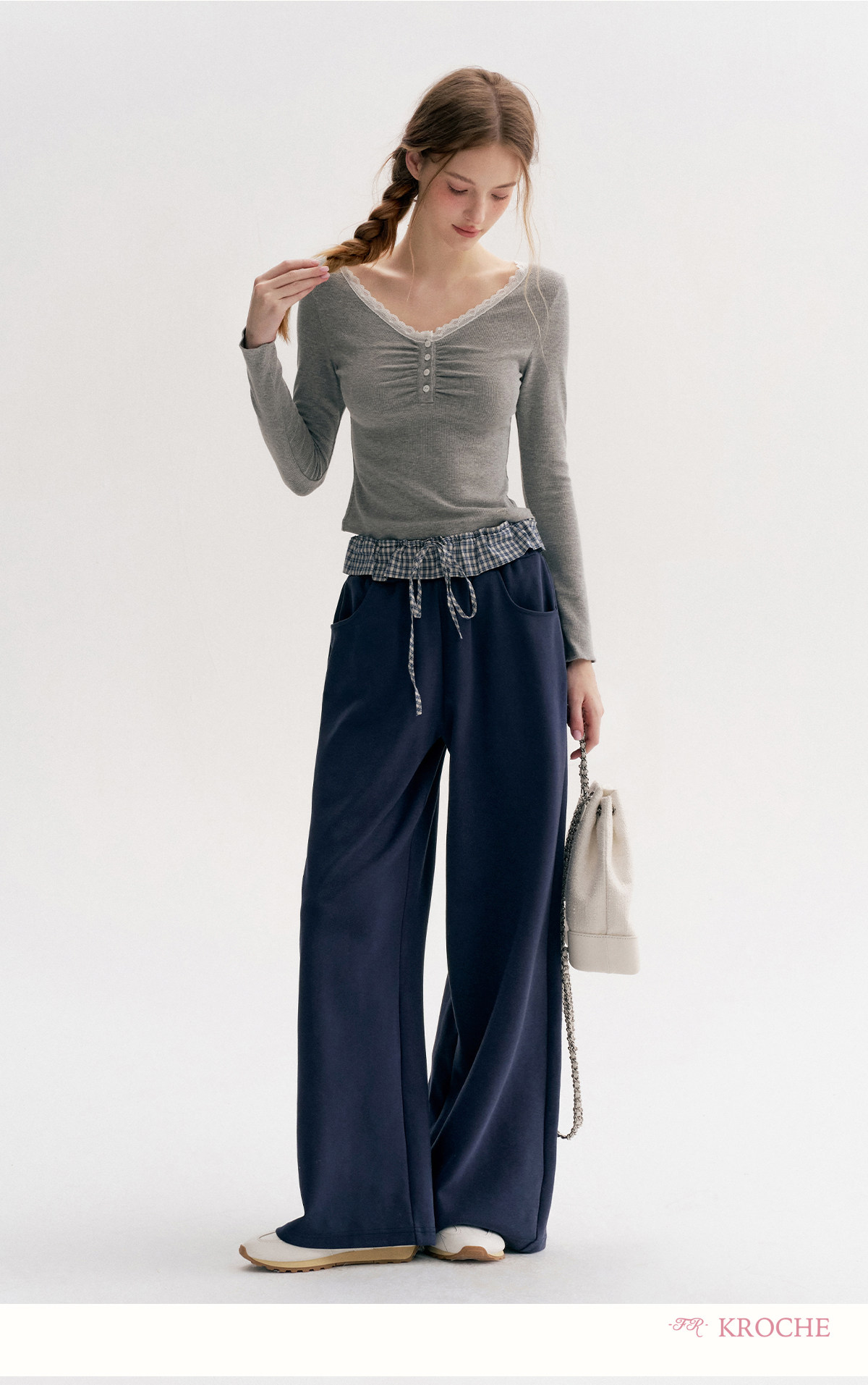 Amy's Same Style Kroche Color-Blocked Plaid Lace Patchwork Elastic Waist Drawstring Wide-Leg Casual Sweatpants