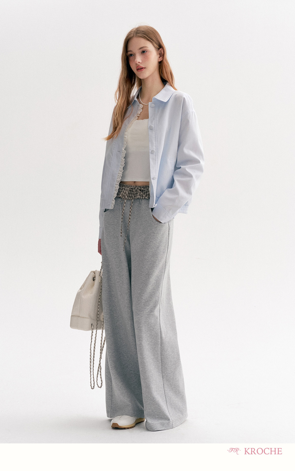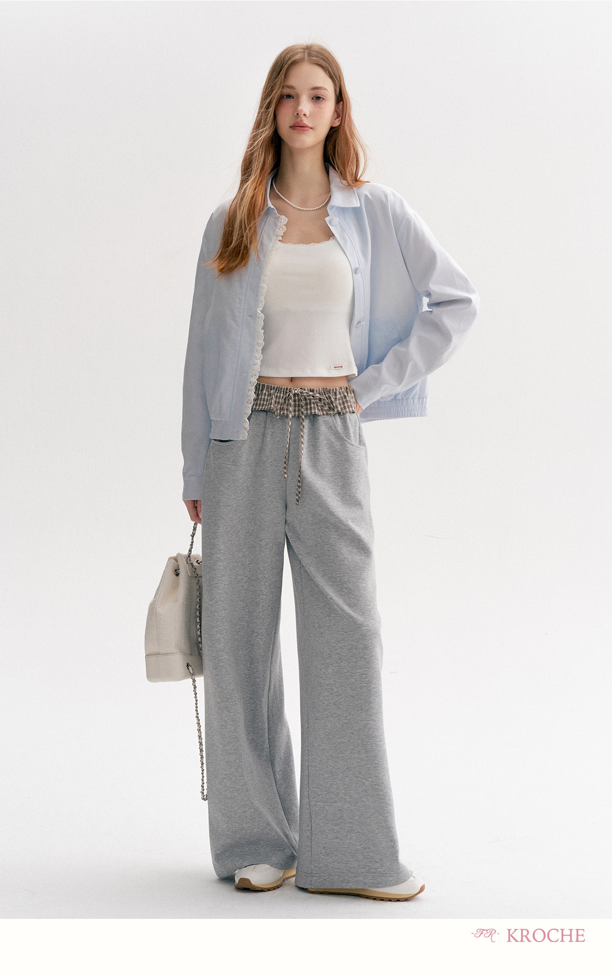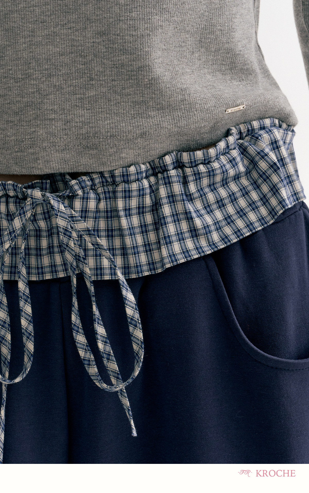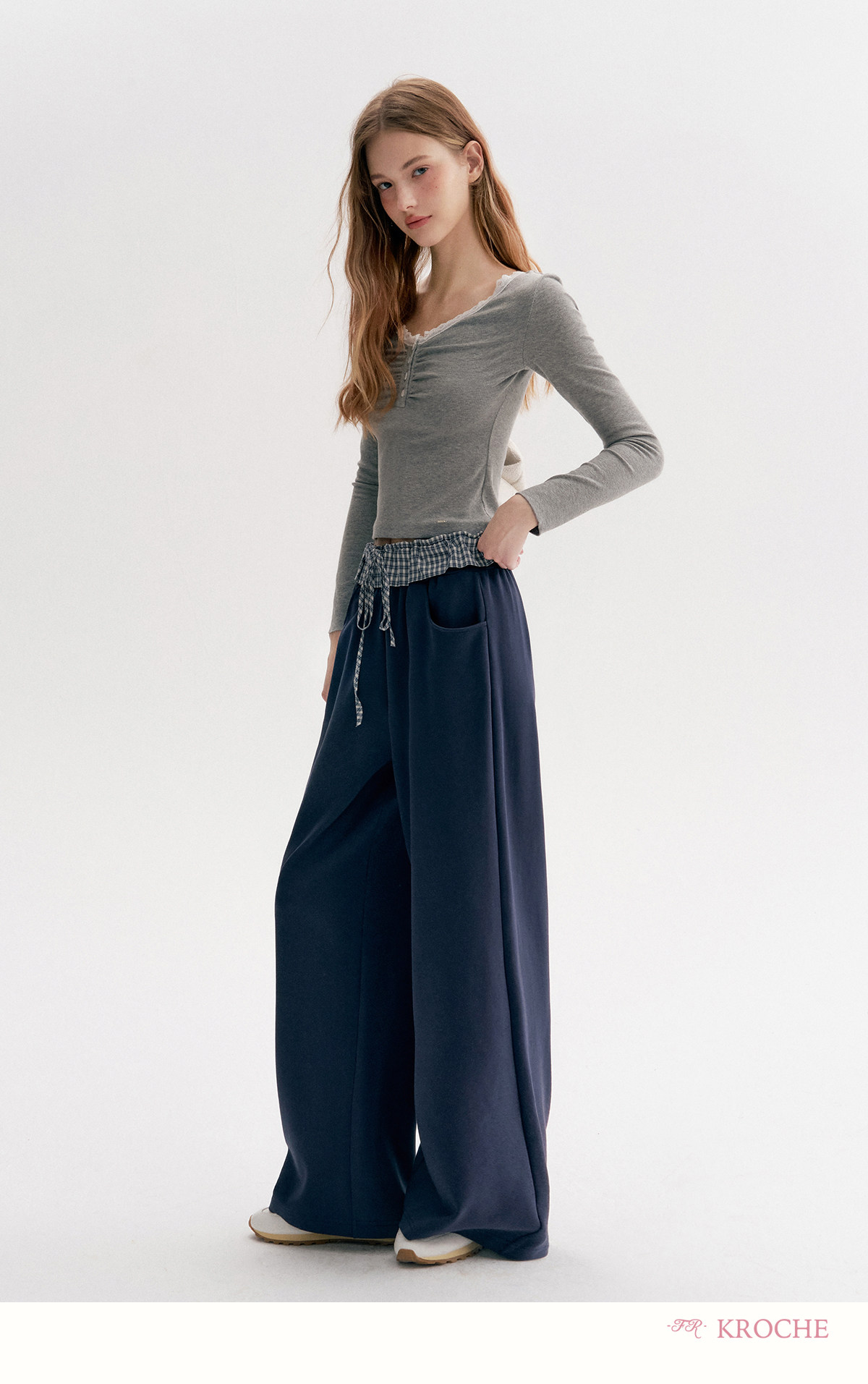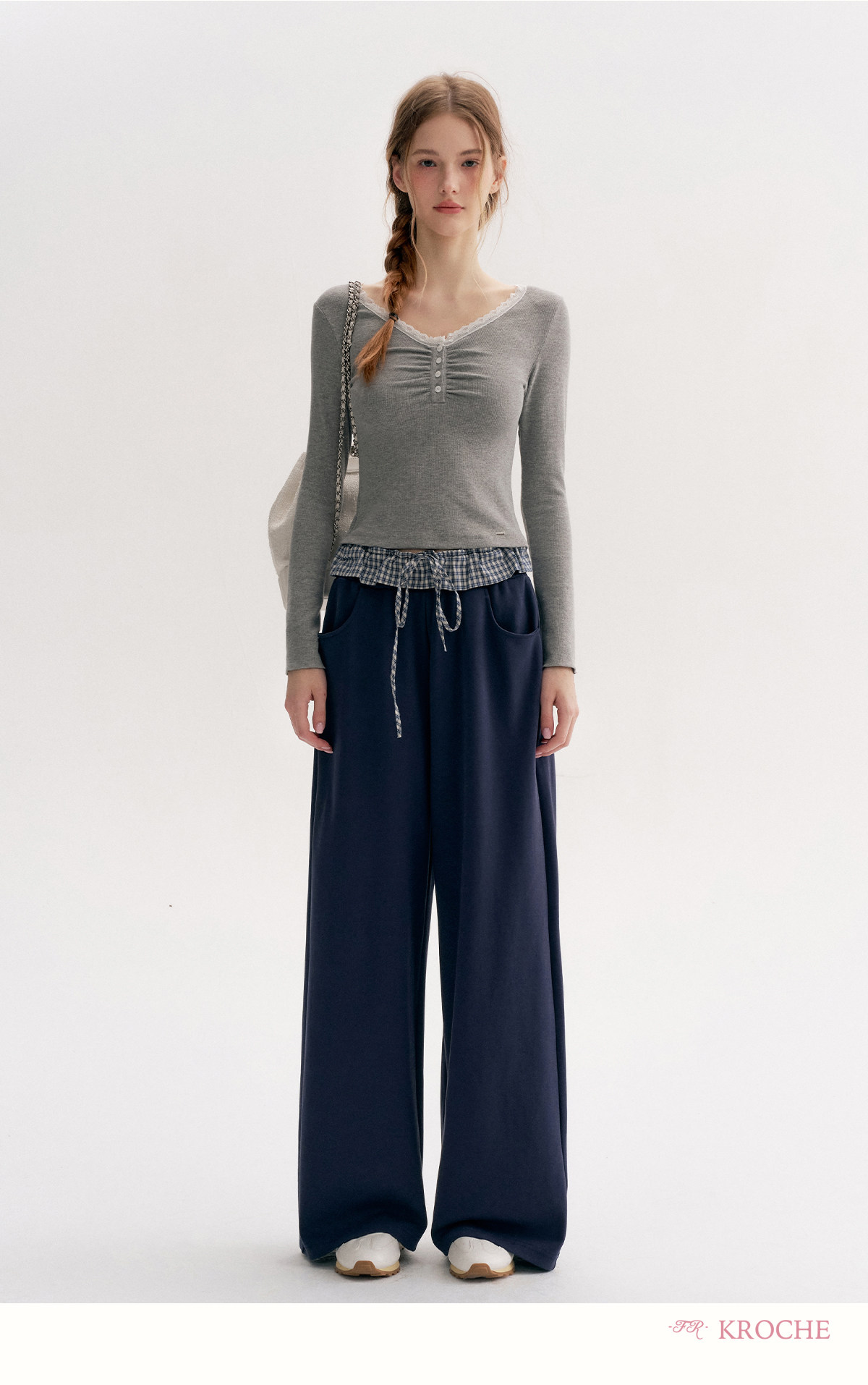 Amy's Same Style Kroche Color-Blocked Plaid Lace Patchwork Elastic Waist Drawstring Wide-Leg Casual Sweatpants