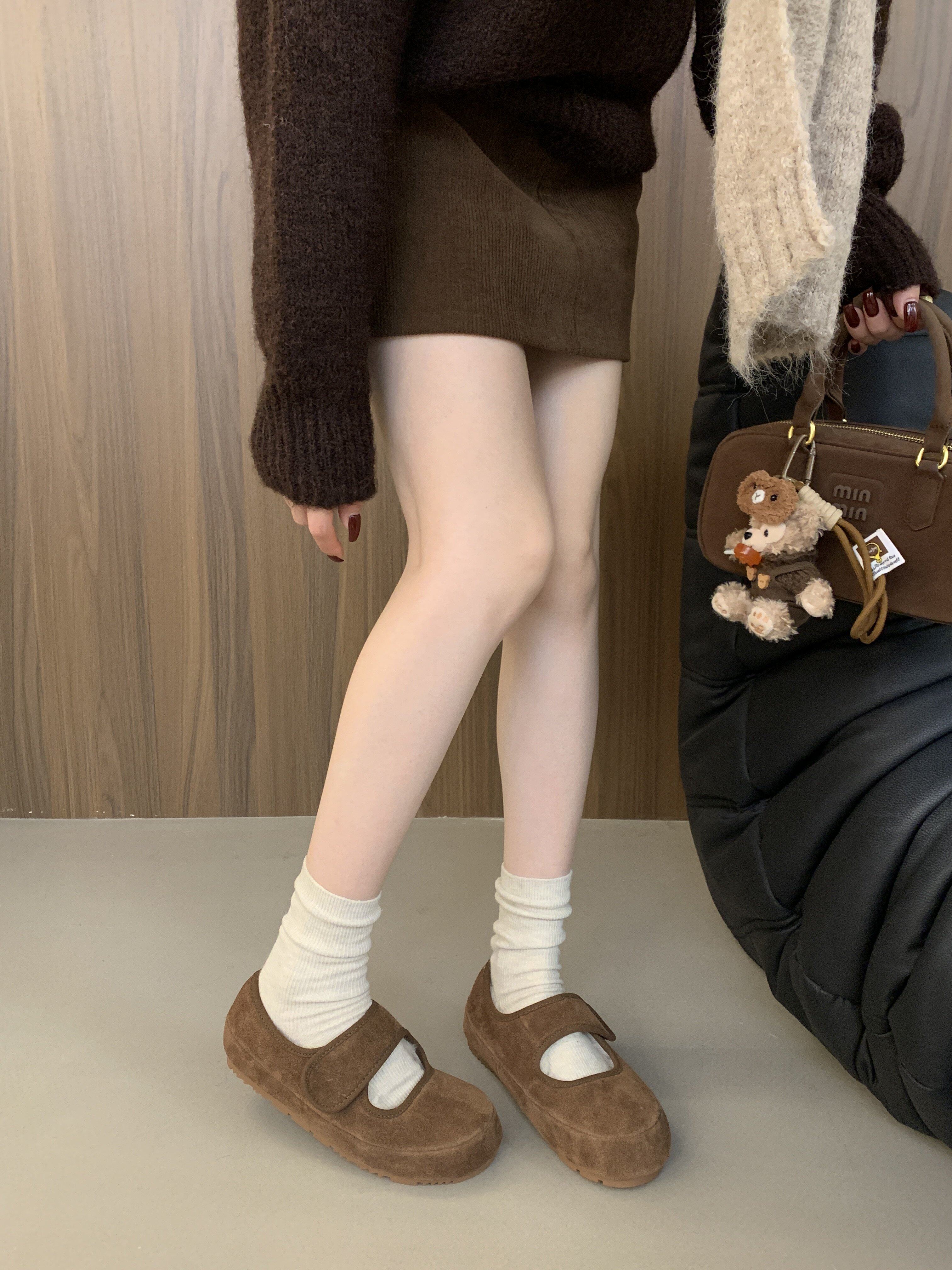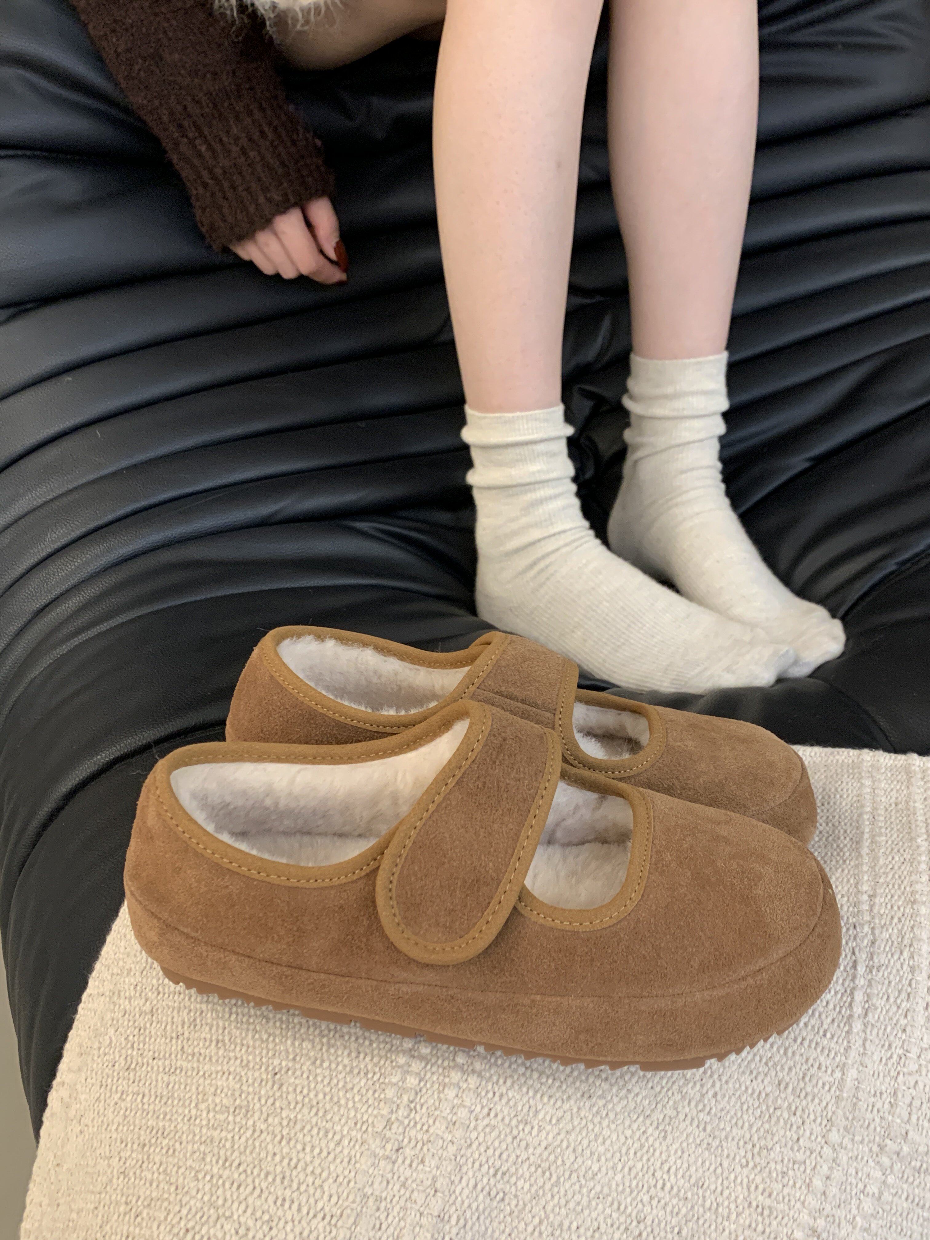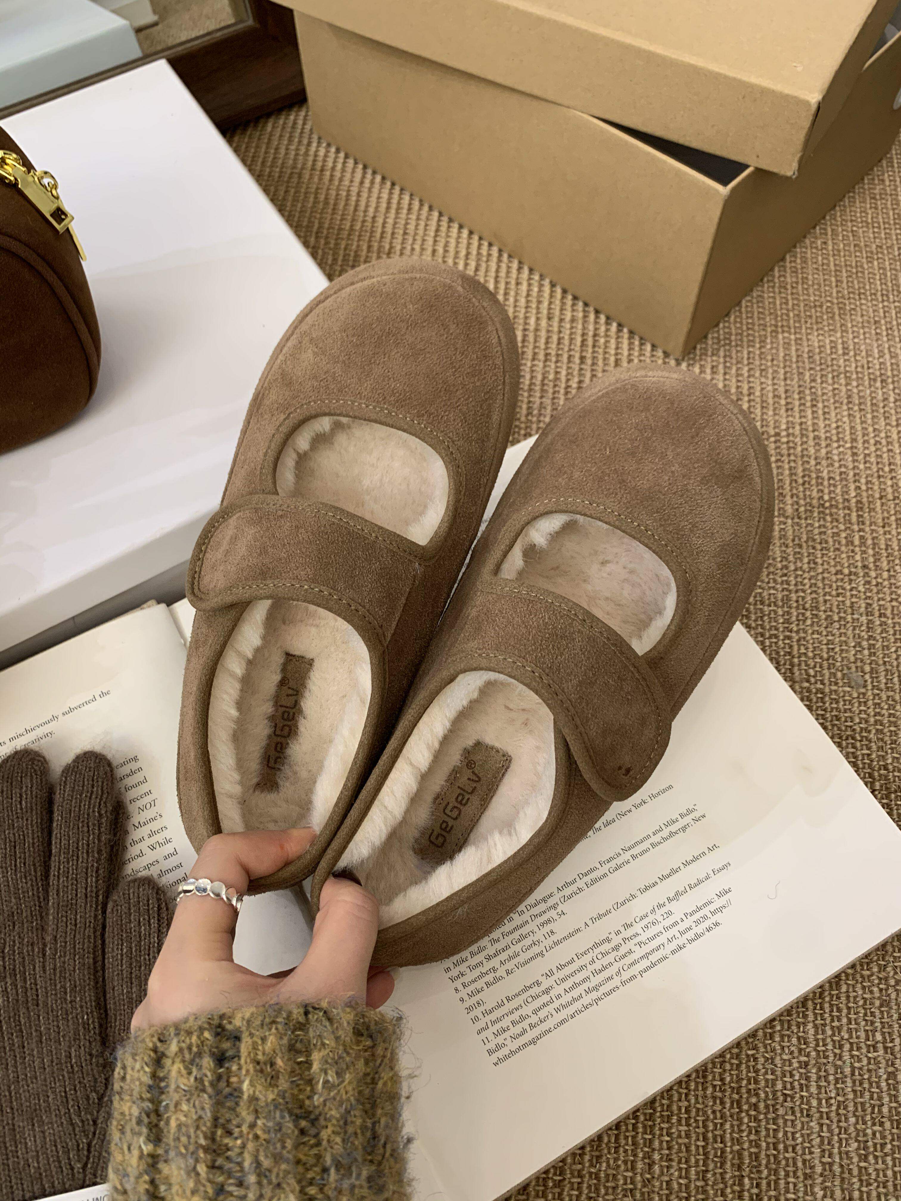 Hong Kong Genuine Leather Flat Mary Jane Birkenstock Shoes, Furry Cotton Shoes for Women, 2026 Winter, Velcro Lazy Slip-On Casual Shoes
