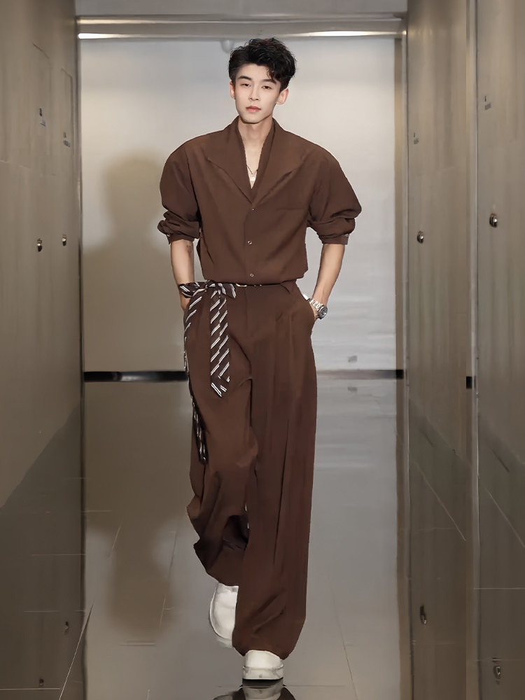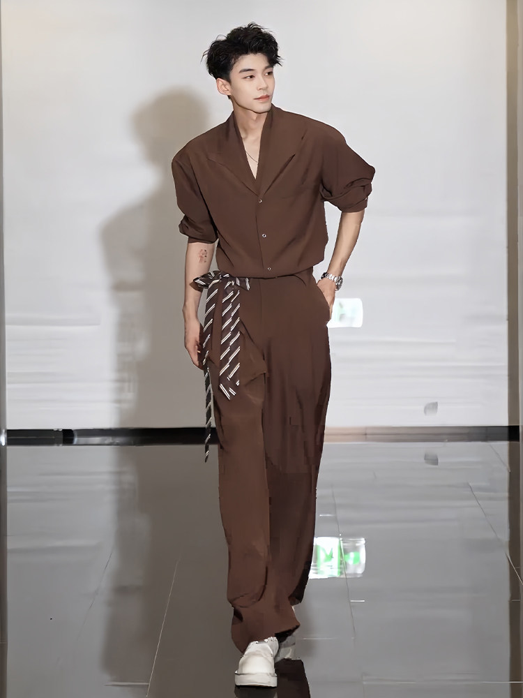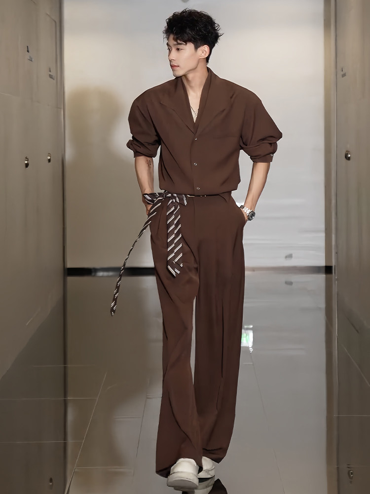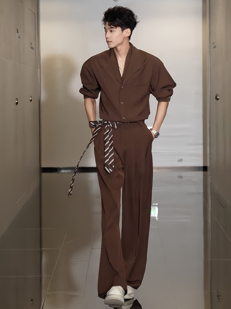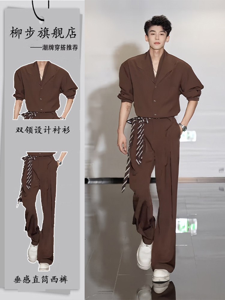 Double-Layer Collar Design Shirt for Men, Cool and Stylish Outfit Set, Autumn Matching, Handsome and High-End Complete Men's Clothing Set