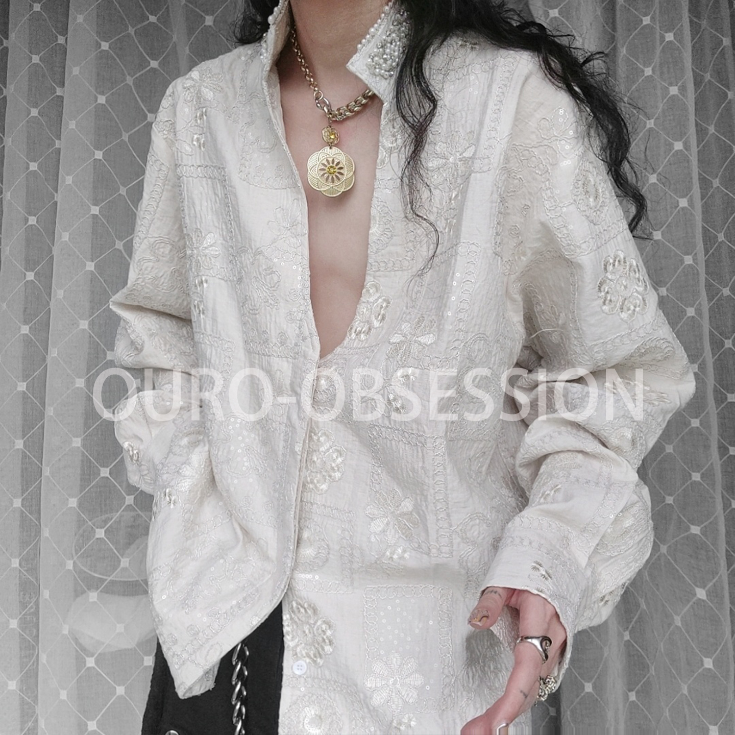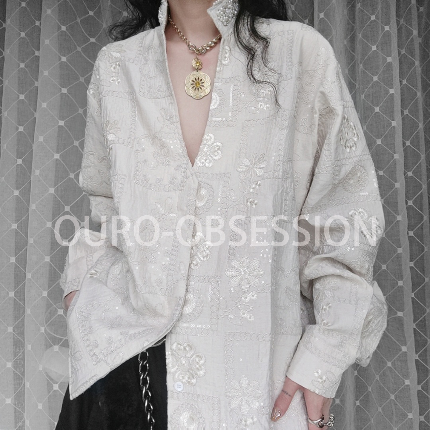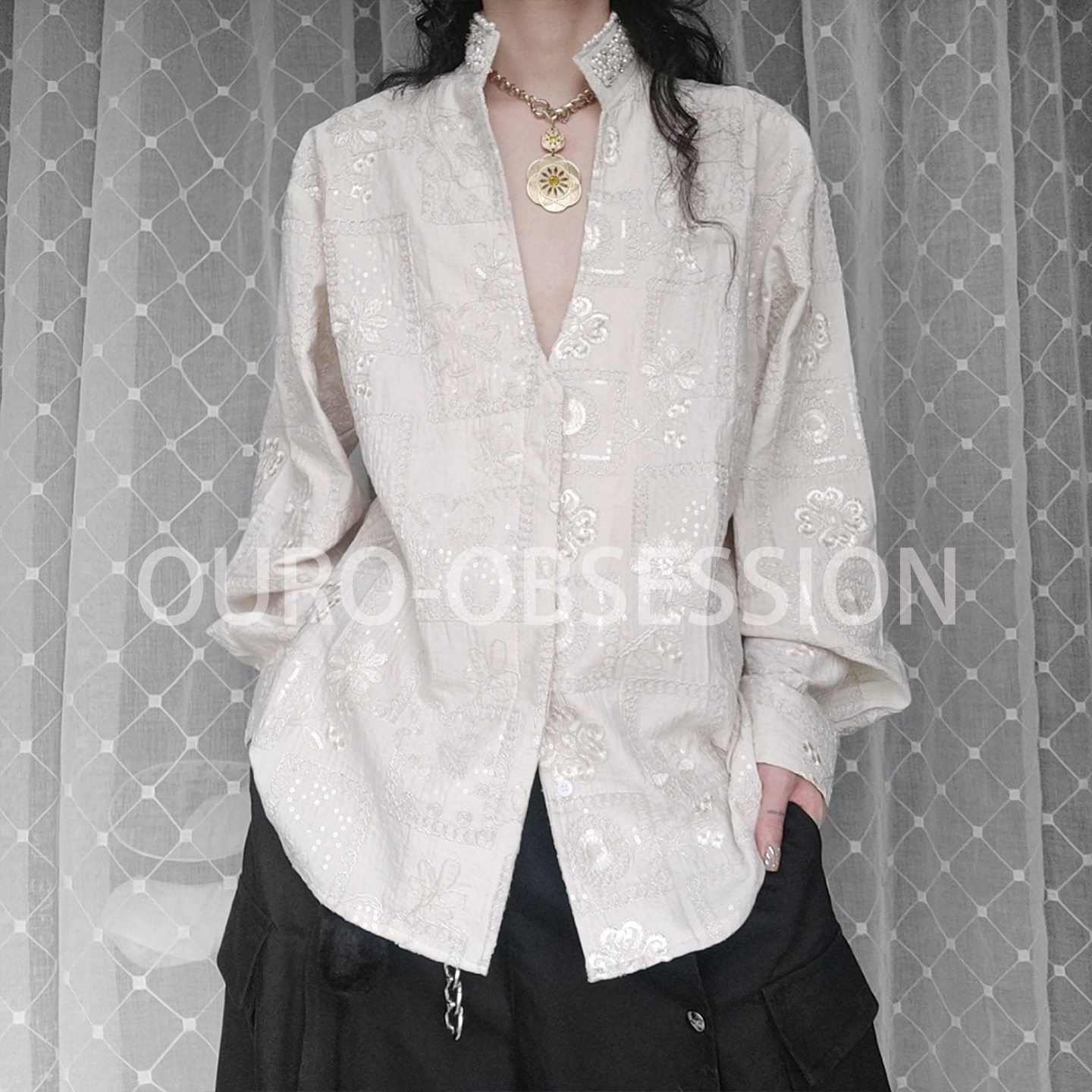 Ouro— "Wandering Poet" Palace-Style Embroidered Texture Embossed Beaded Light Luxury Deep V-Neck Shirt