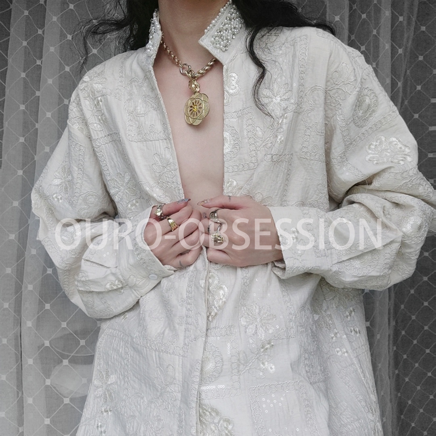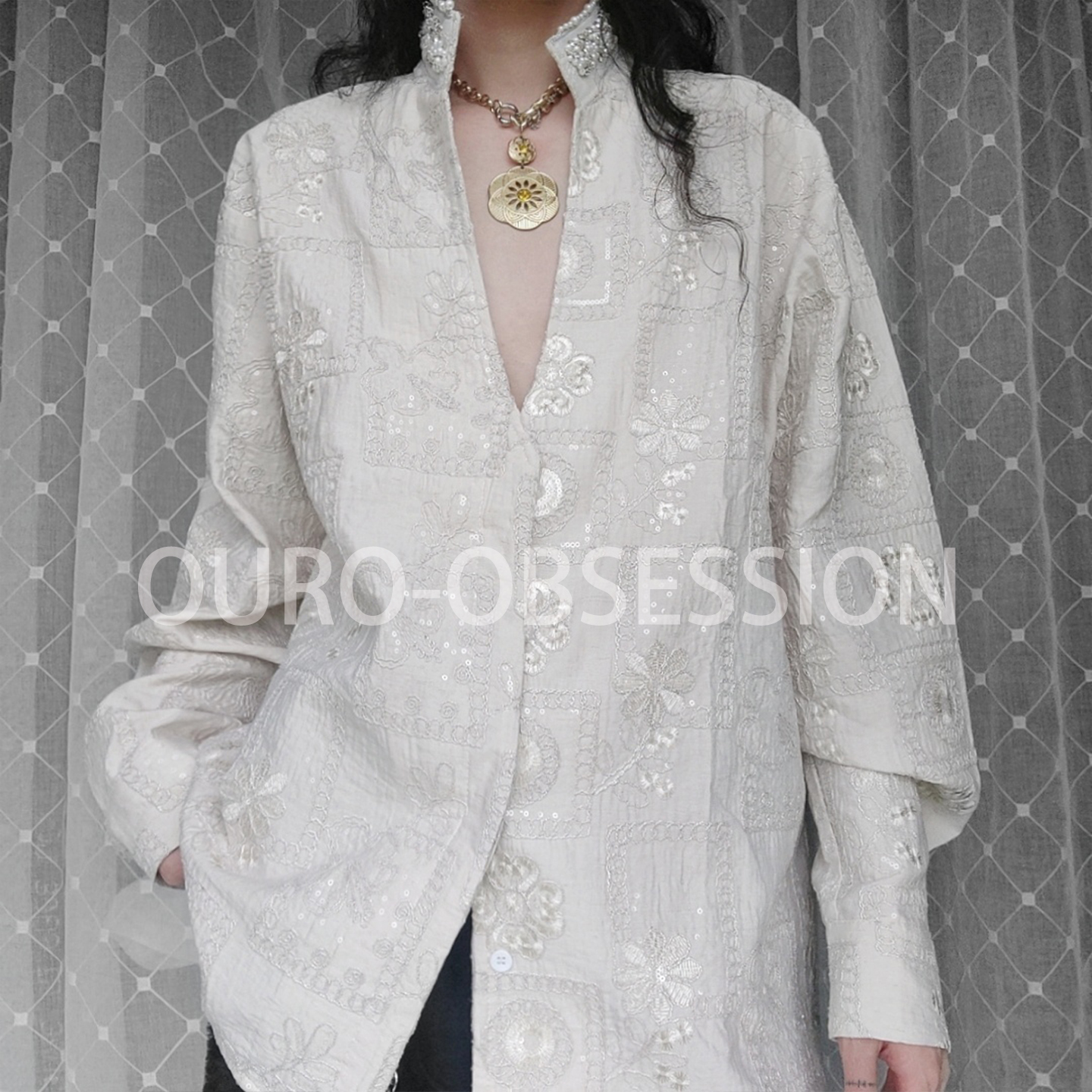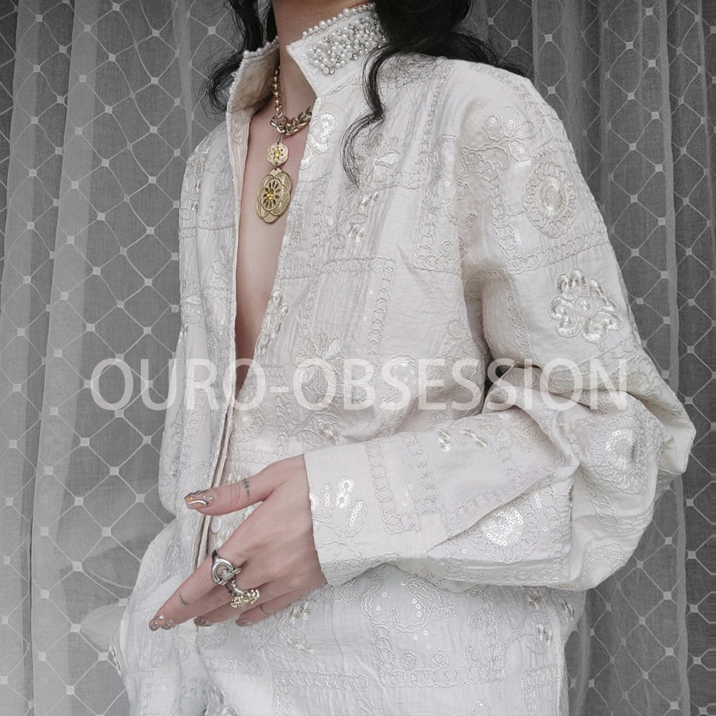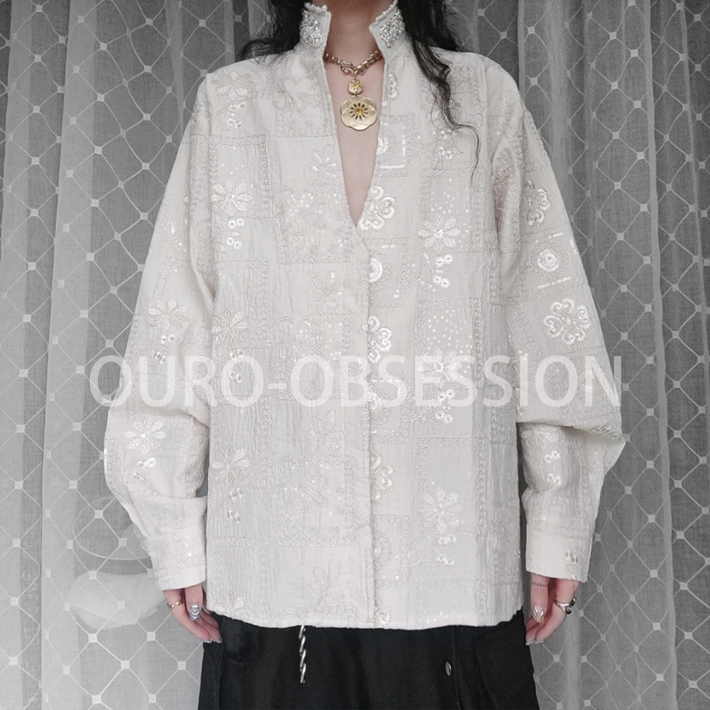 Ouro— "Wandering Poet" Palace-Style Embroidered Texture Embossed Beaded Light Luxury Deep V-Neck Shirt