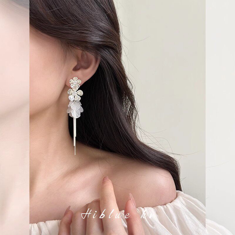 Zircon Flower Shell Seaside Resort Style Tassel Long Earrings for Women with Square and Round Faces, 2025 New Style with a High-End Feel