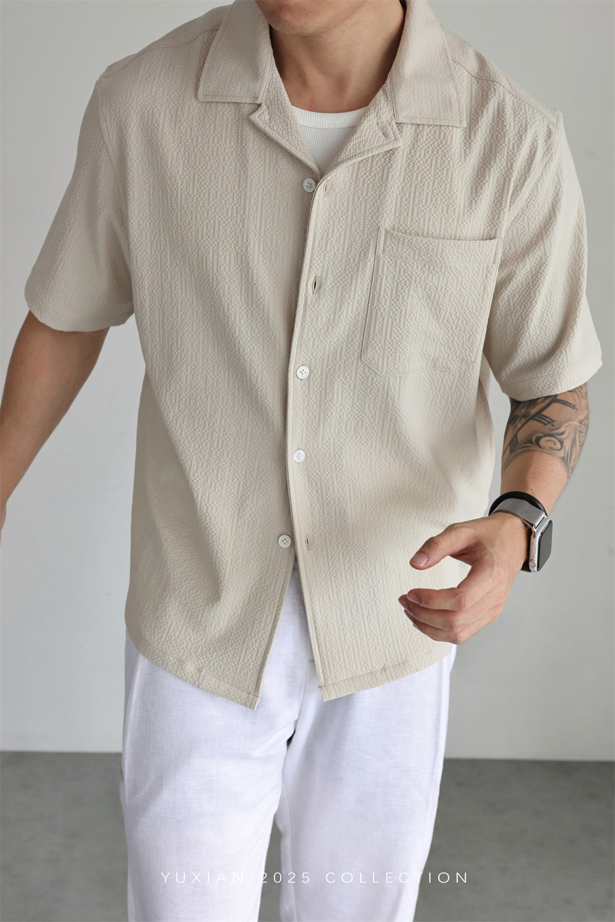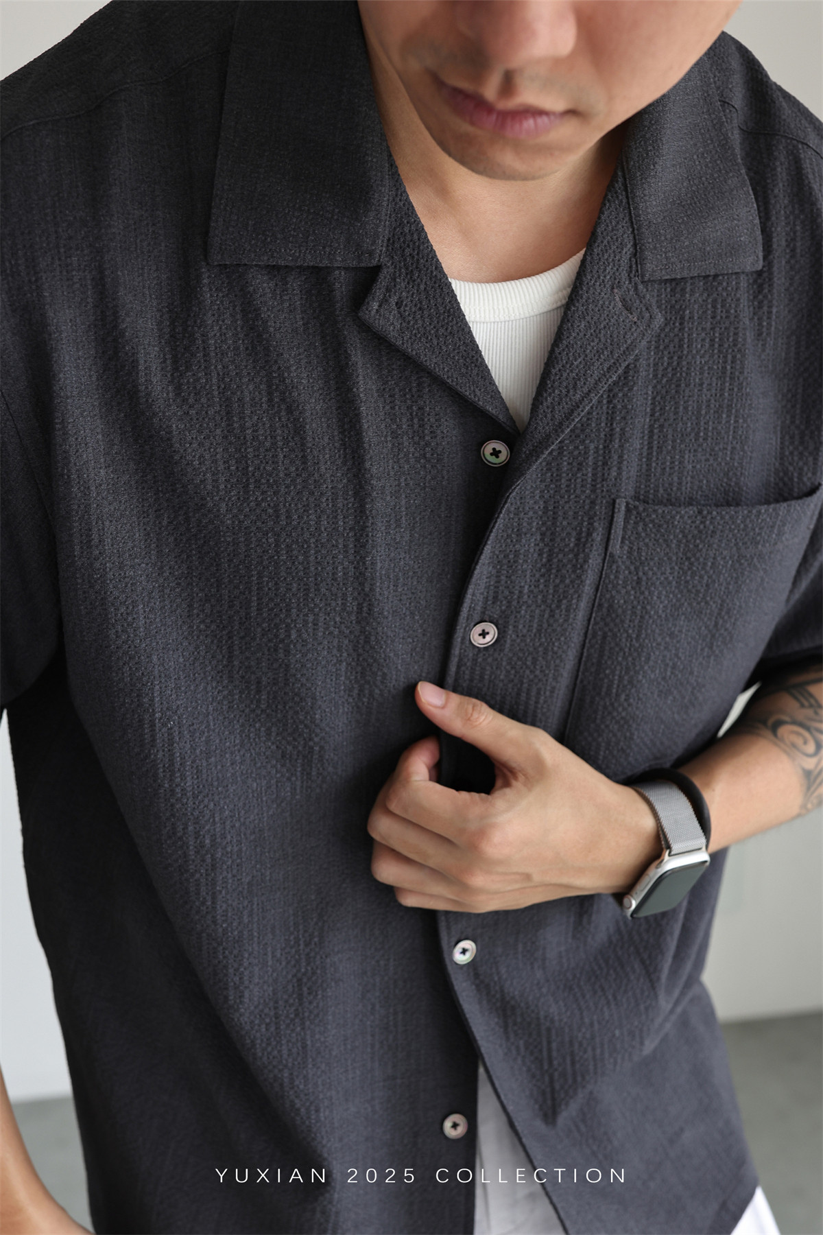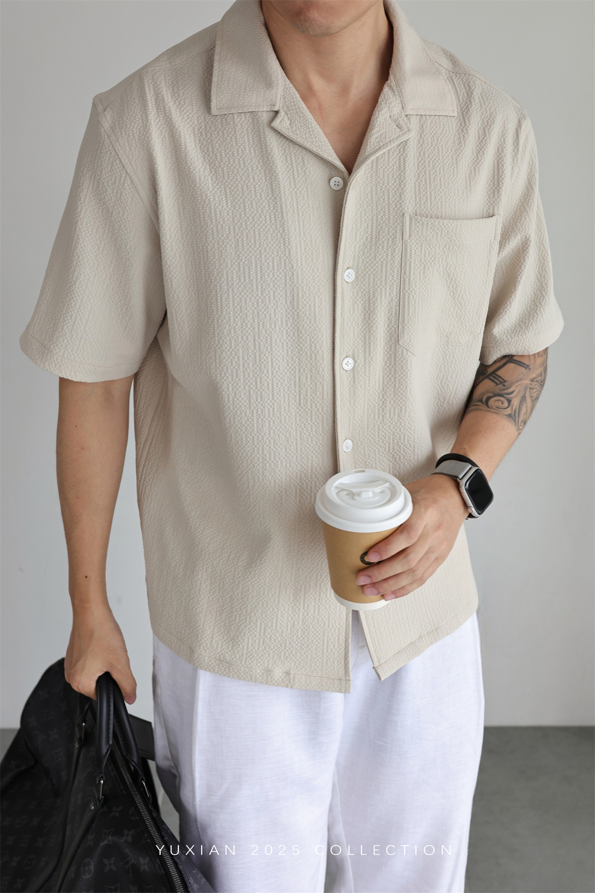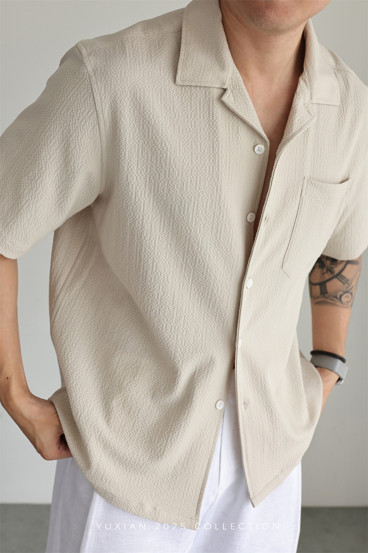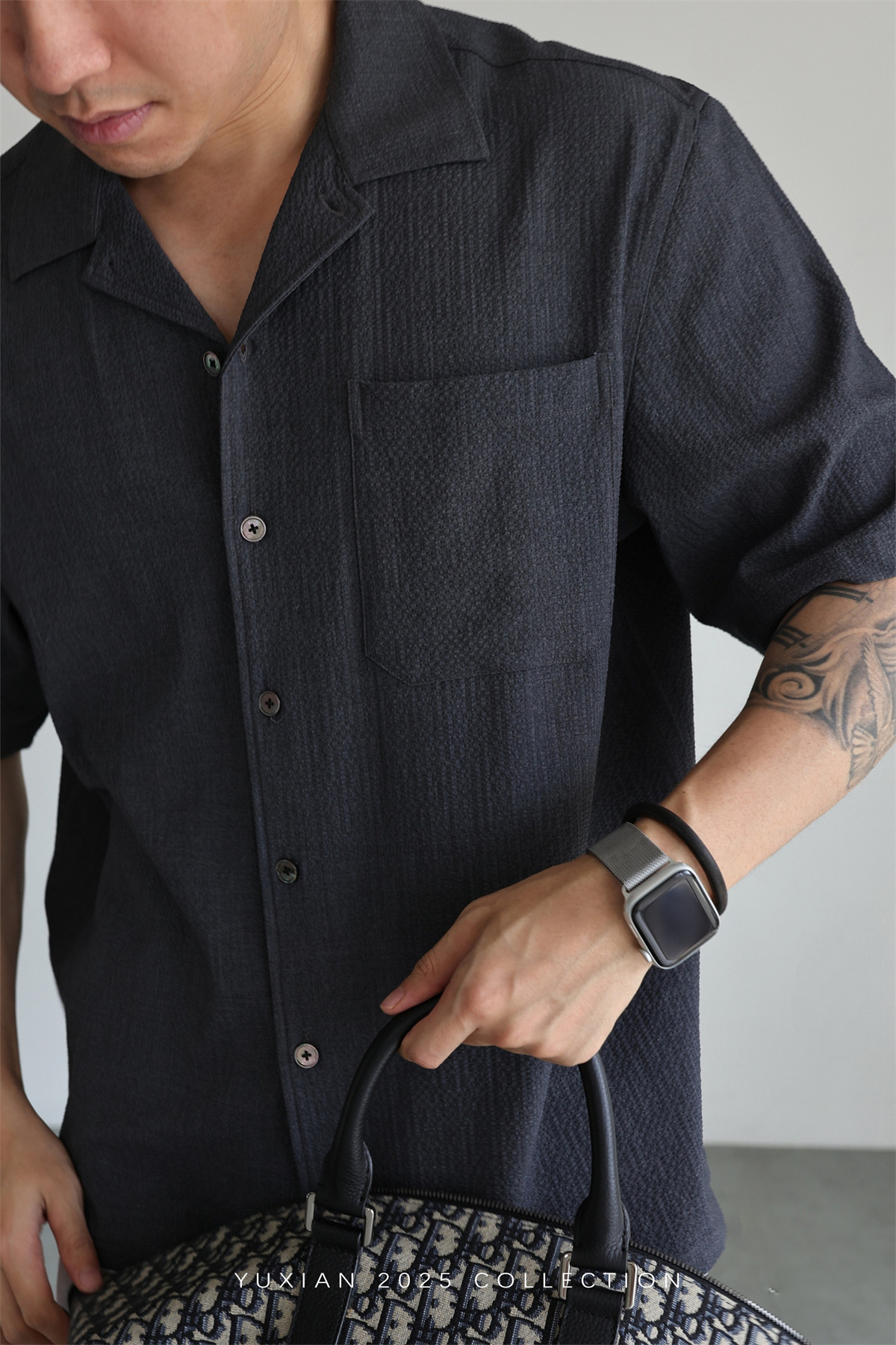 Yuxian Lightweight Seersucker Texture Cuban Collar Short-Sleeve Shirt with Pockets, Moisture-Wicking, Breathable, Loose-Fitting, Casual Vacation Men's Shirt