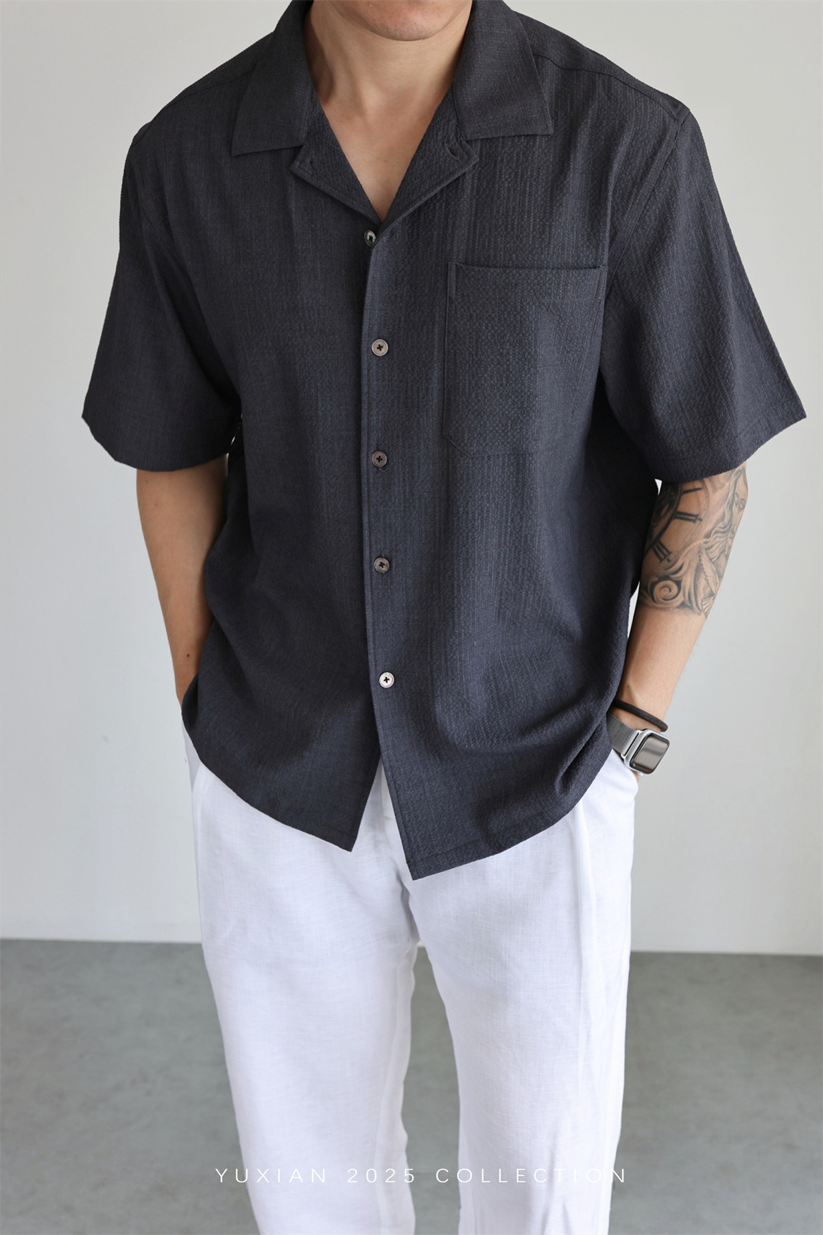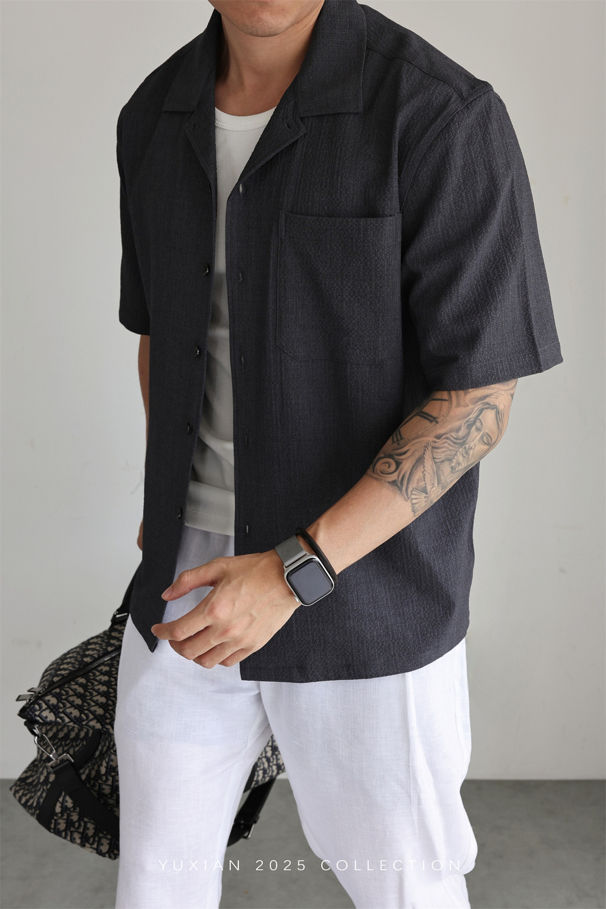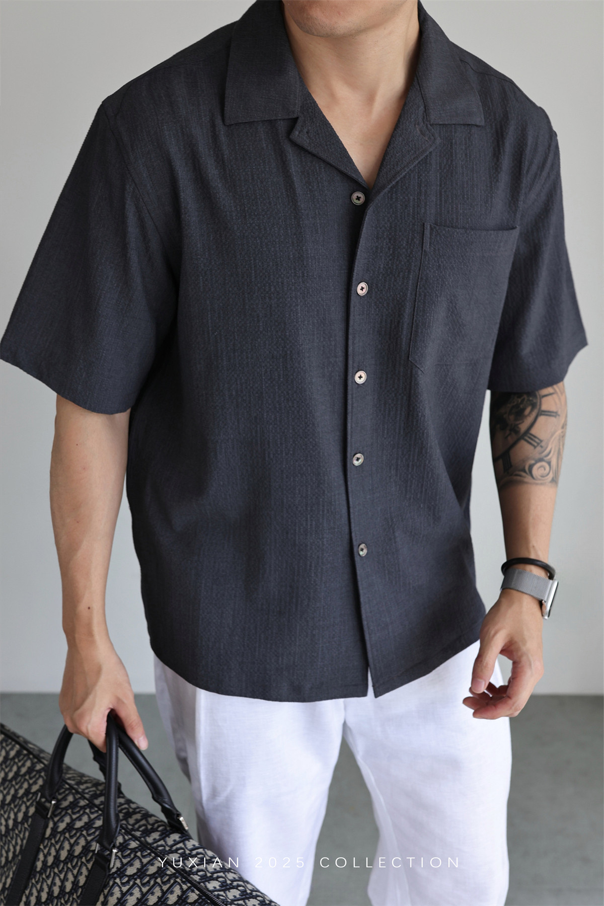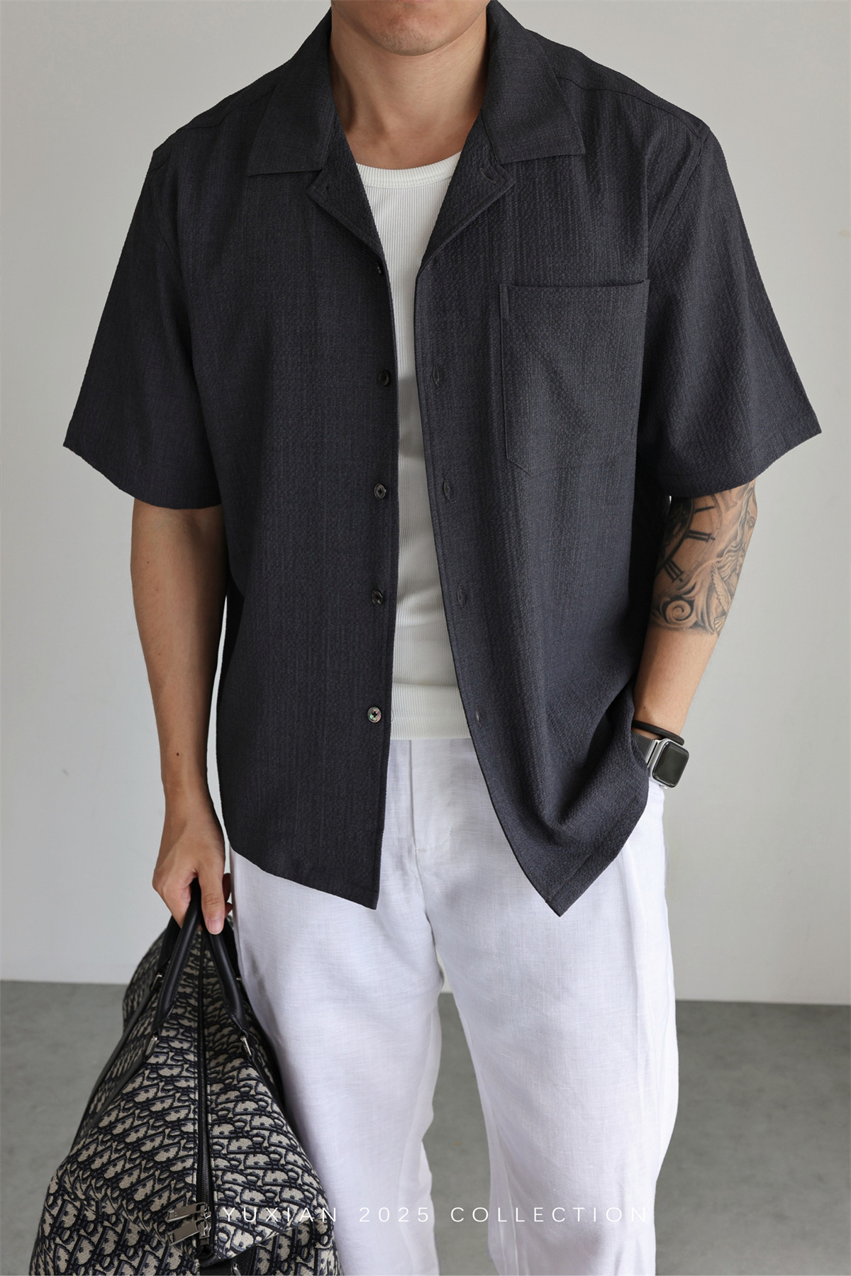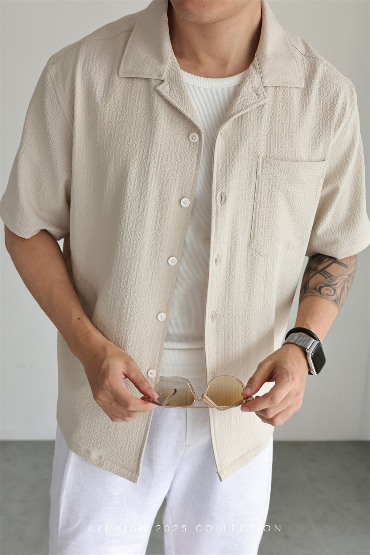 Yuxian Lightweight Seersucker Texture Cuban Collar Short-Sleeve Shirt with Pockets, Moisture-Wicking, Breathable, Loose-Fitting, Casual Vacation Men's Shirt