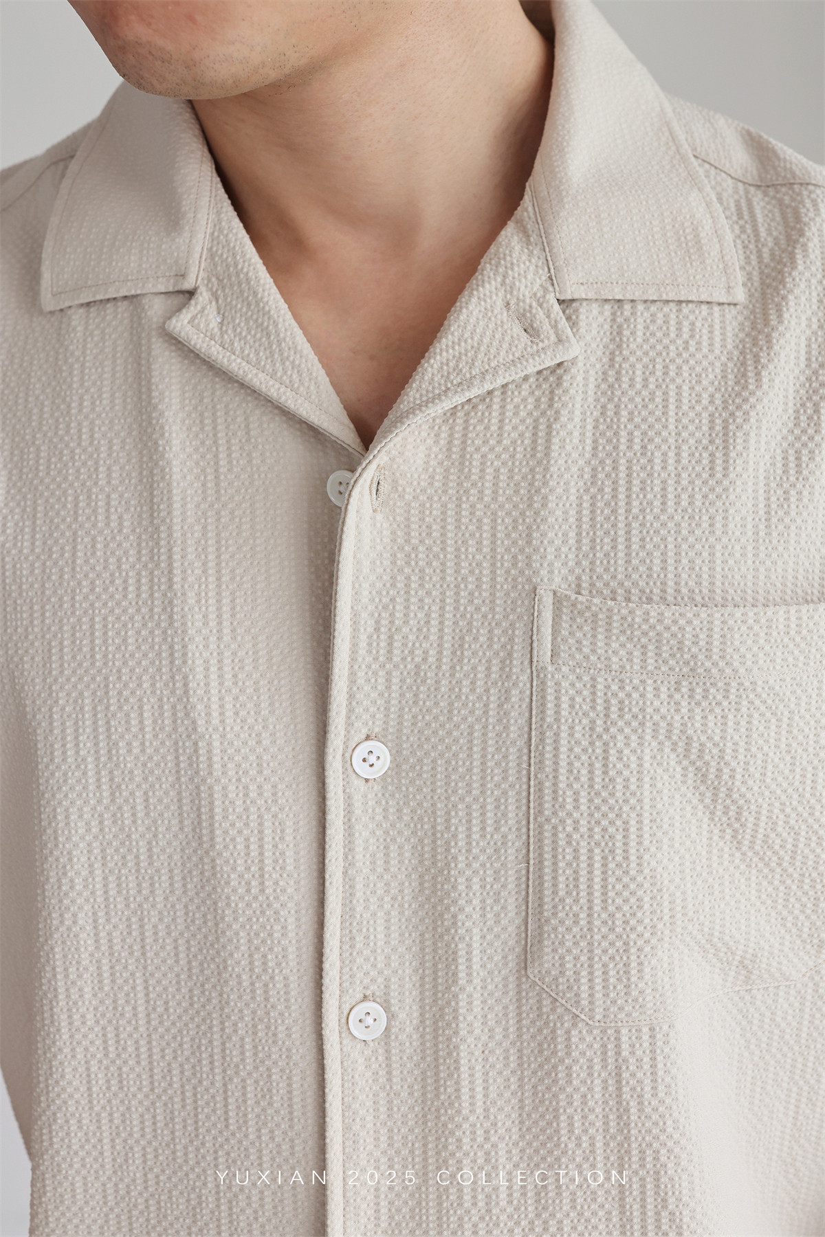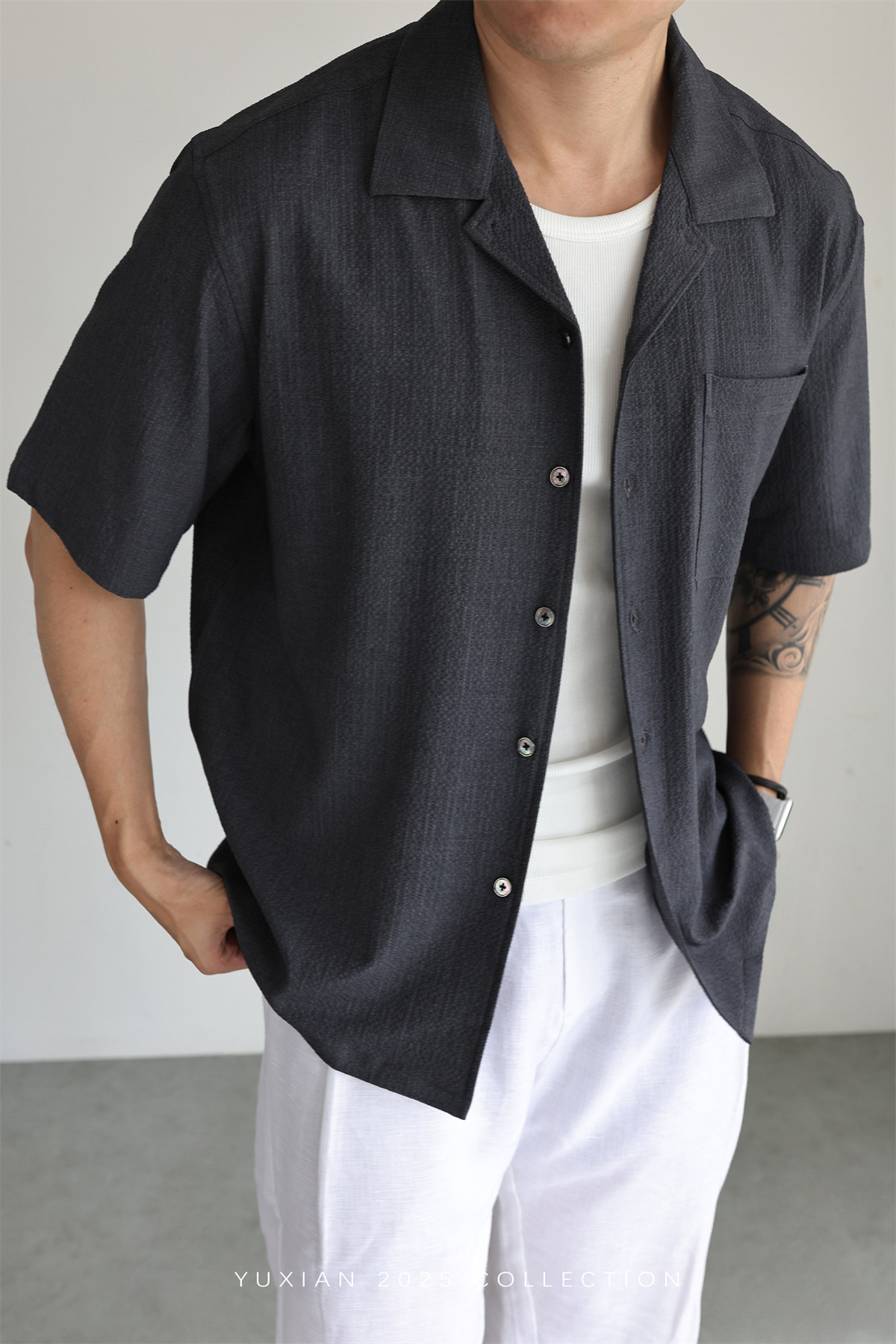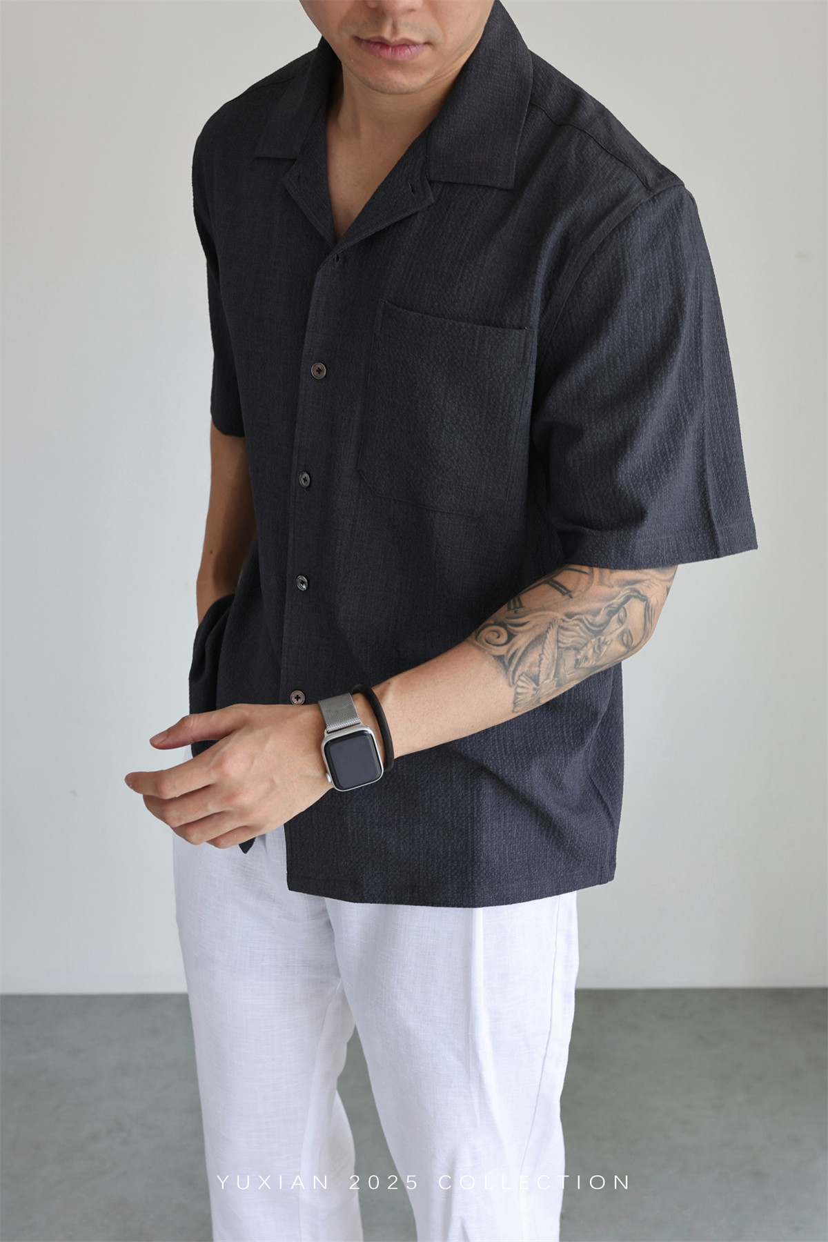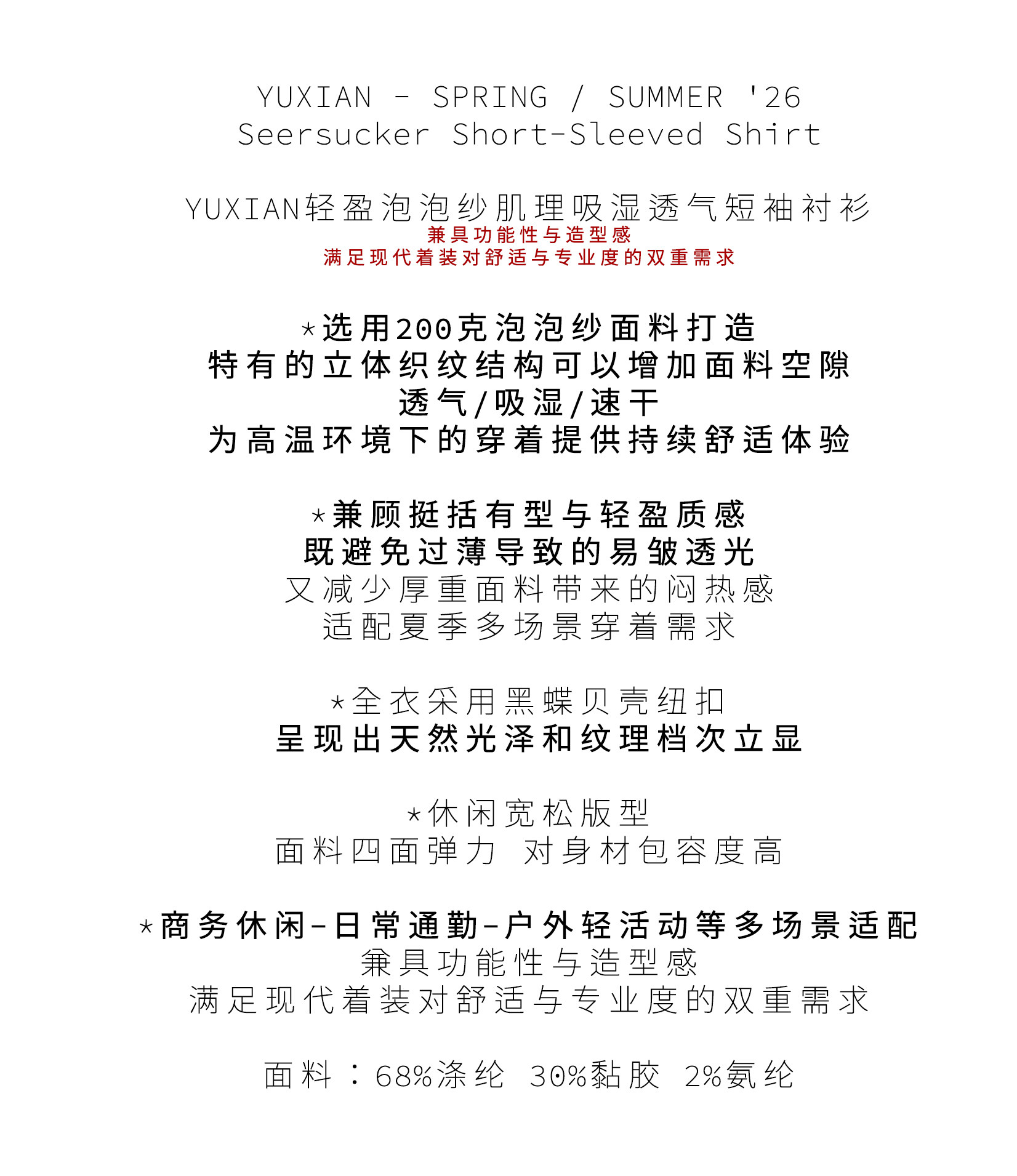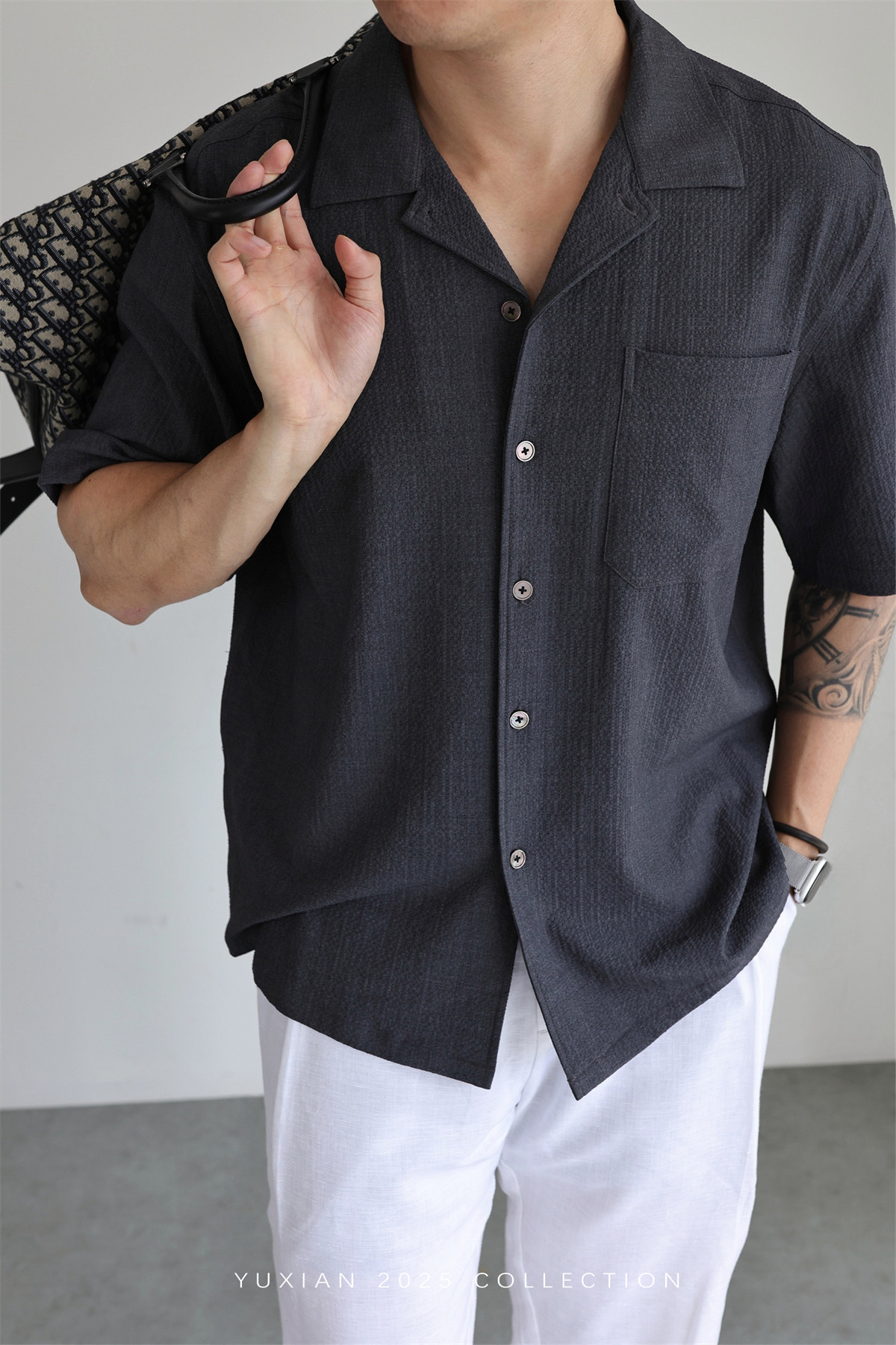 Yuxian Lightweight Seersucker Texture Cuban Collar Short-Sleeve Shirt with Pockets, Moisture-Wicking, Breathable, Loose-Fitting, Casual Vacation Men's Shirt