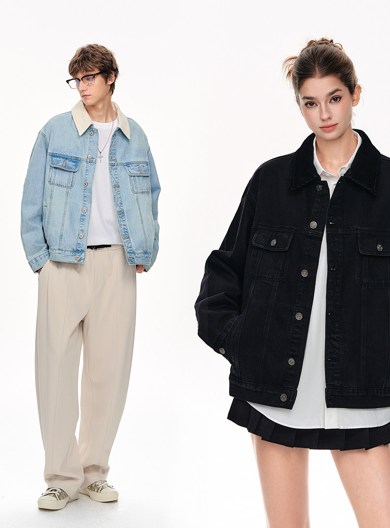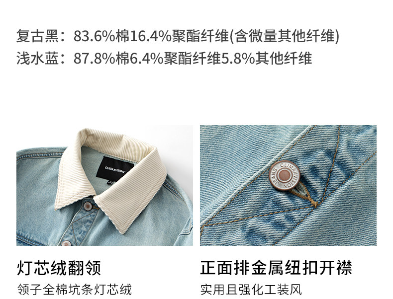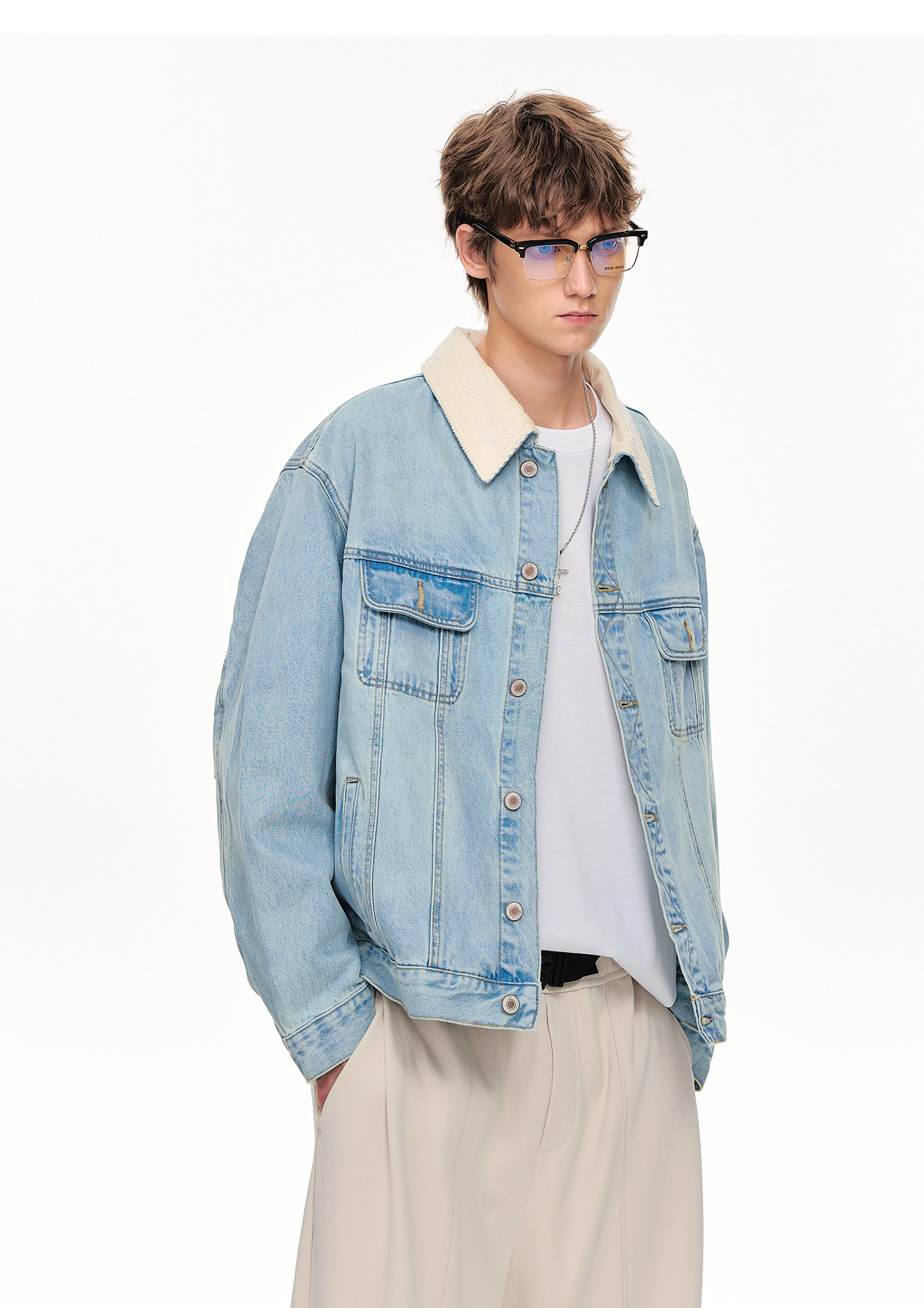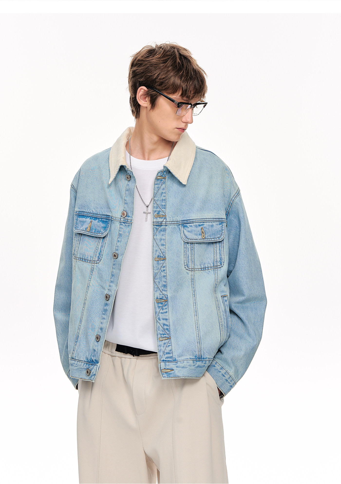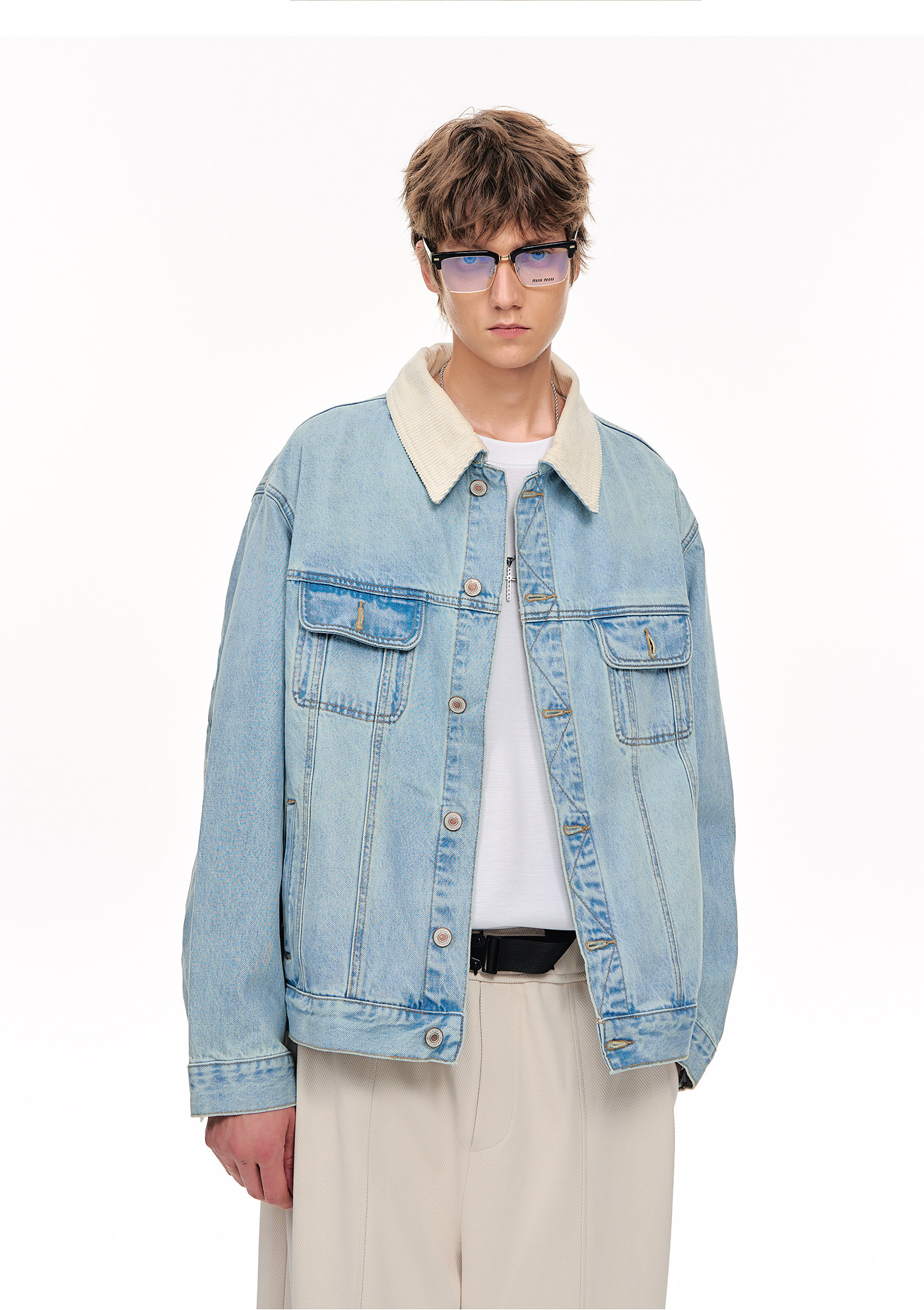 Climax Vision Classic Retro Corduroy Lapel Silhouette Washed Distressed Denim Jacket