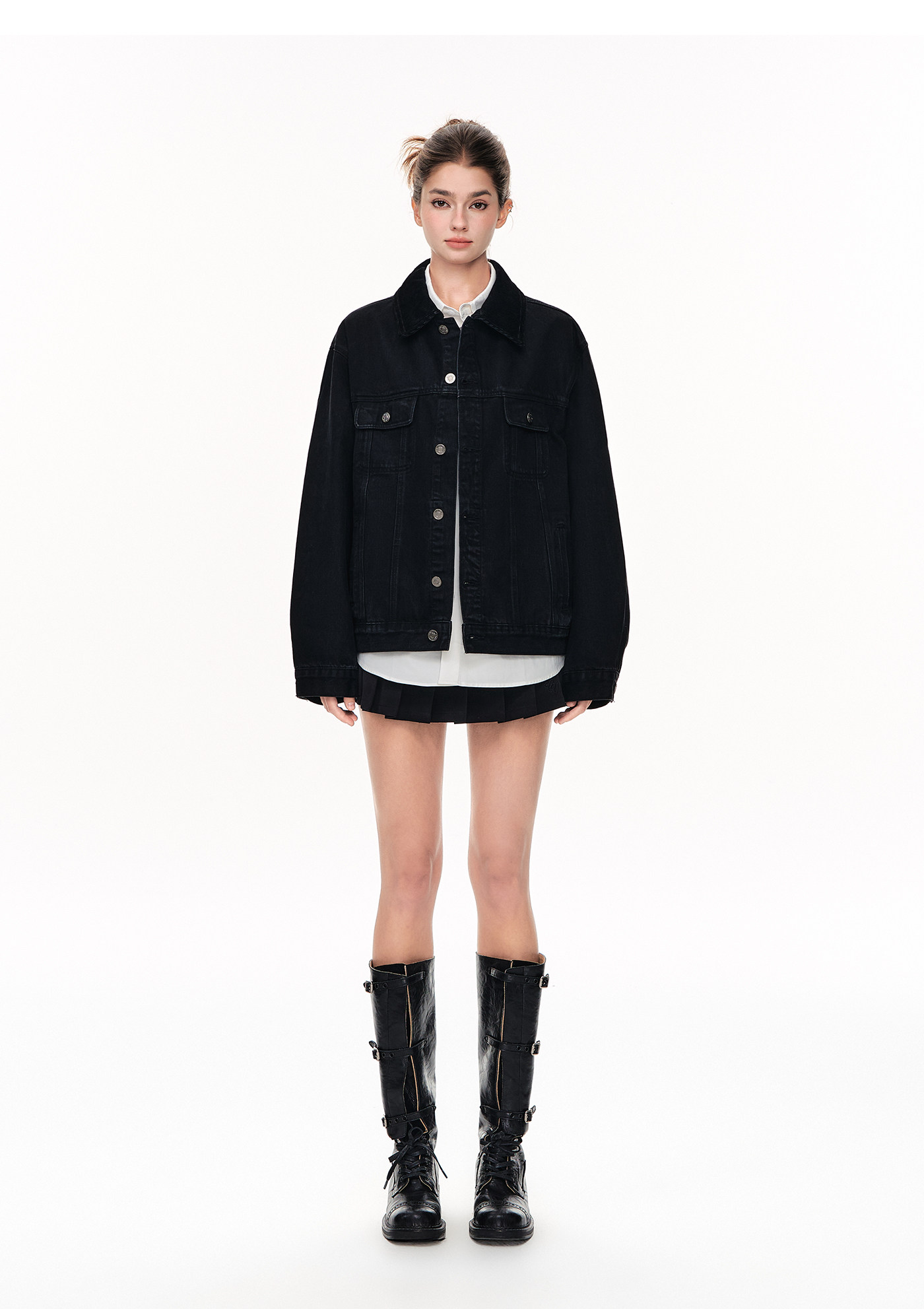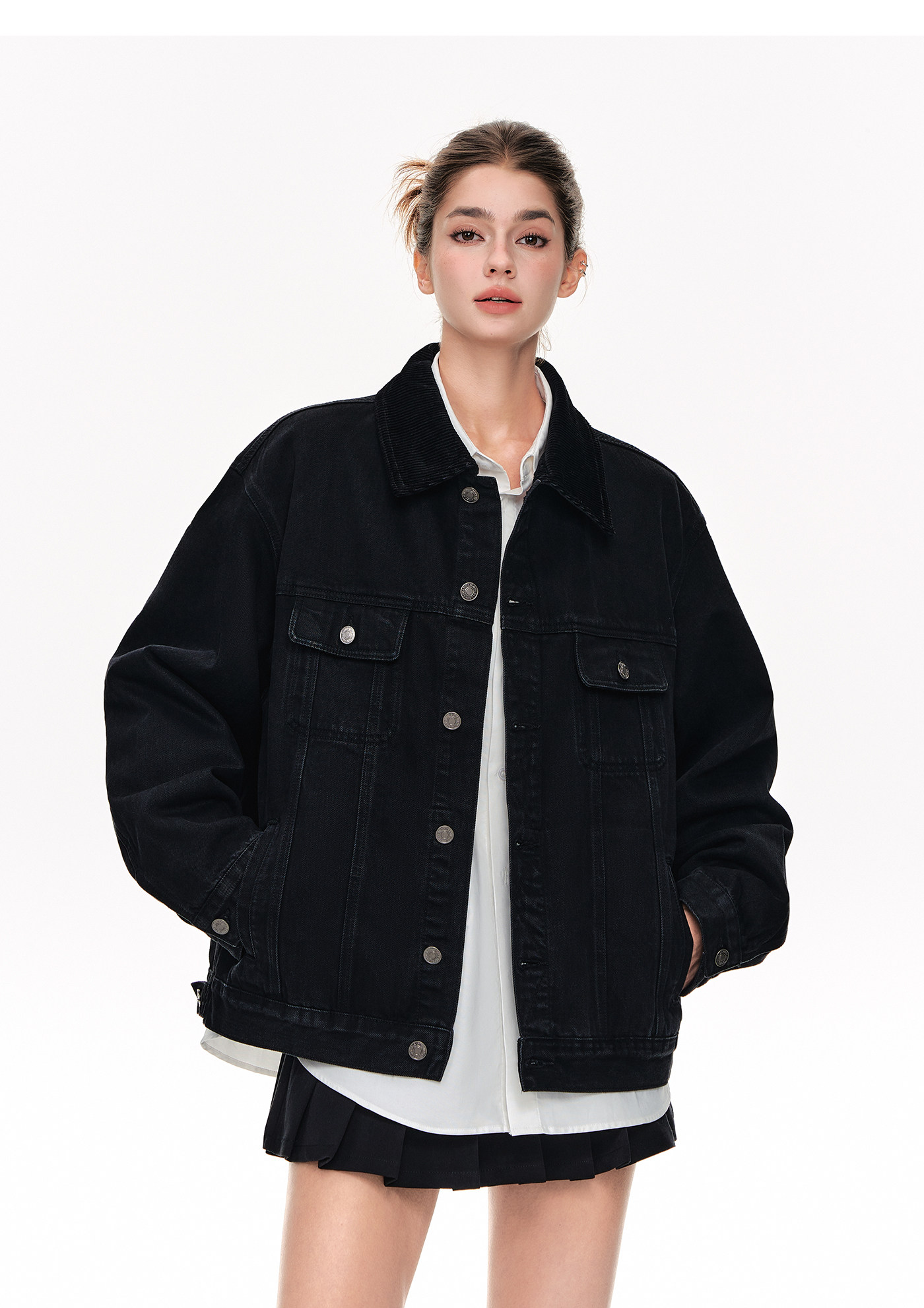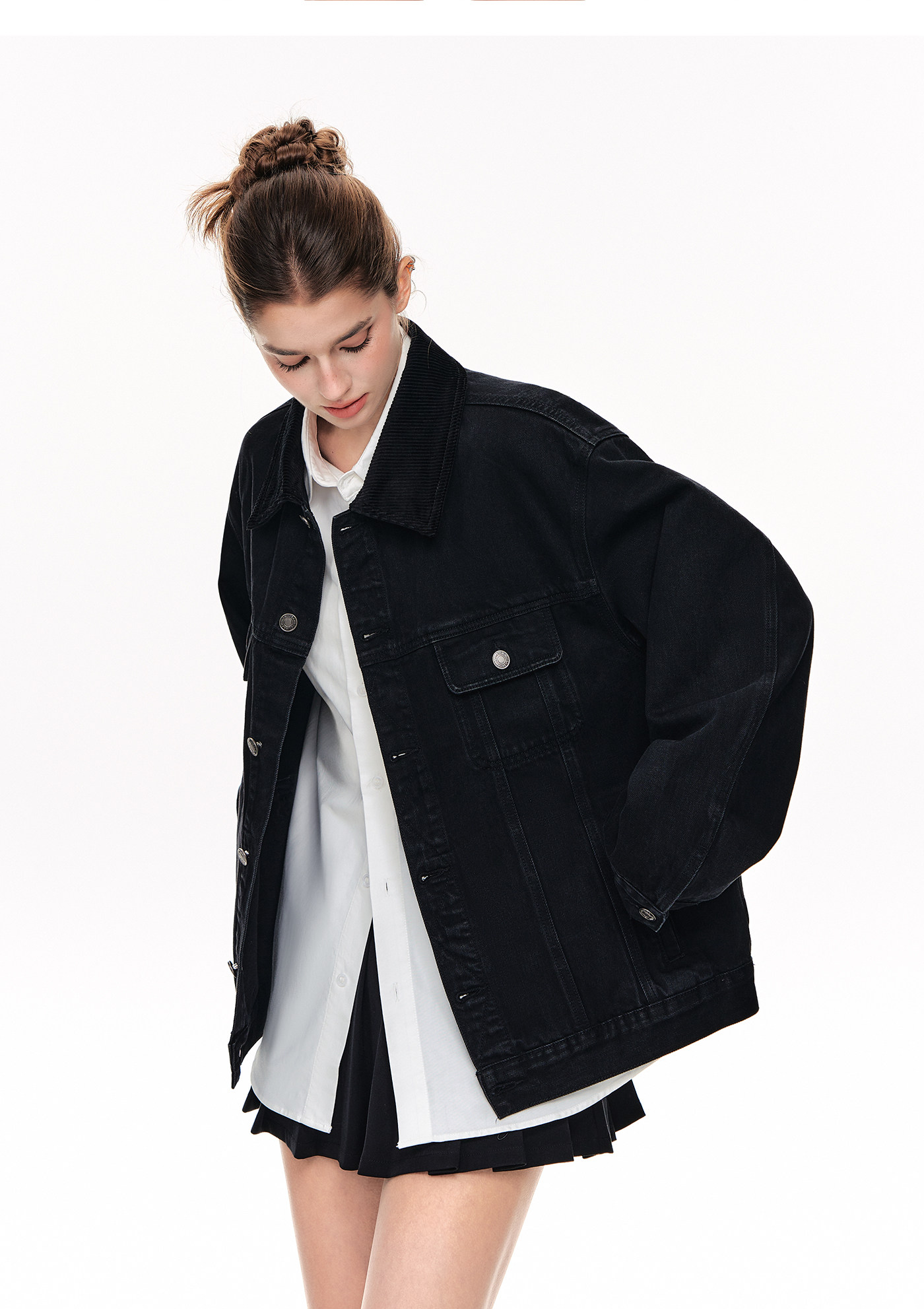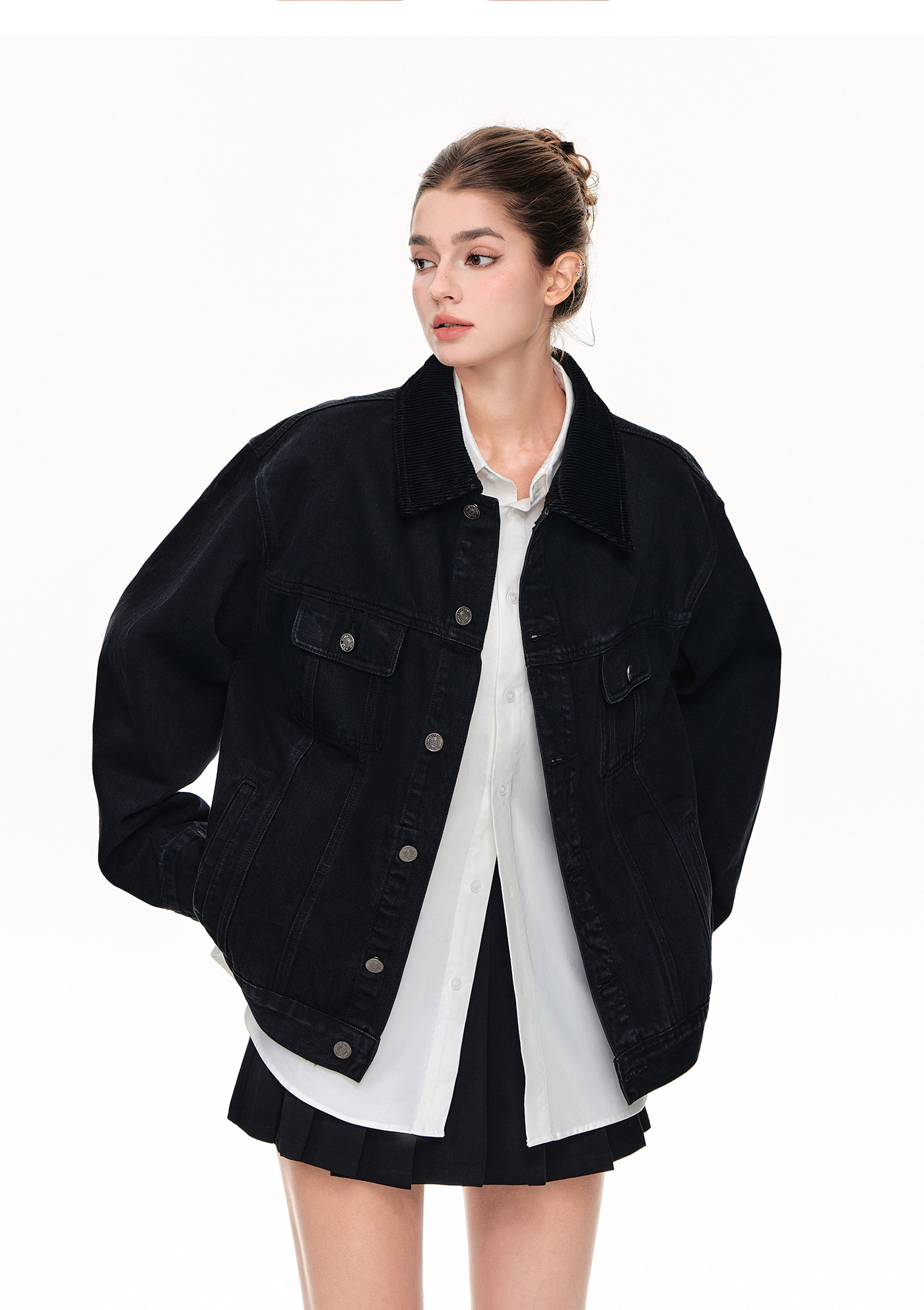 Climax Vision Classic Retro Corduroy Lapel Silhouette Washed Distressed Denim Jacket
