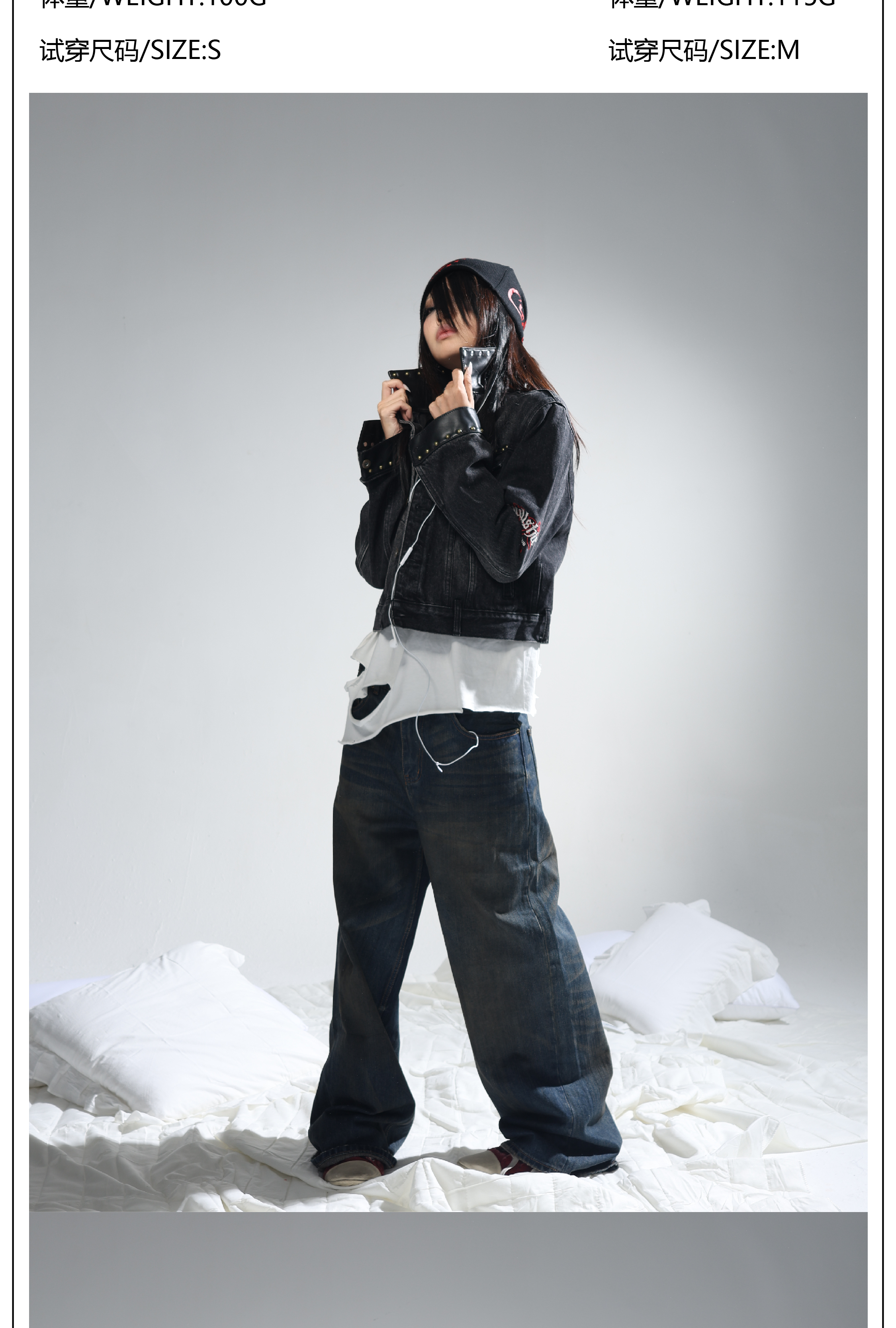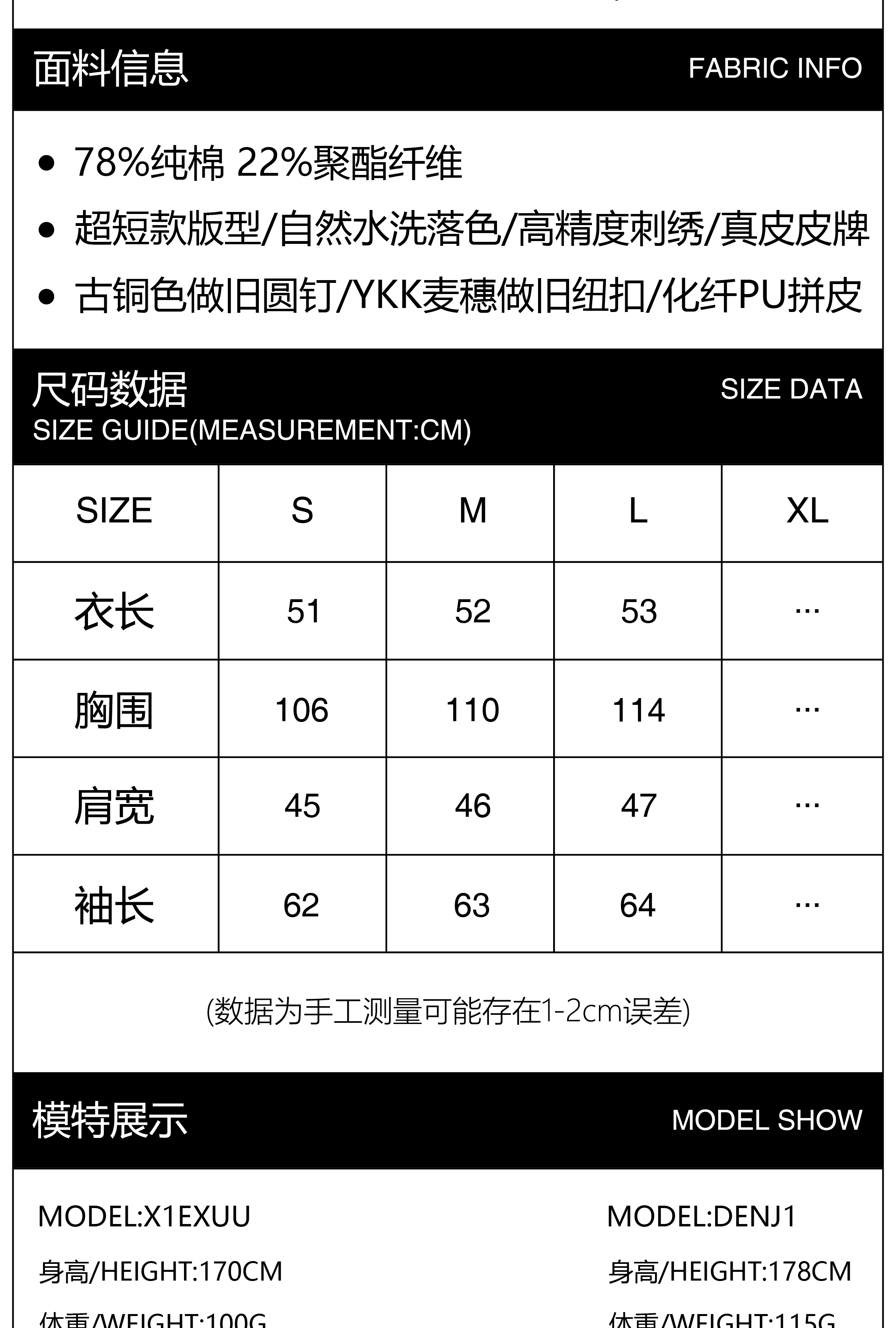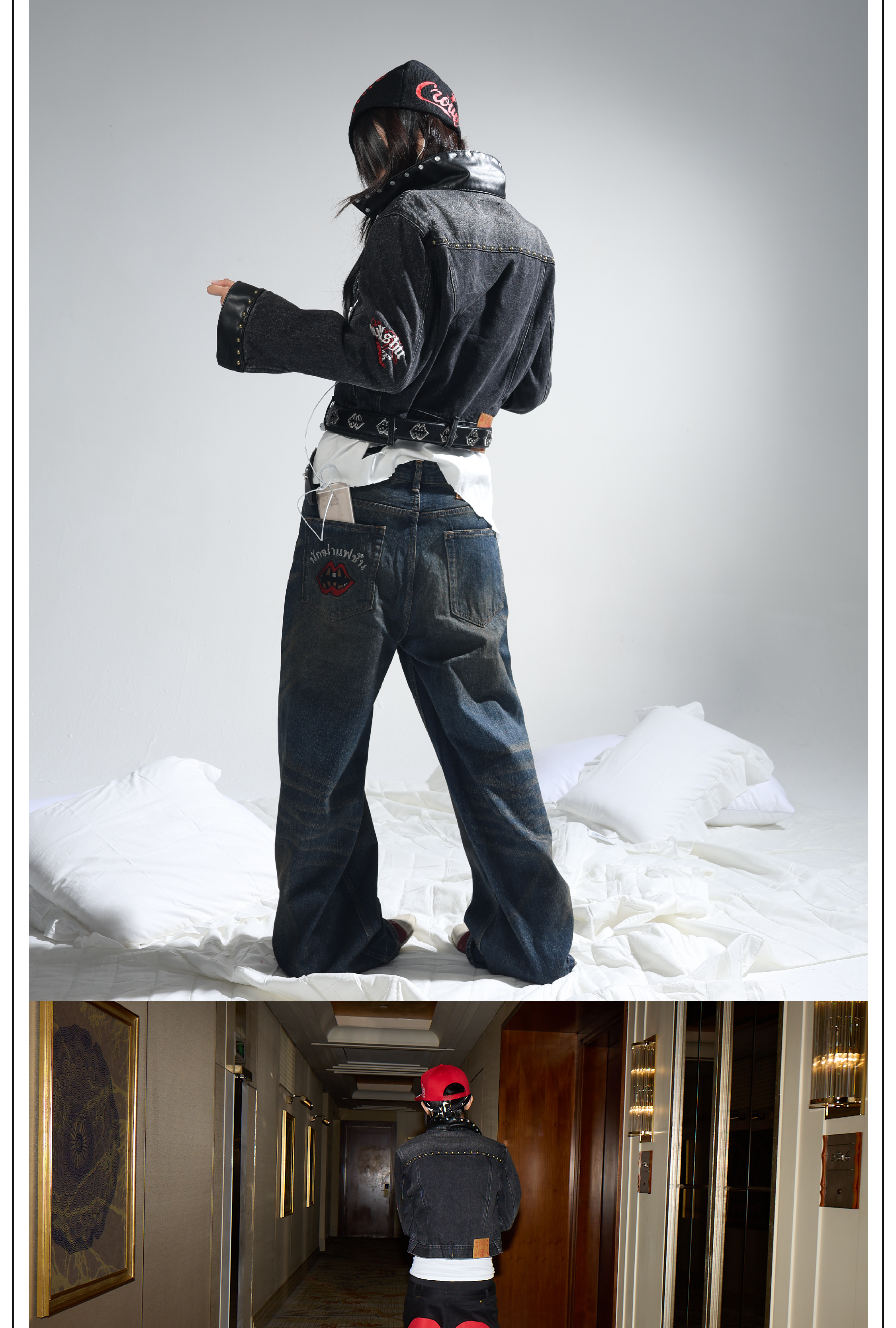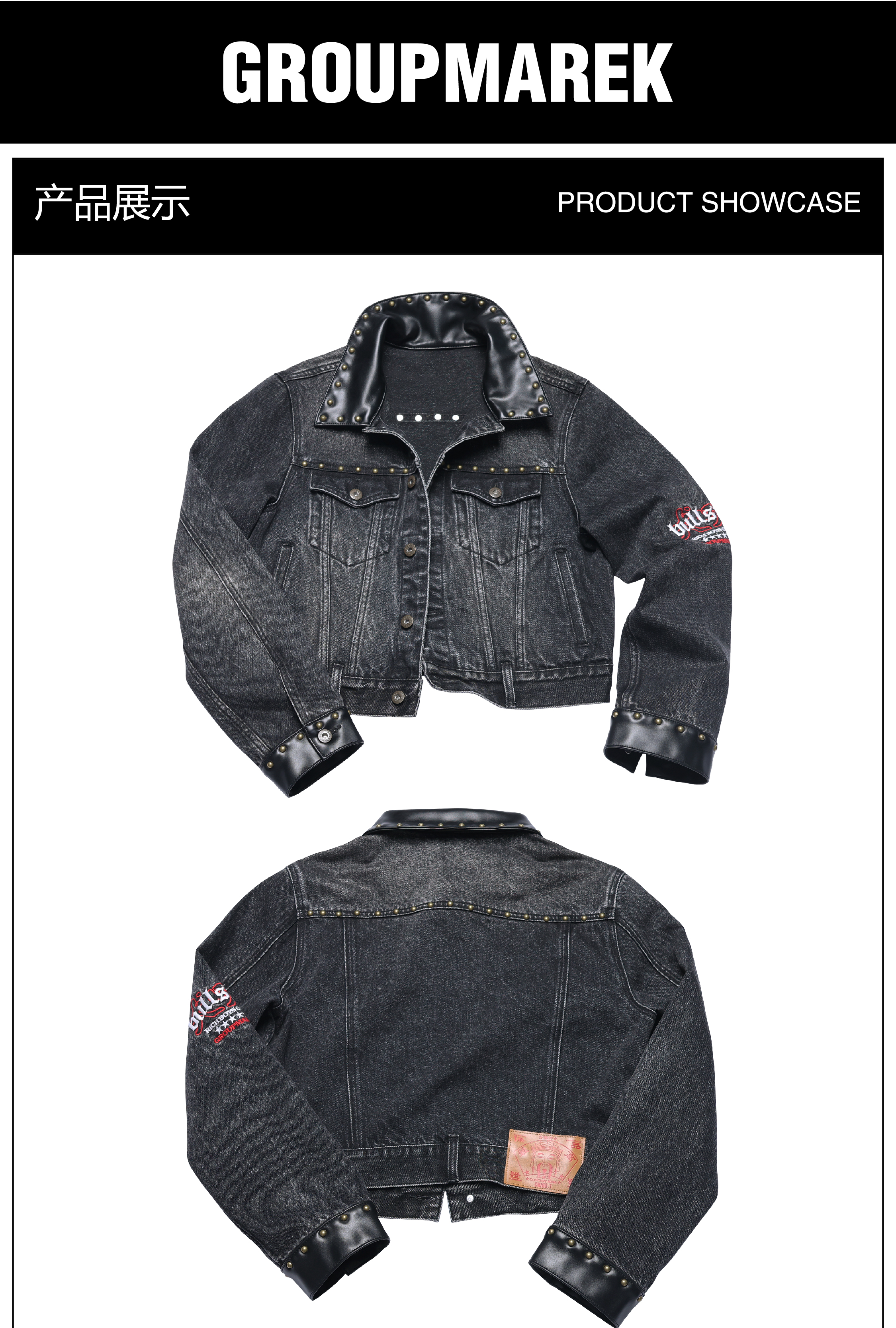 Groupmarek[Gmk] Black Washed Embroidered Studded Leather Patchwork Short Denim Jacket
