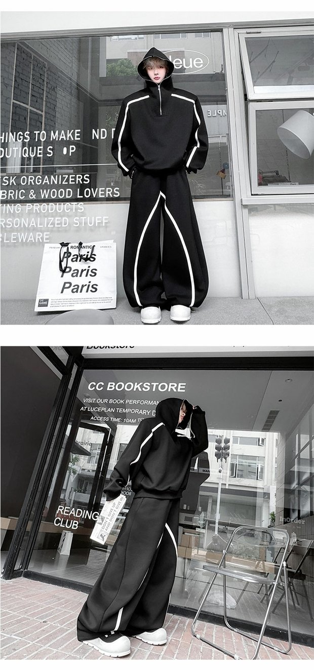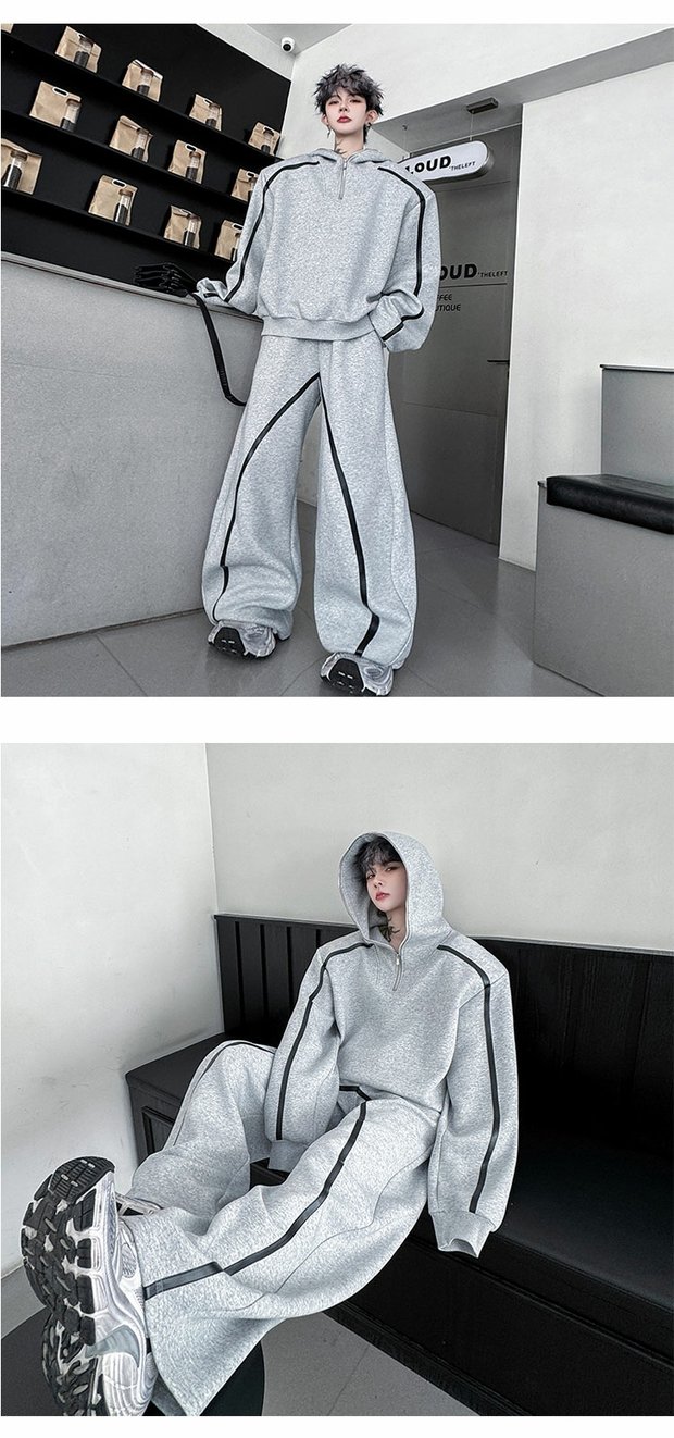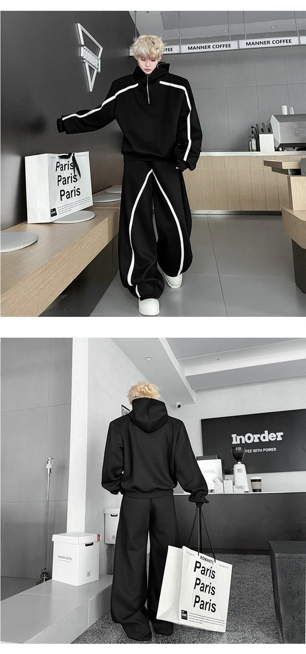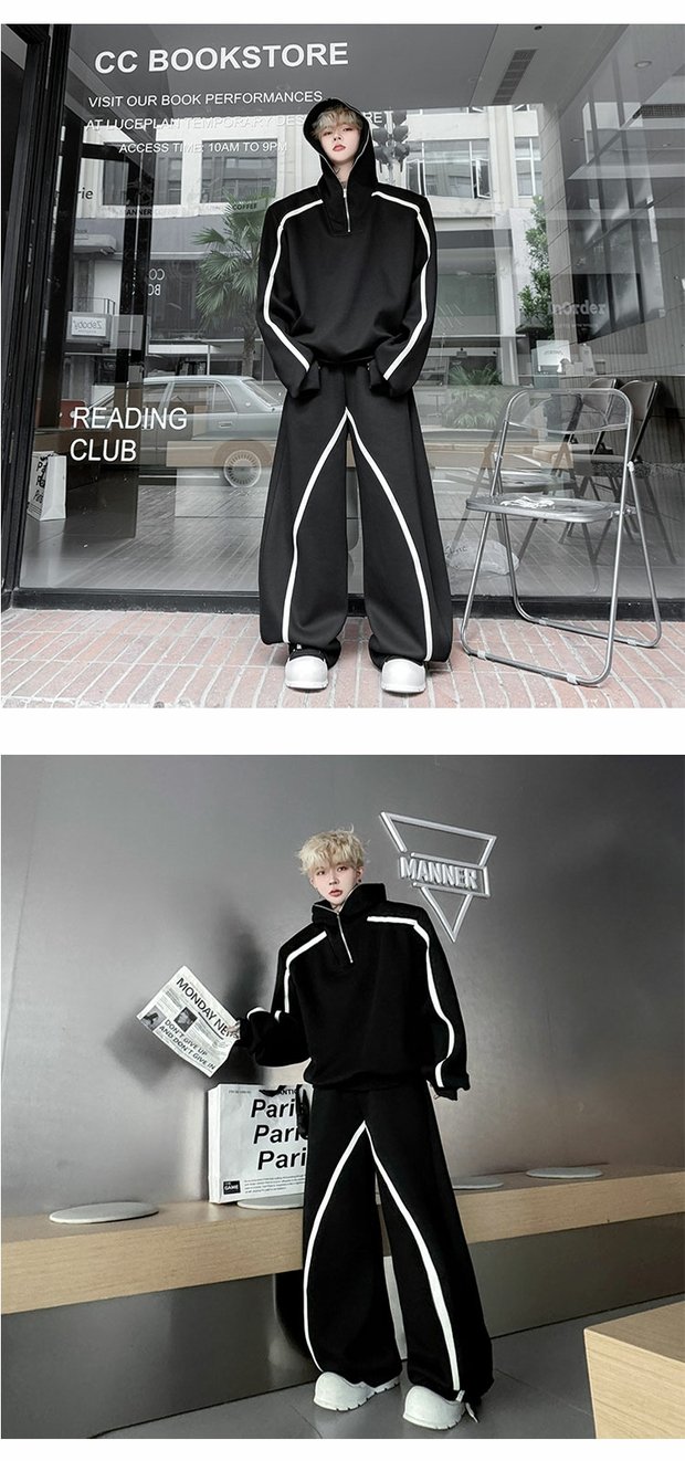 Autumn American High Street Color-Block Half-Zip Hooded Sweatshirt Set for Men, Cool and Sporty Casual Wide-Leg Pants