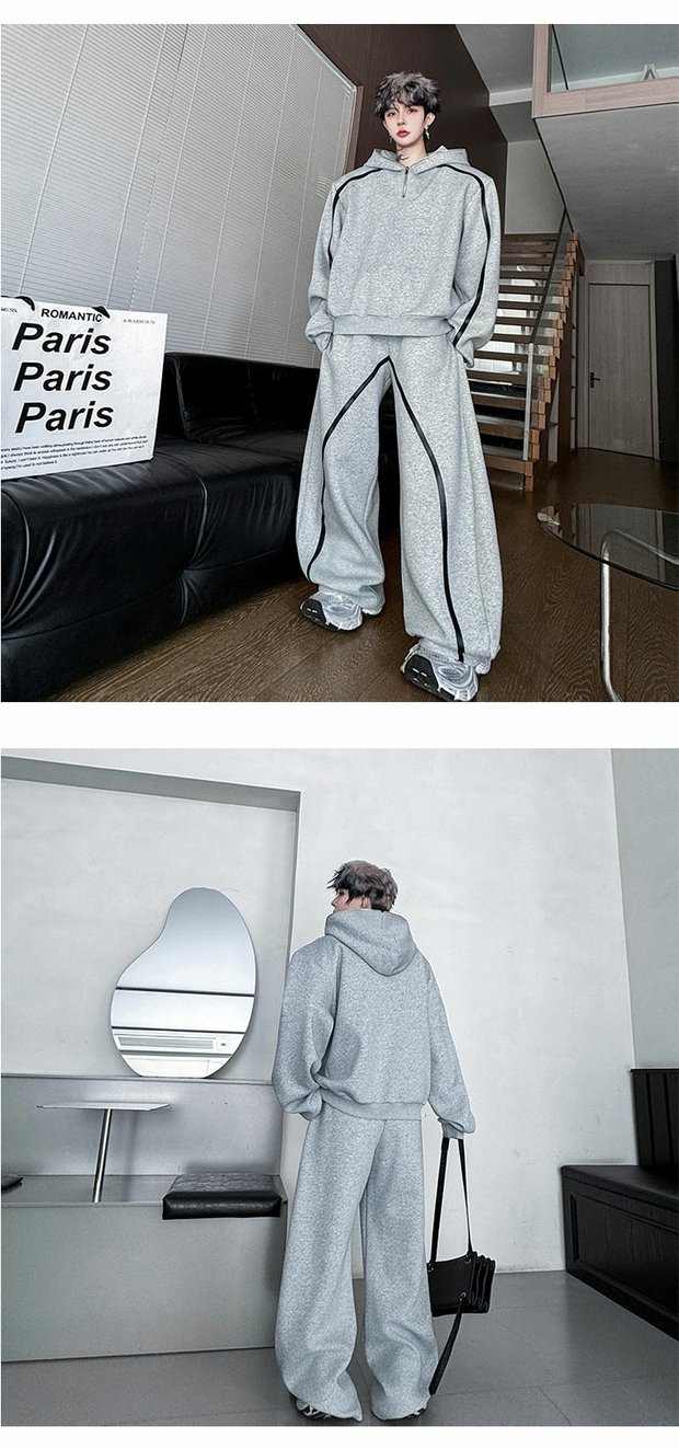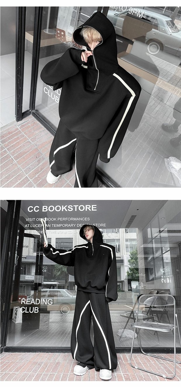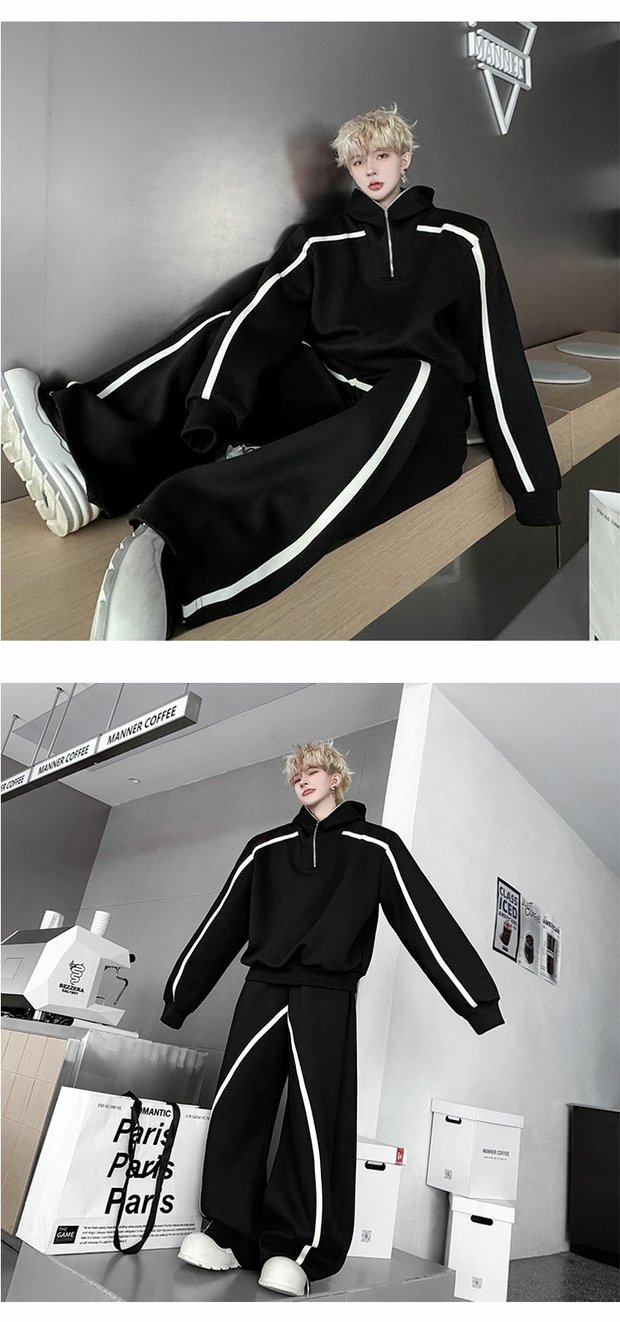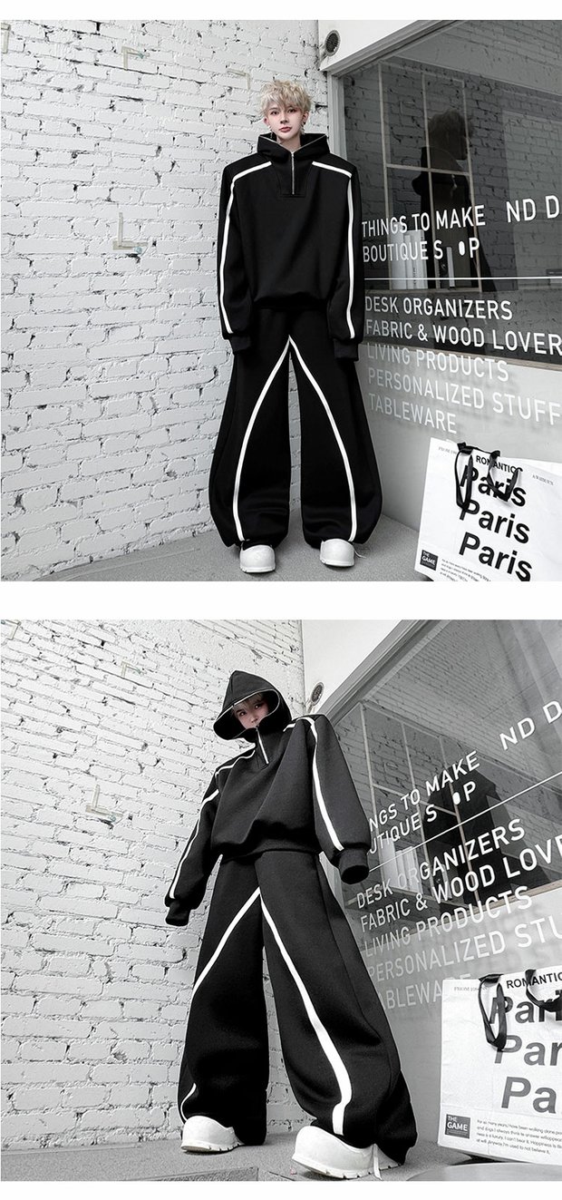 Autumn American High Street Color-Block Half-Zip Hooded Sweatshirt Set for Men, Cool and Sporty Casual Wide-Leg Pants