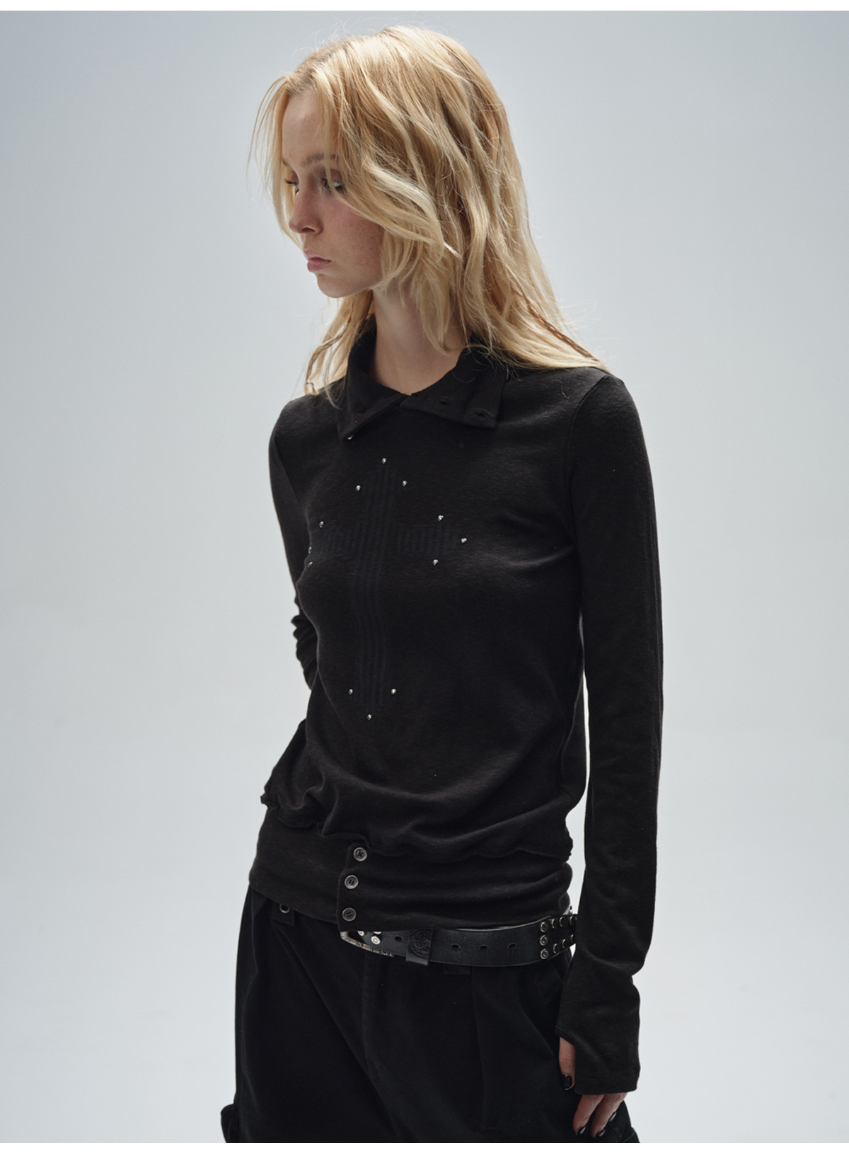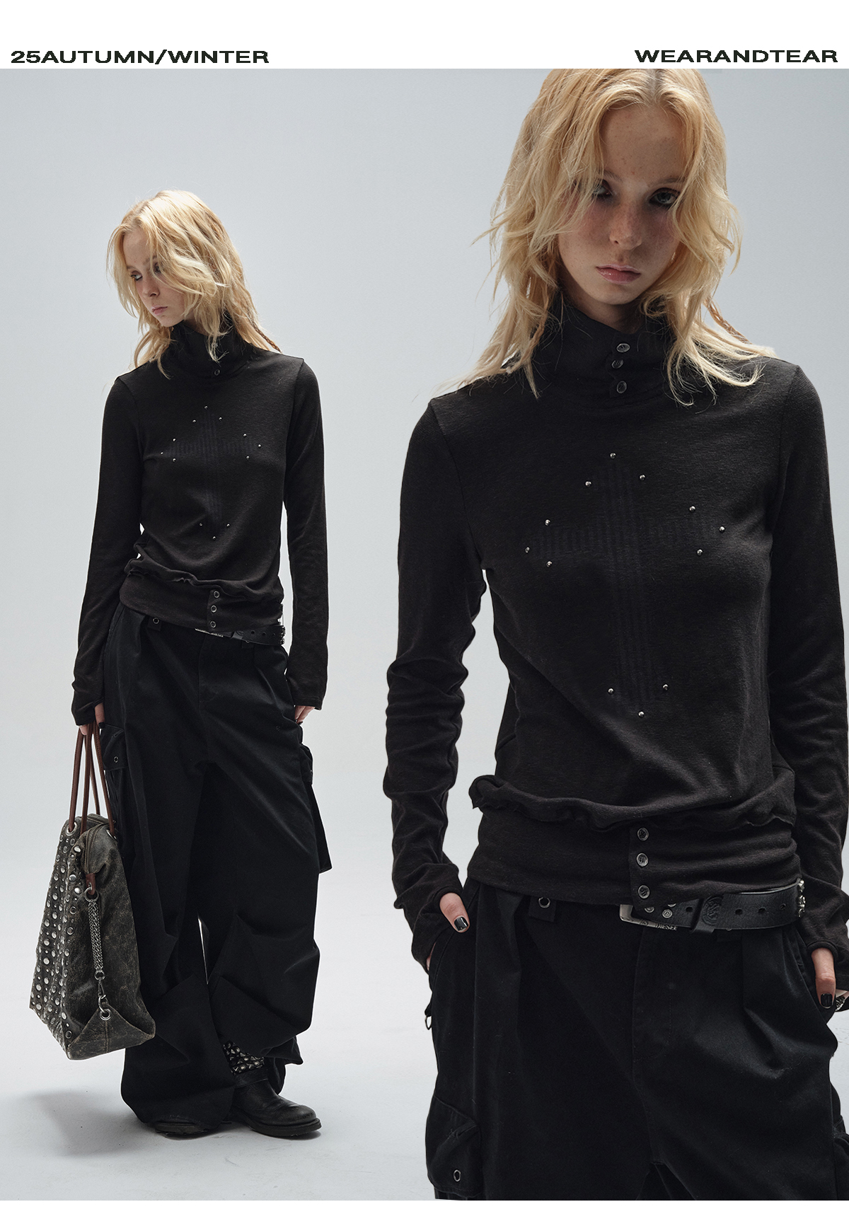 Wearandtear High-Neck Frayed Edge Dark-Tone Printed Rhinestone Embellished Fingerless Stretchy Slim-Fit Punk Long-Sleeve T-Shirt Base Layer