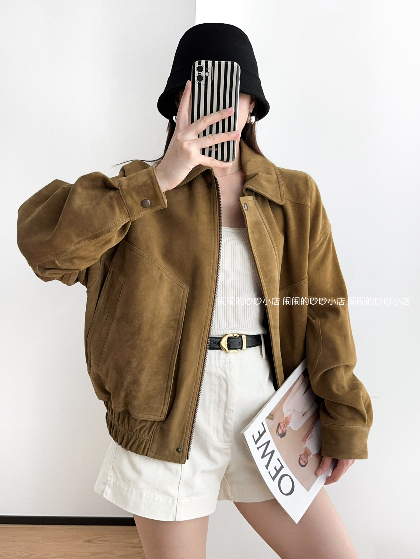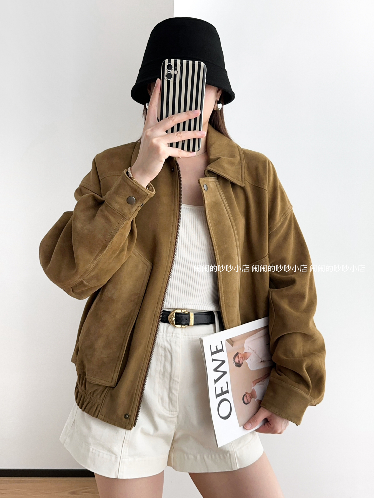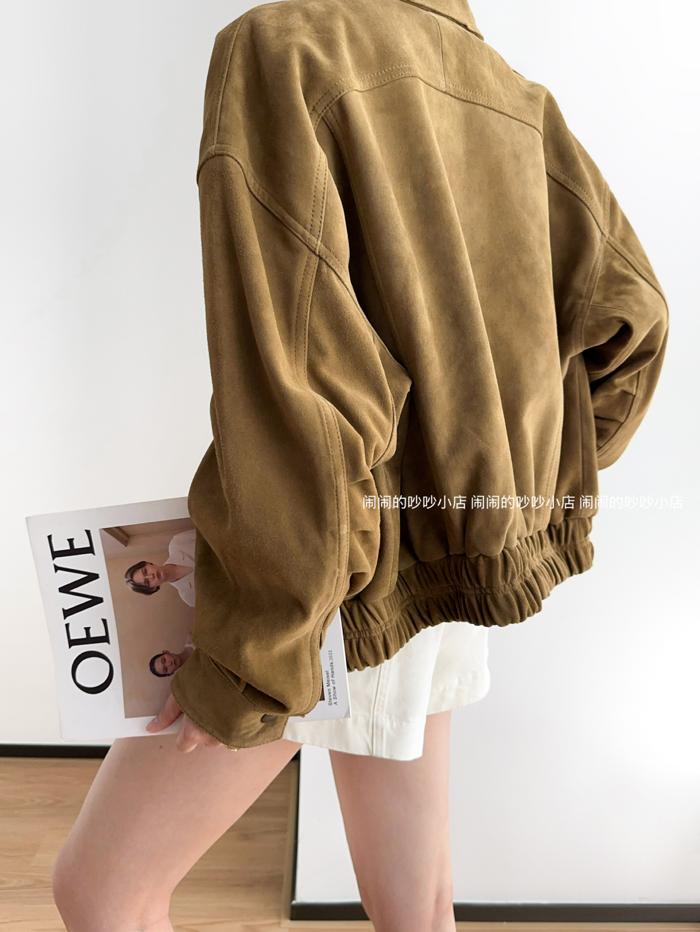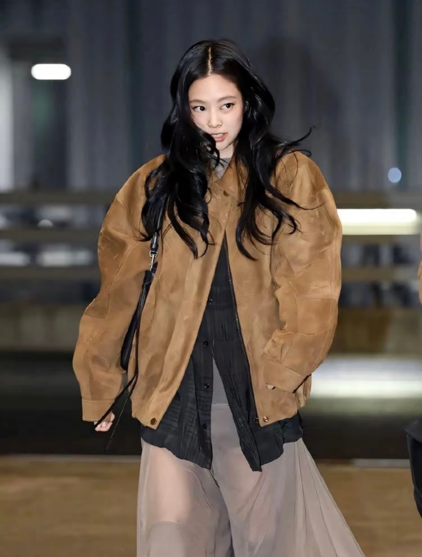 整体轮廓是oversize宽松廓形,衣身微微外扩,给身体留出充裕活动空间很会藏肉,落肩+微肩宽线组合,消弱肩部的硬朗感,是非常适配亚洲人的肩型,优化头肩比,把“松弛感”拆解为:空间感(宽松不紧绷)、比例感(优化头身比)、细节平衡感(下摆松紧、袖型变化)巧妙融合,让一件皮衣既能适配日常随性出街,又能通过版型细节叠加精致度,搭配不同下装,可切换街头潮酷或复古文艺风格 。