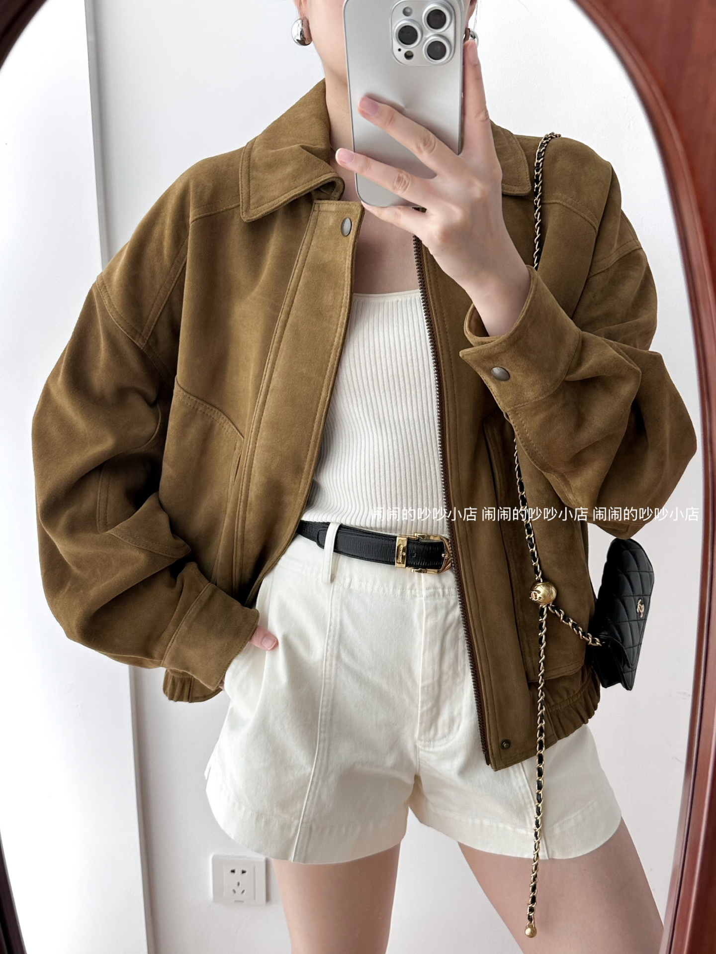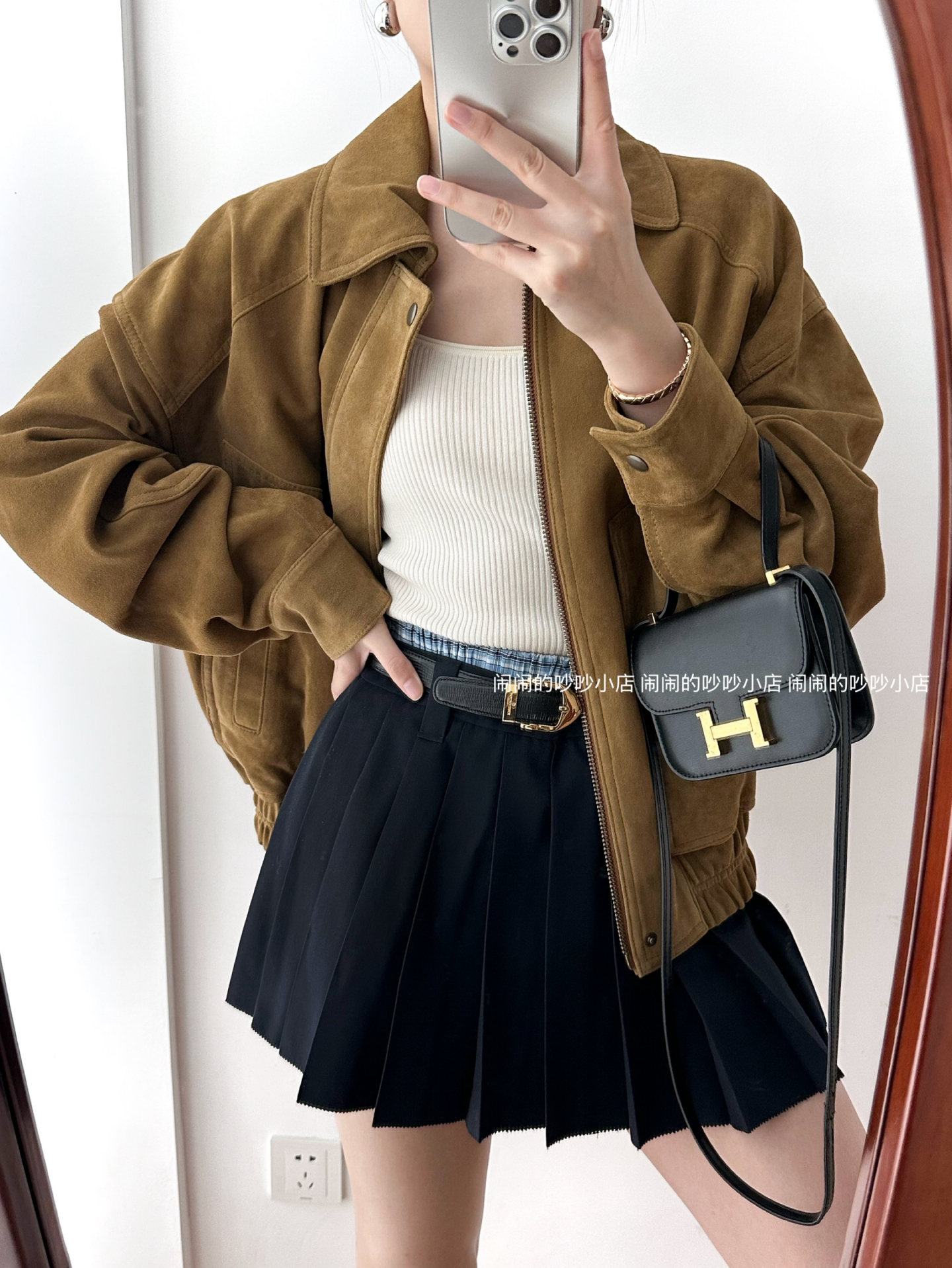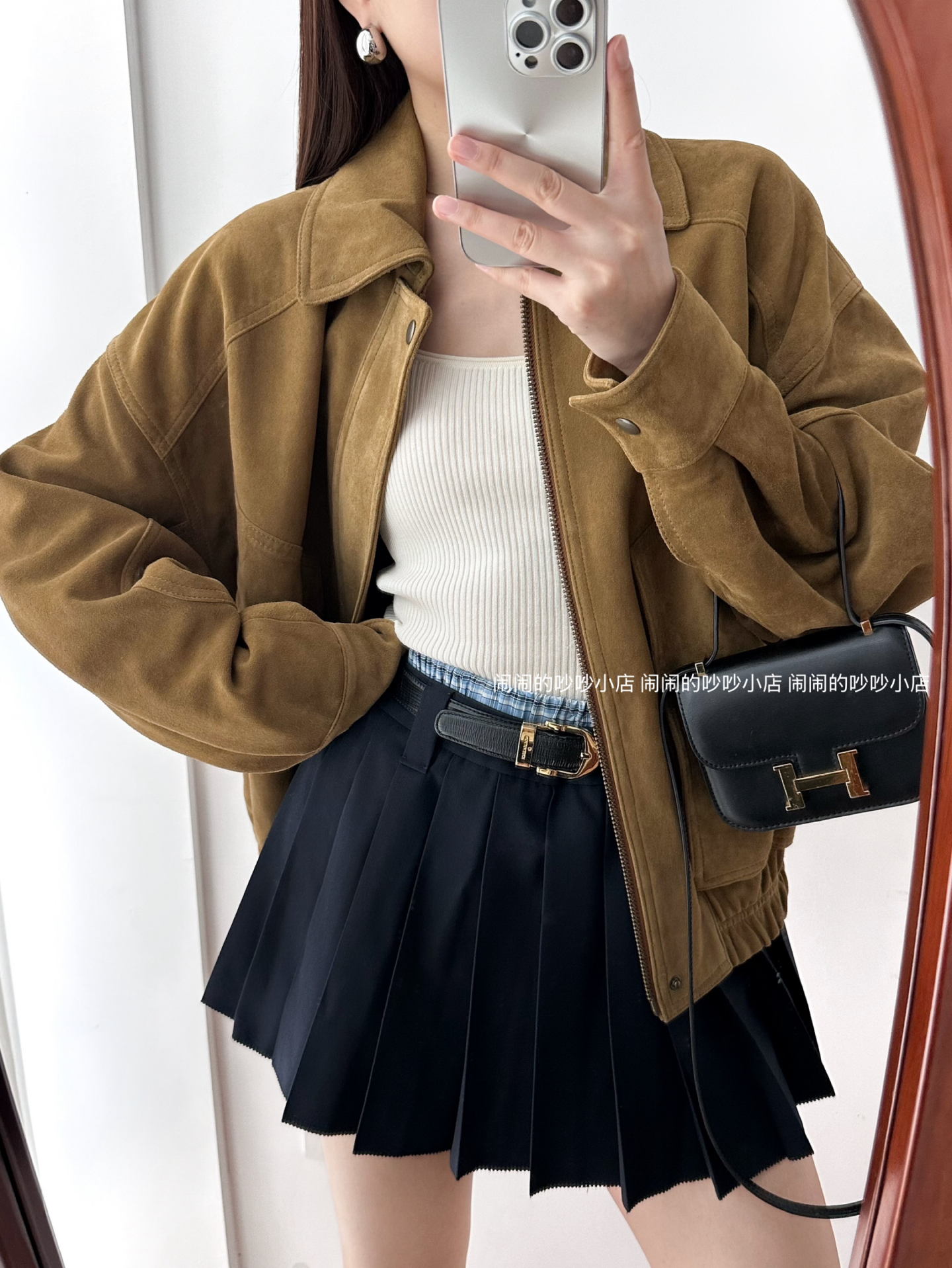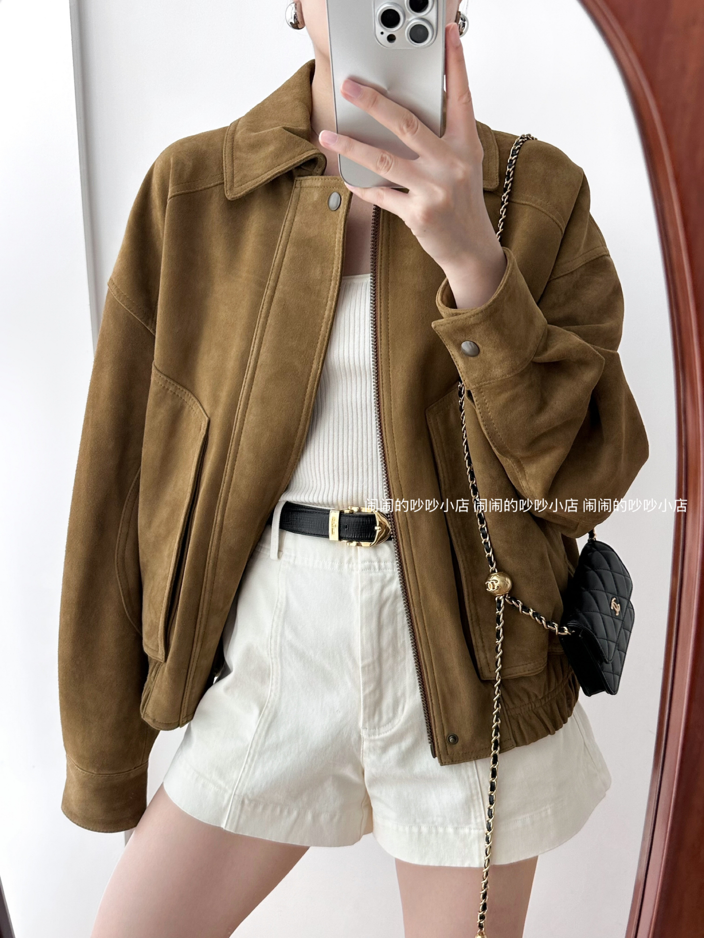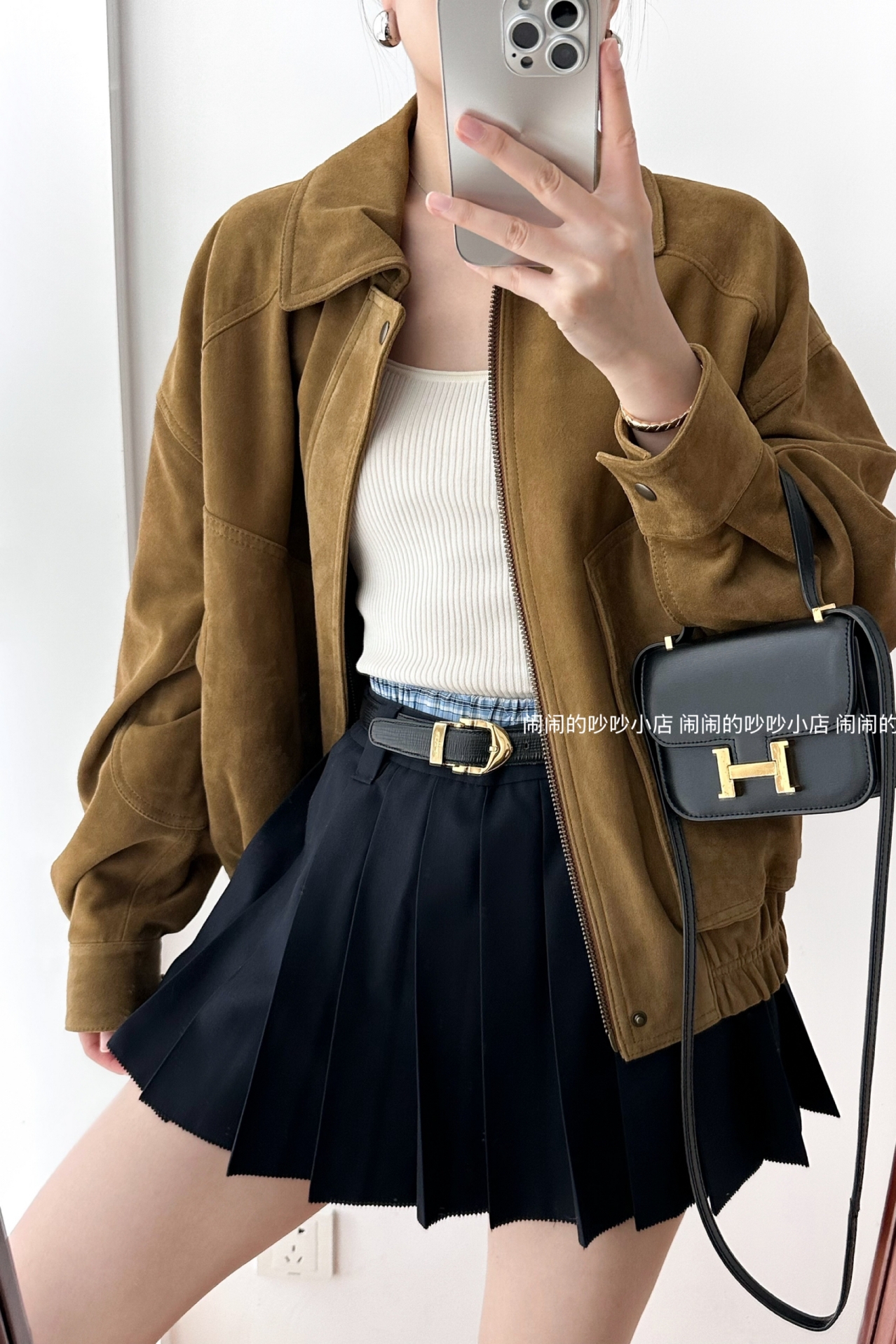 整体轮廓是oversize宽松廓形,衣身微微外扩,给身体留出充裕活动空间很会藏肉,落肩+微肩宽线组合,消弱肩部的硬朗感,是非常适配亚洲人的肩型,优化头肩比,把“松弛感”拆解为:空间感(宽松不紧绷)、比例感(优化头身比)、细节平衡感(下摆松紧、袖型变化)巧妙融合,让一件皮衣既能适配日常随性出街,又能通过版型细节叠加精致度,搭配不同下装,可切换街头潮酷或复古文艺风格 。