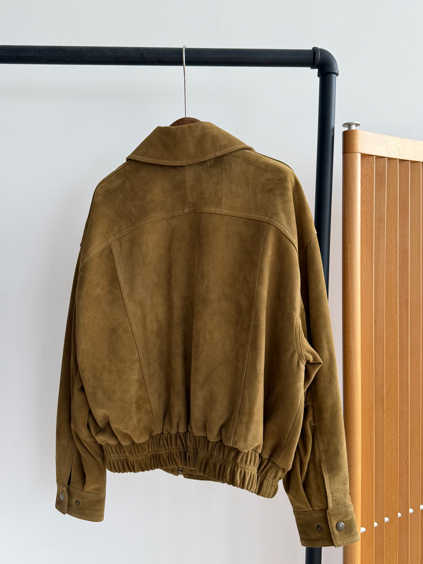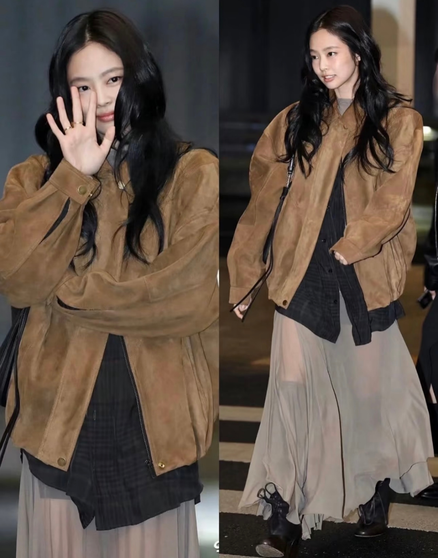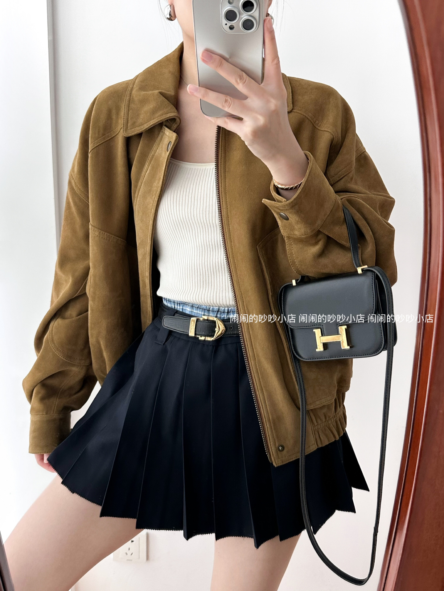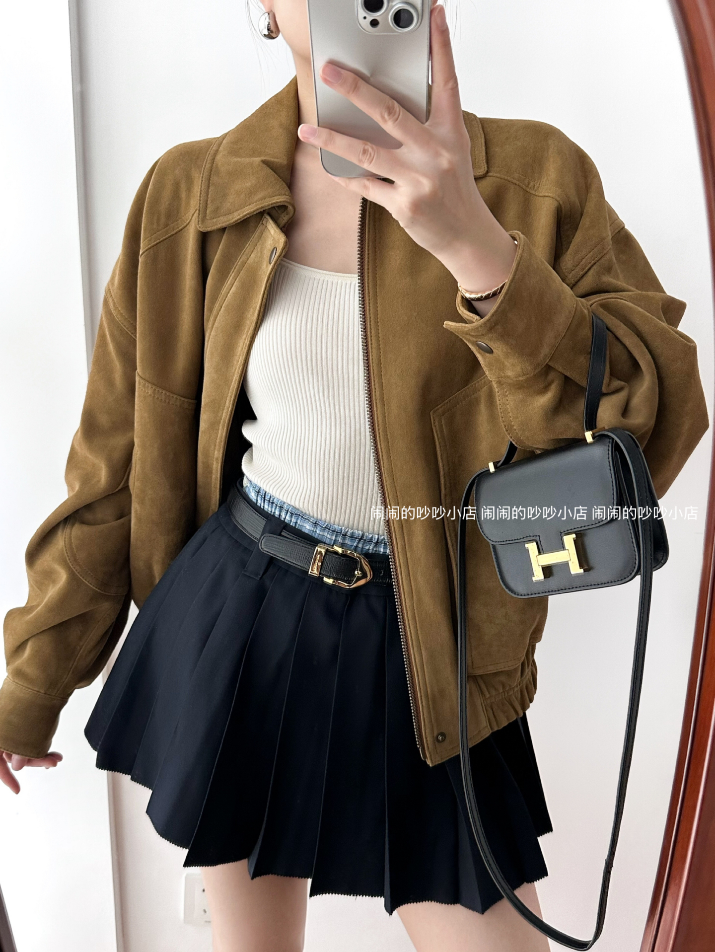 整体轮廓是oversize宽松廓形,衣身微微外扩,给身体留出充裕活动空间很会藏肉,落肩+微肩宽线组合,消弱肩部的硬朗感,是非常适配亚洲人的肩型,优化头肩比,把“松弛感”拆解为:空间感(宽松不紧绷)、比例感(优化头身比)、细节平衡感(下摆松紧、袖型变化)巧妙融合,让一件皮衣既能适配日常随性出街,又能通过版型细节叠加精致度,搭配不同下装,可切换街头潮酷或复古文艺风格 。