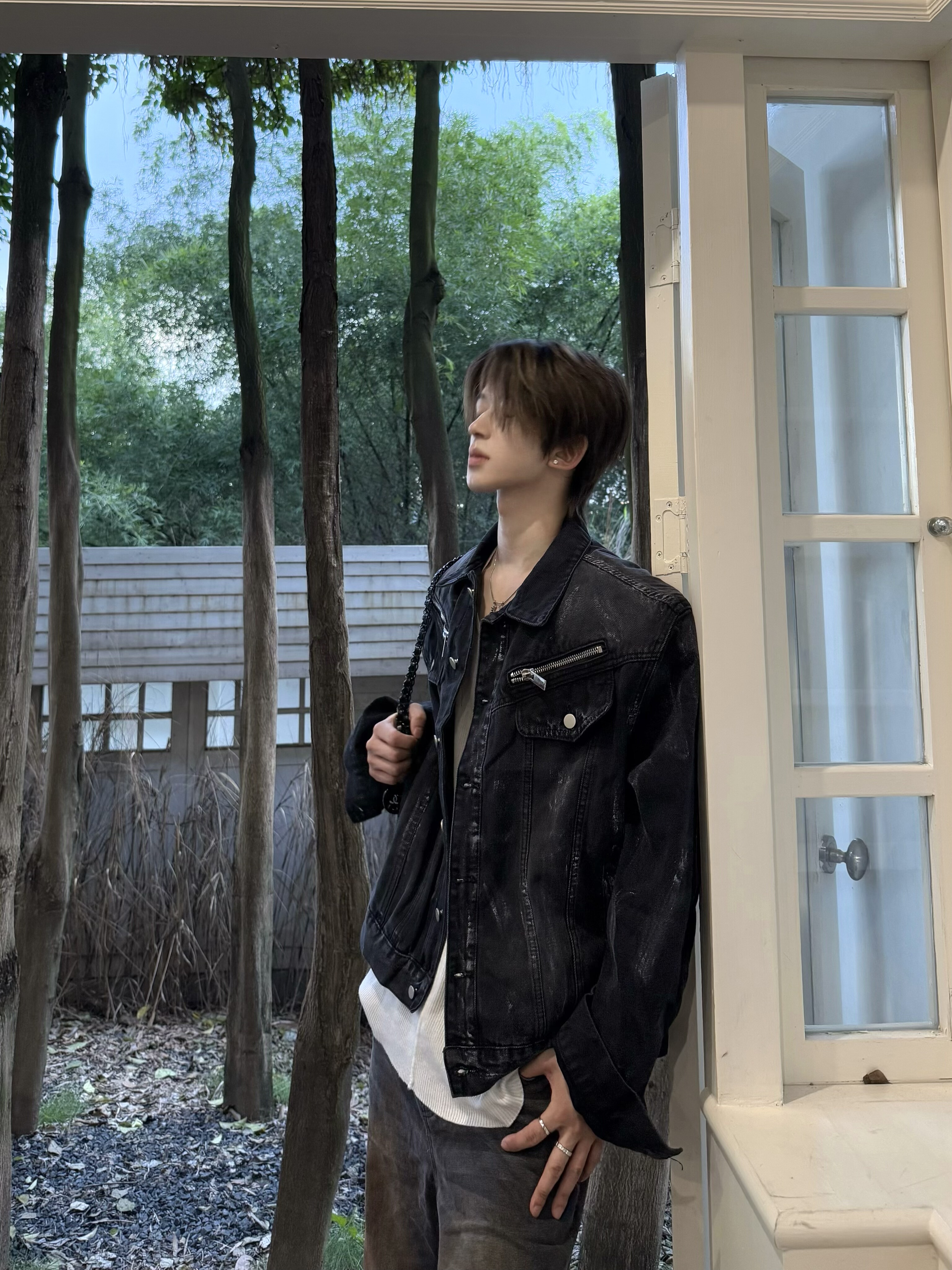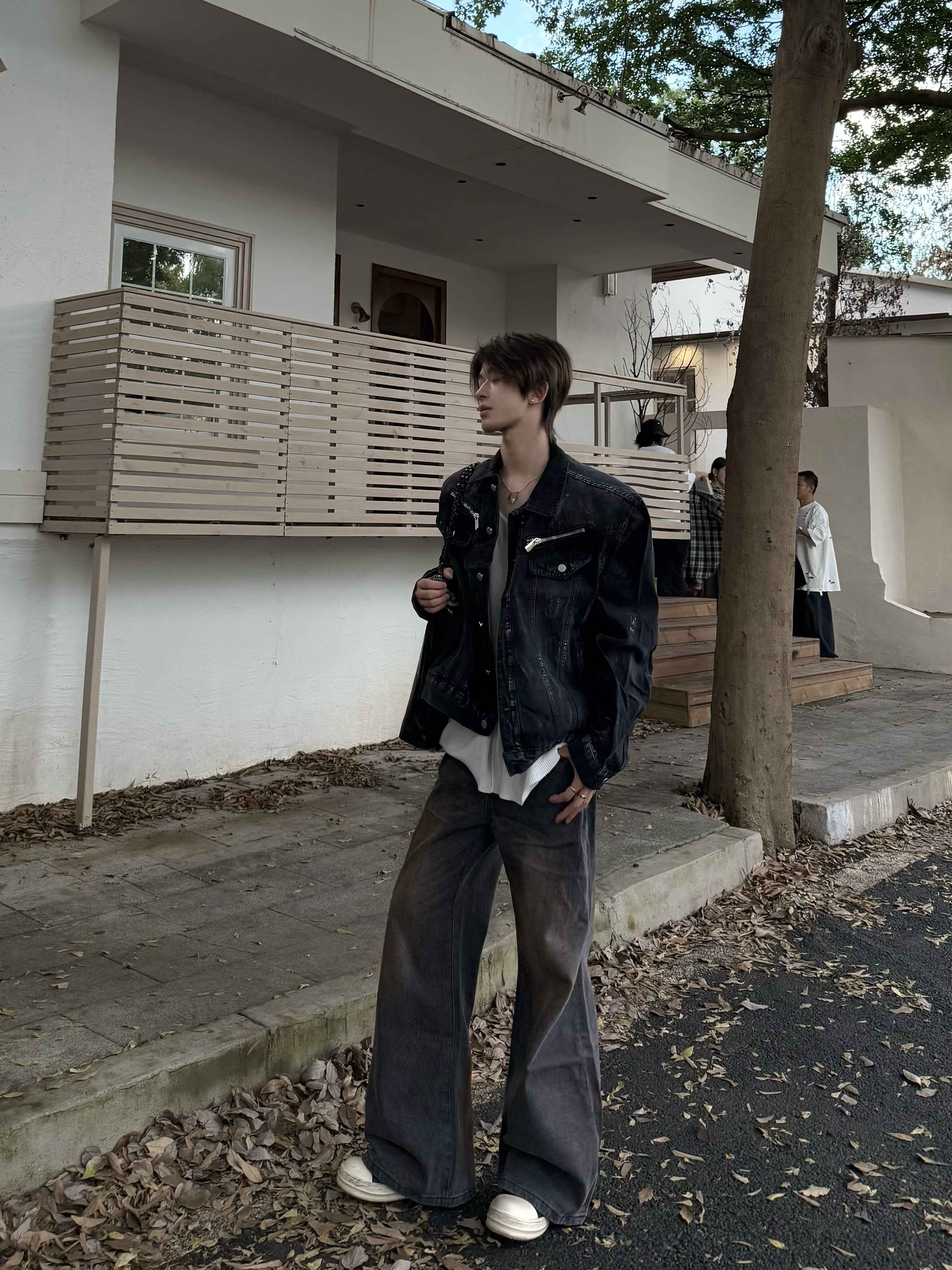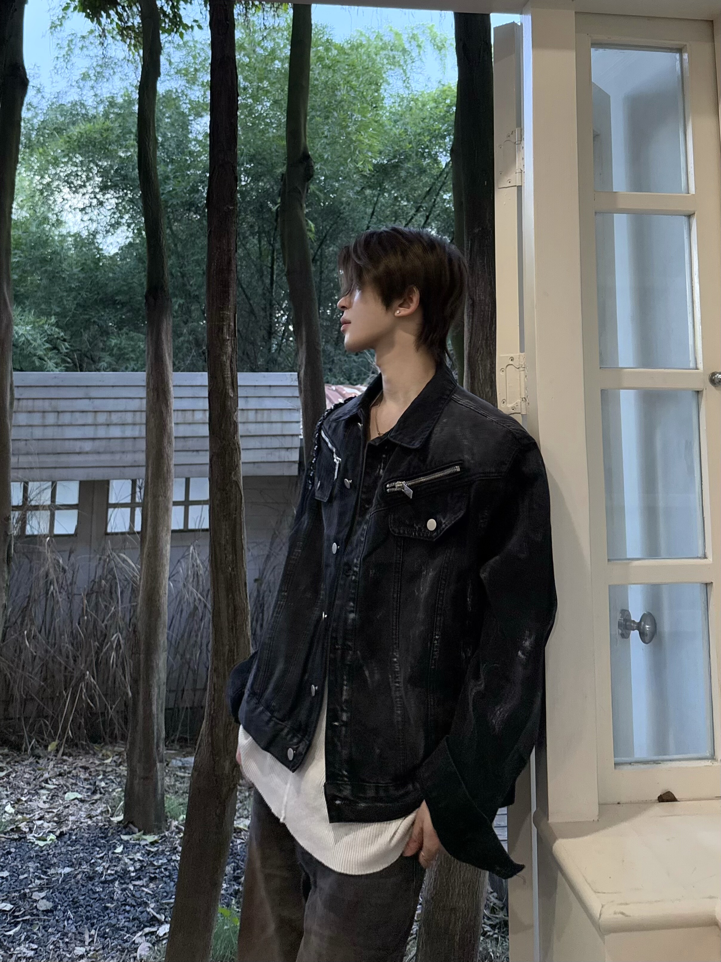 Jichuan Yep Autumn and Winter Niche Design Vintage Distressed Washed High-End Shoulder-Padded Short Denim Top
