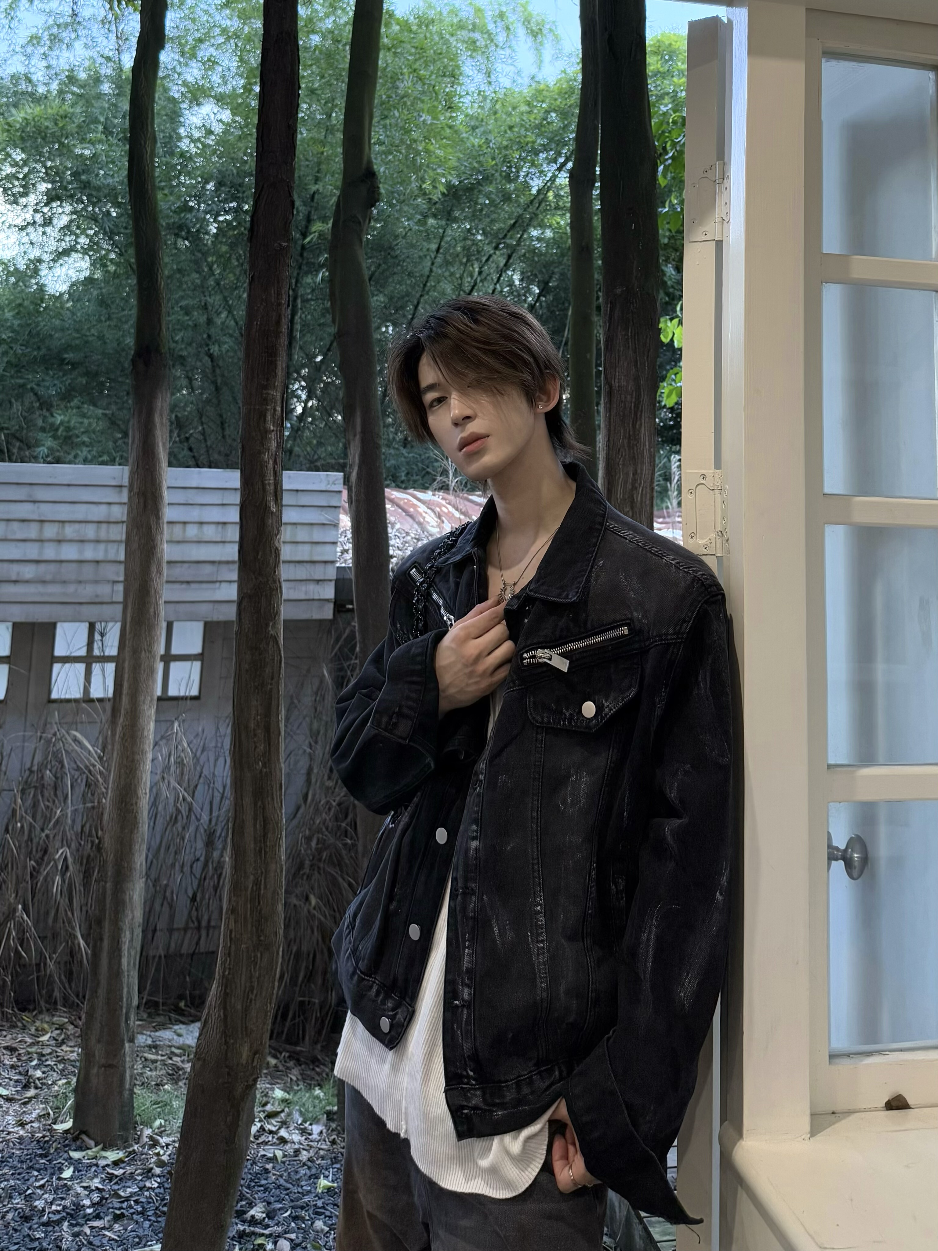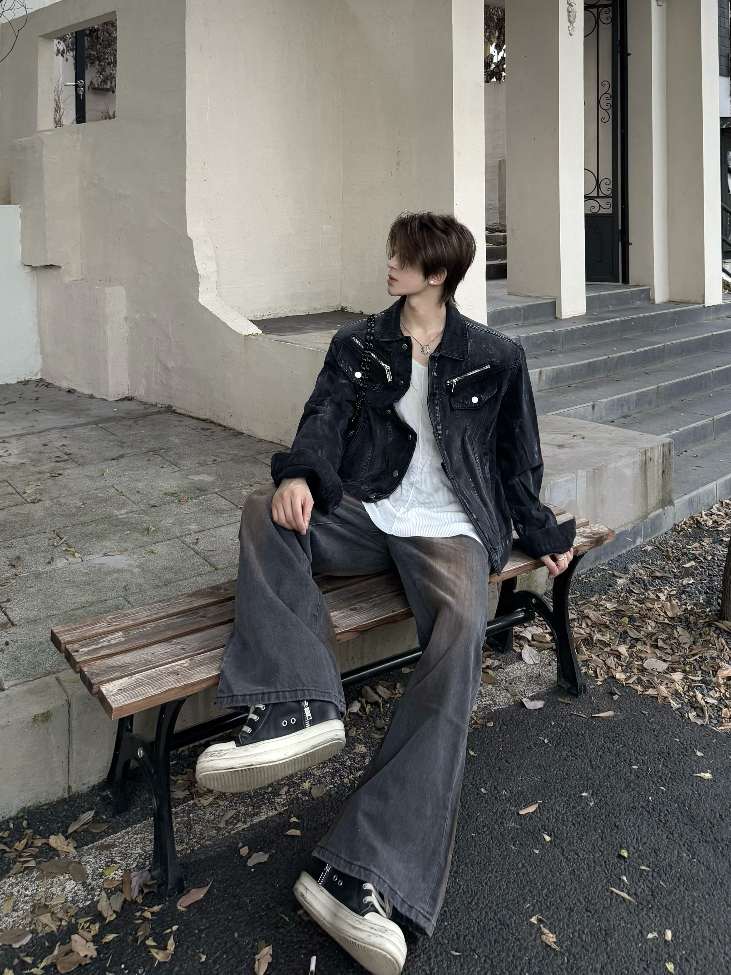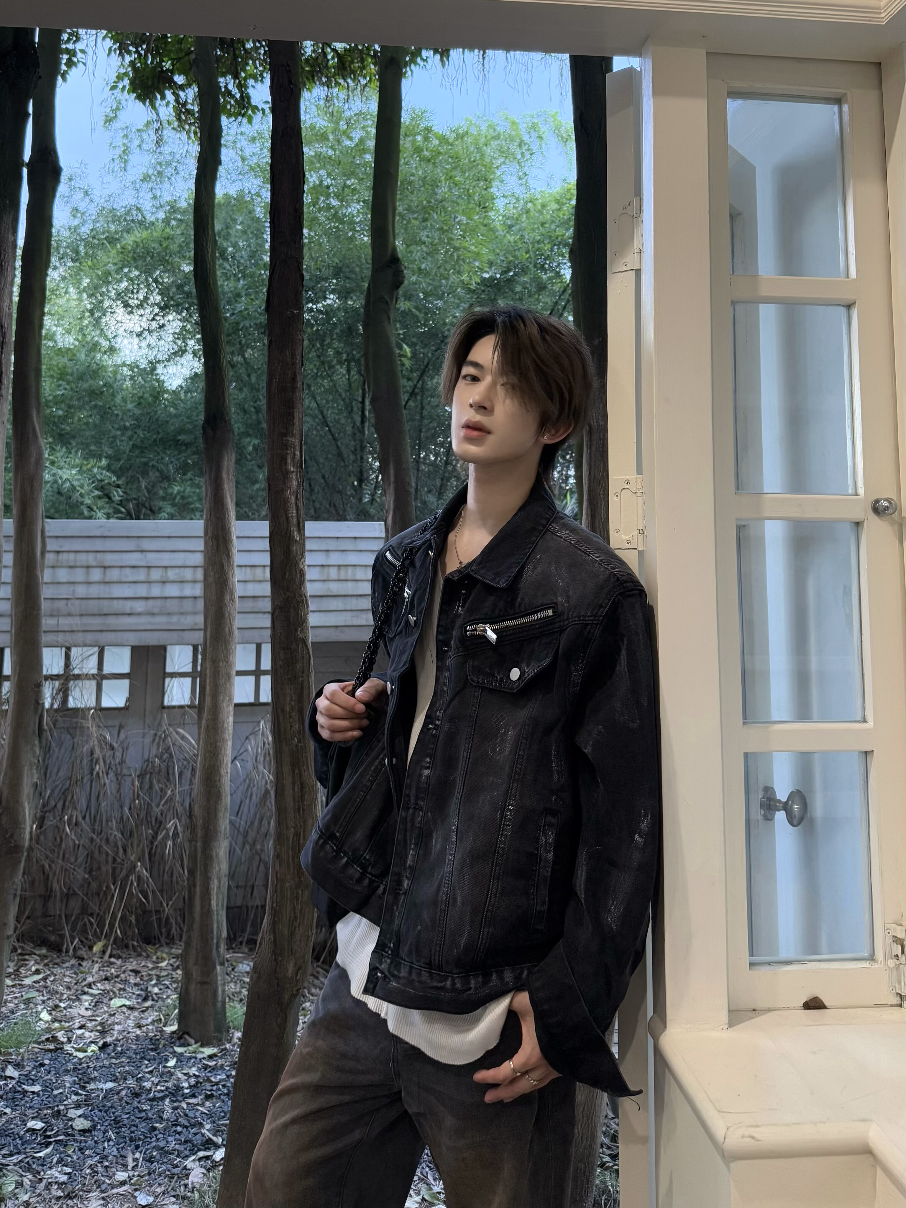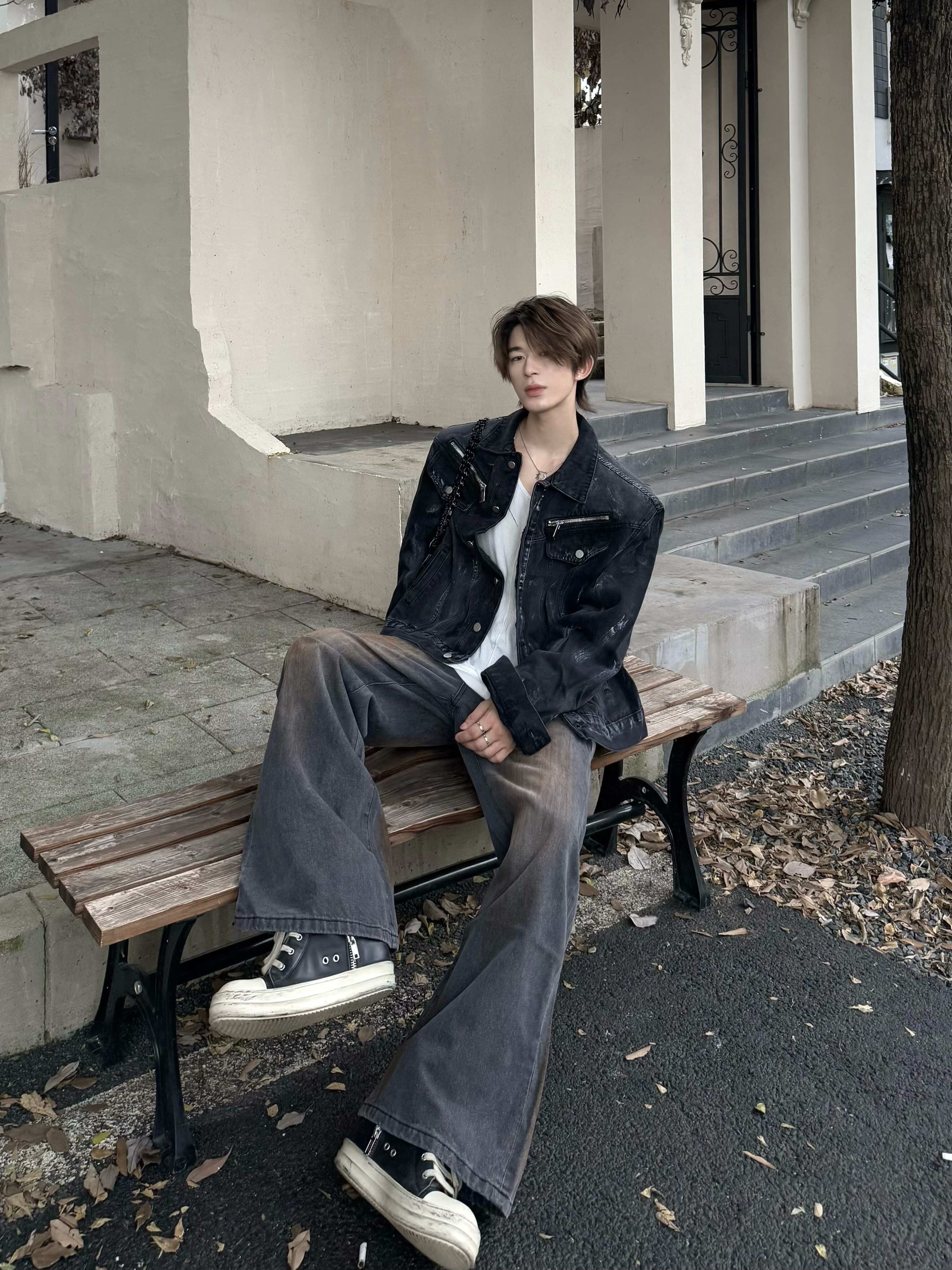 Jichuan Yep Autumn and Winter Niche Design Vintage Distressed Washed High-End Shoulder-Padded Short Denim Top