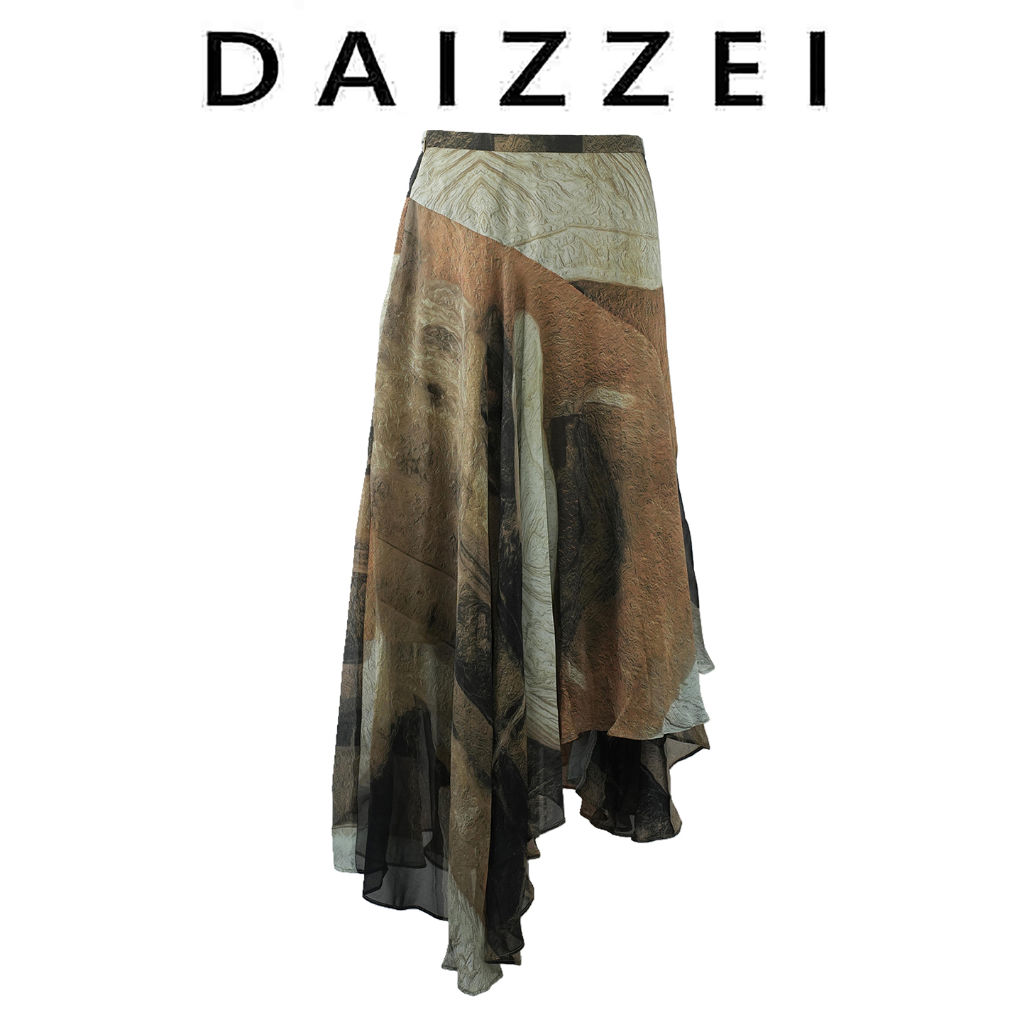Daizzei~2025 Autumn New Oil Painting Style Print Elastic Waist Slimming Irregular Flared A-Line Skirt for Women