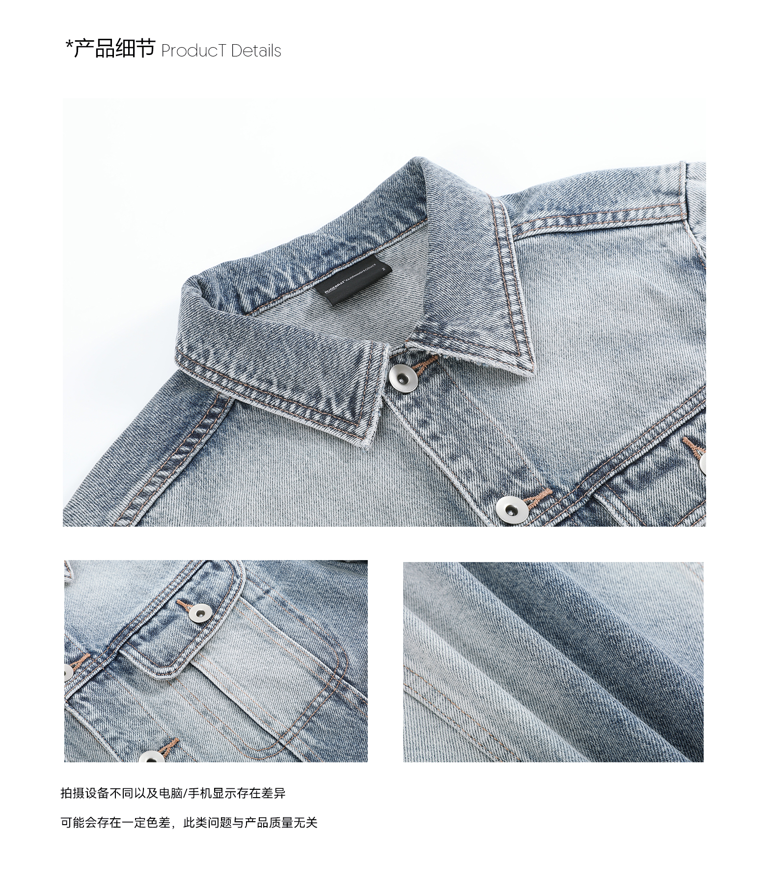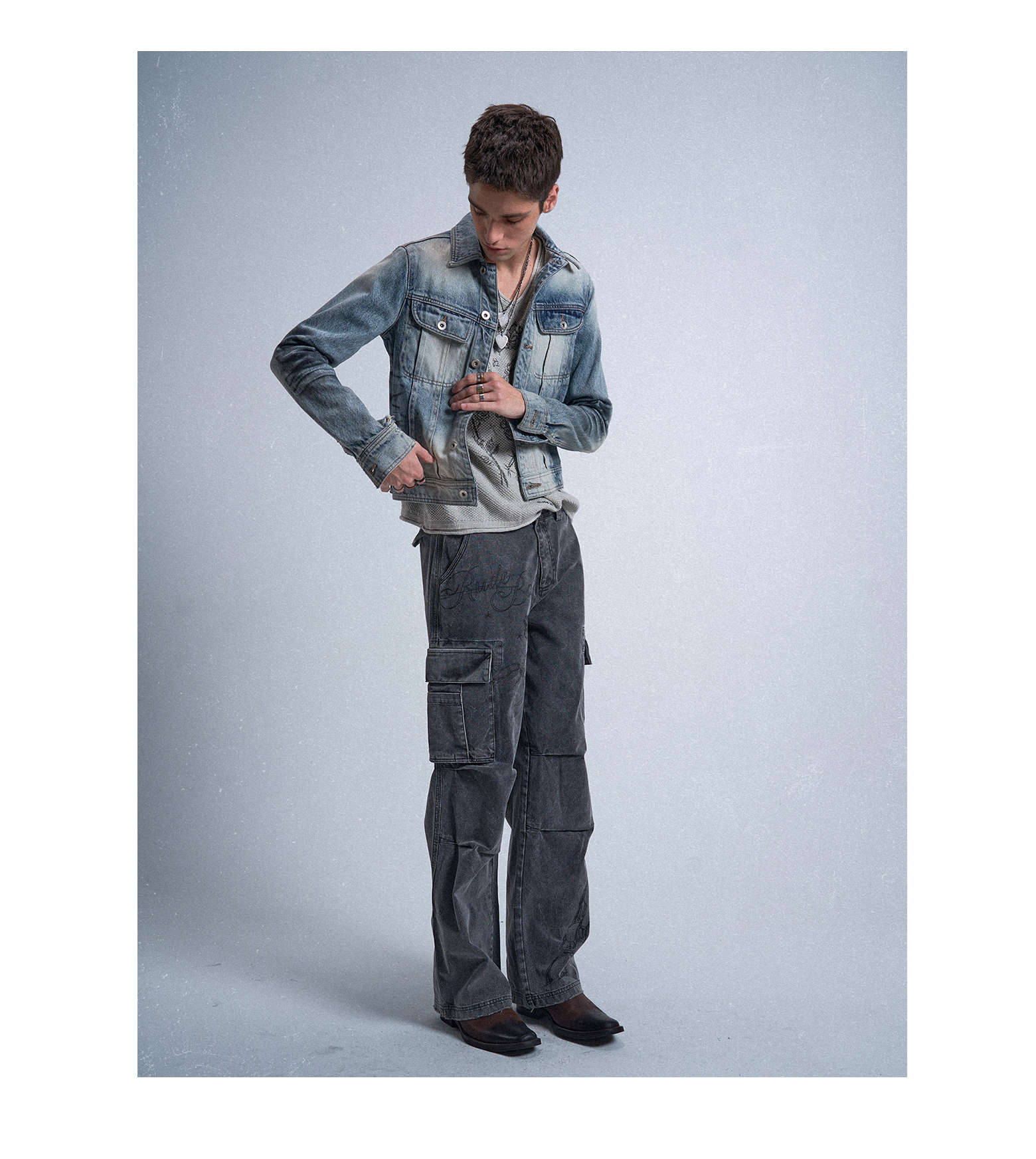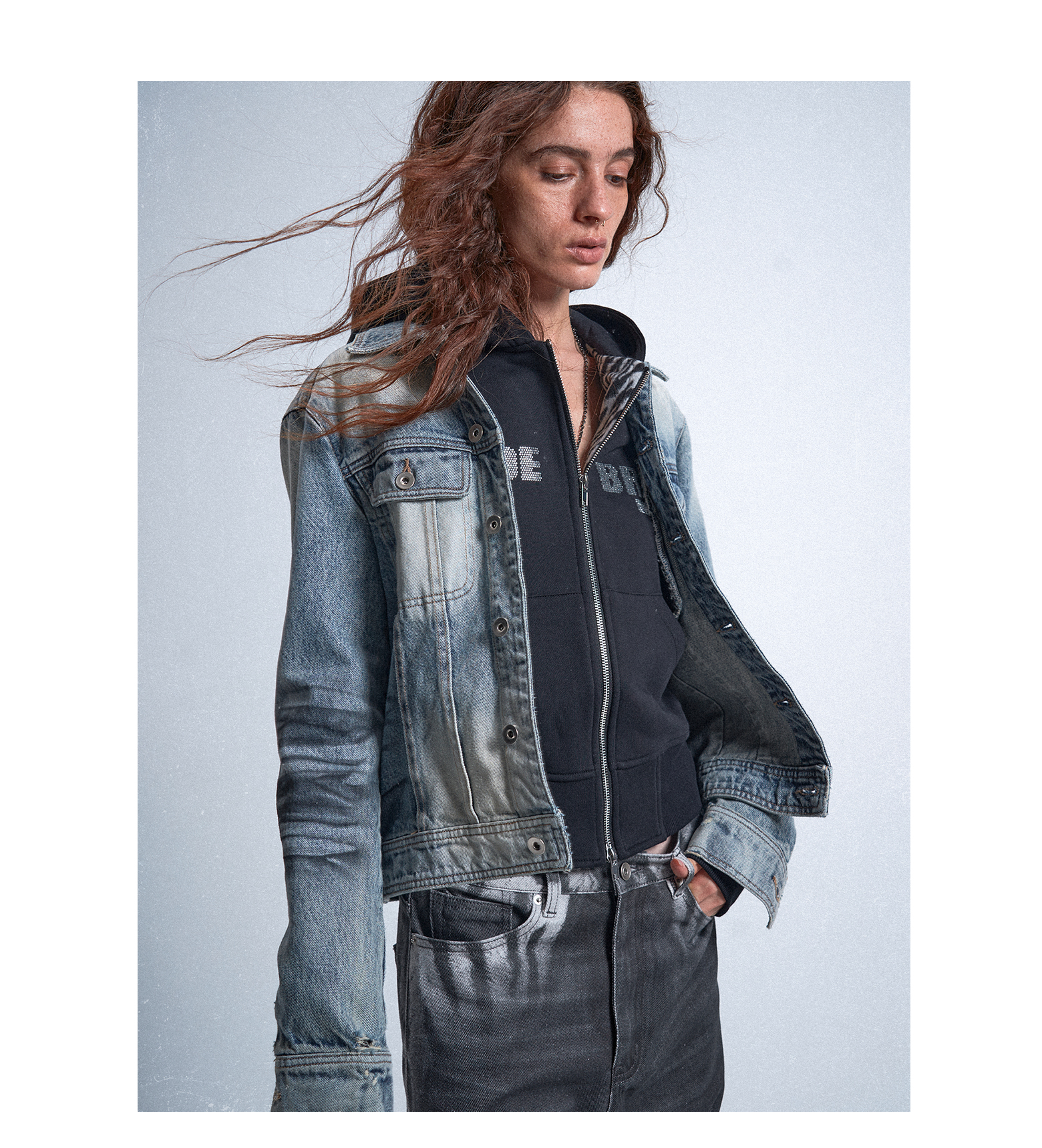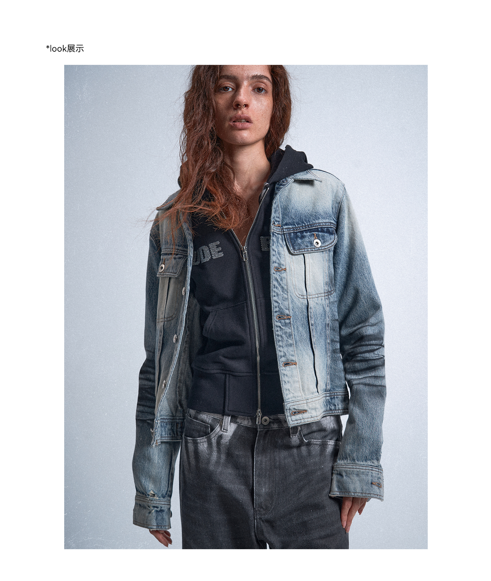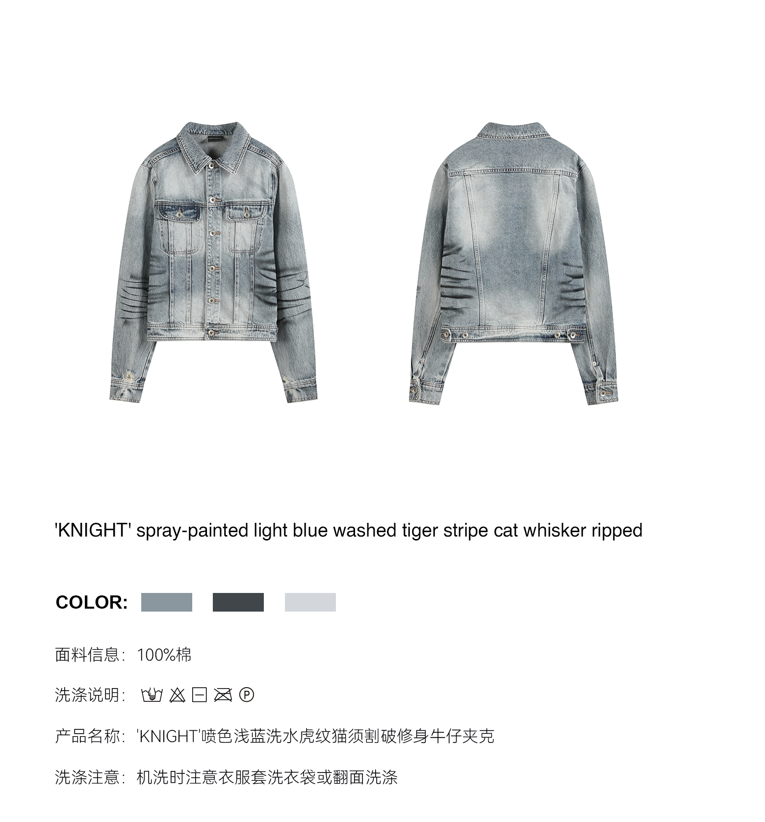 Noemosen(Noe)'Knight' Spray-Painted Light Blue Washed Tiger-Striped Whiskered Distressed Slim-Fit Denim Jacket