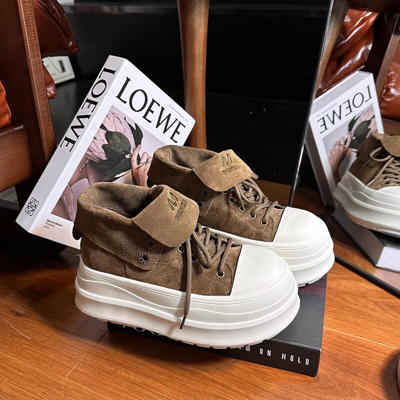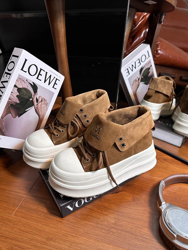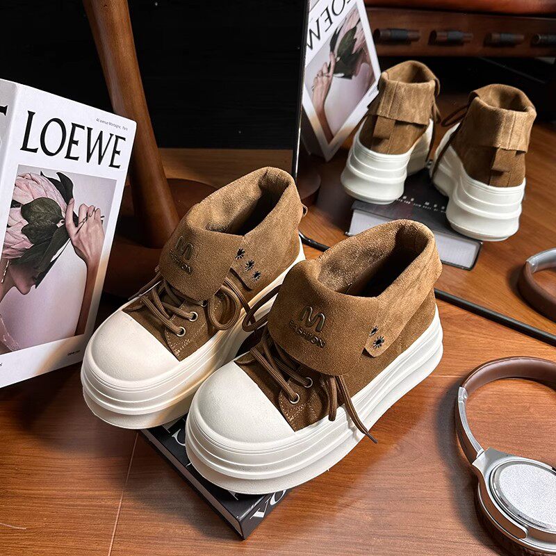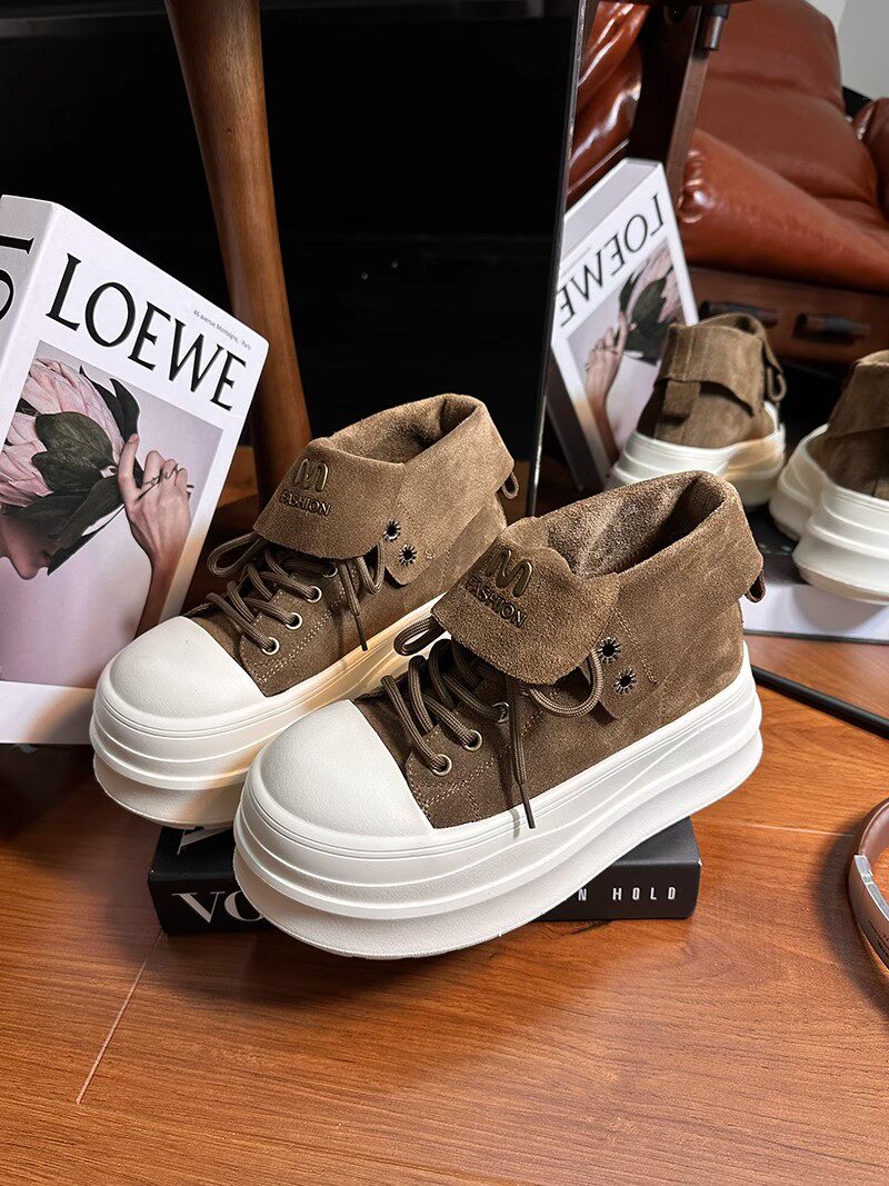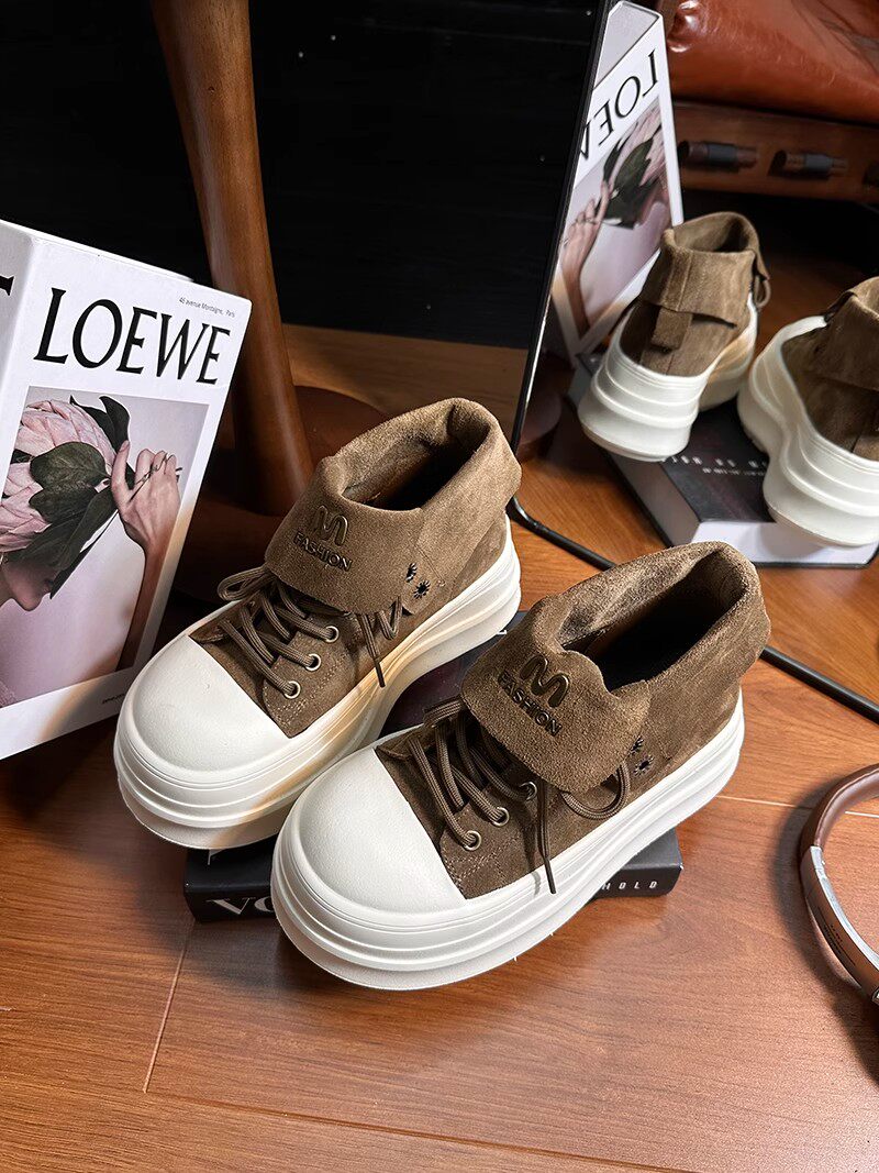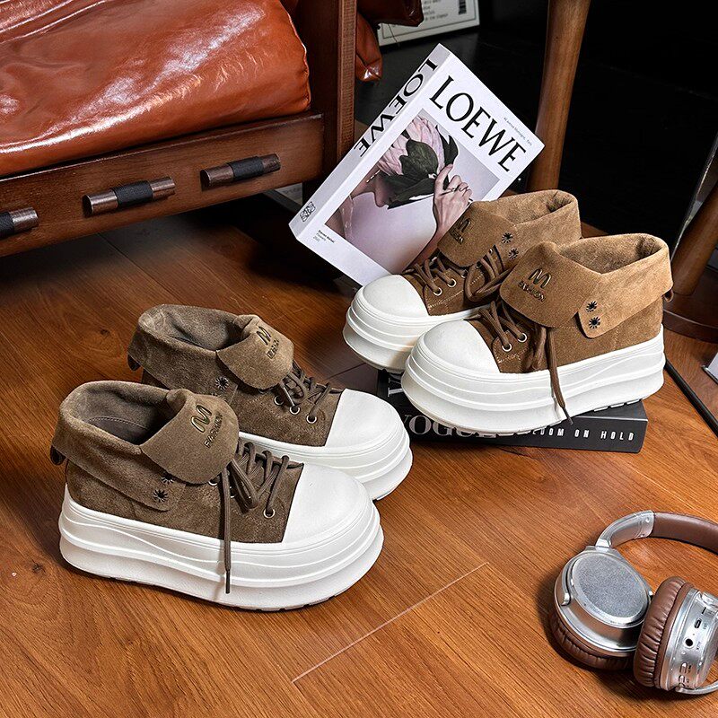 Retro Frosted Lapel Lace-Up Thick-Soled High-Top Shoes for Women, Boots, 2026 New Style, Height-Increasing Casual Shoes for Small People