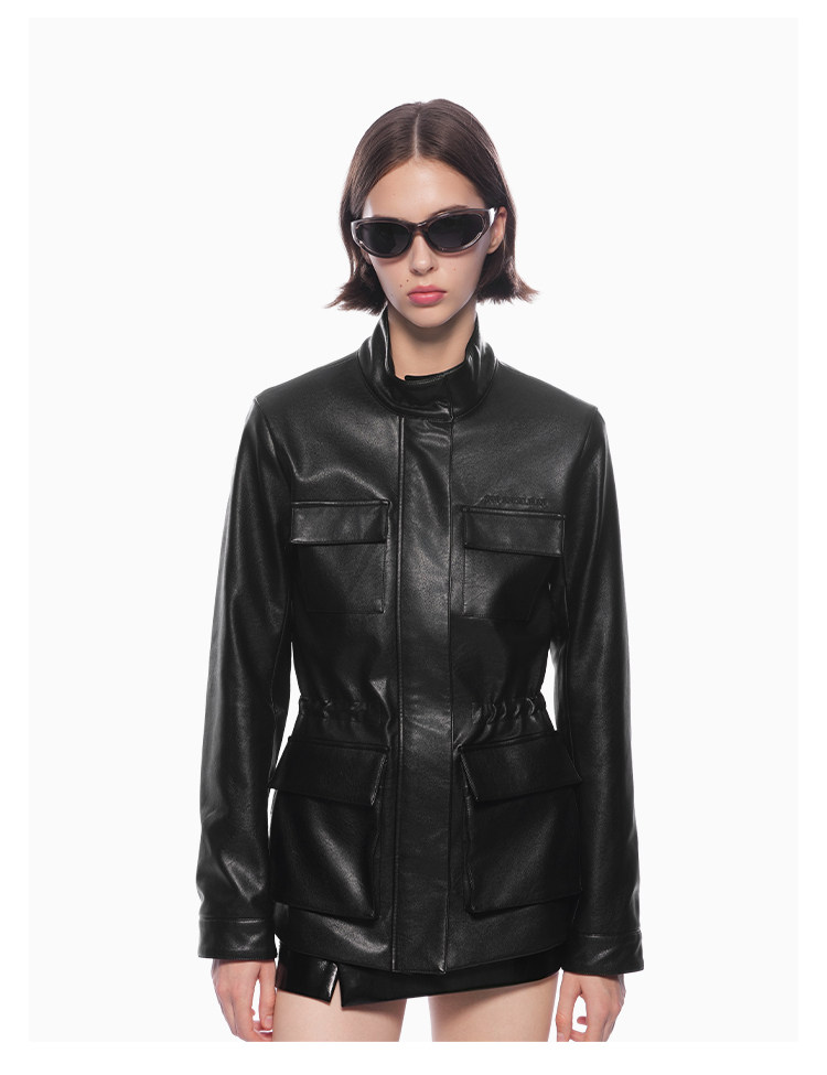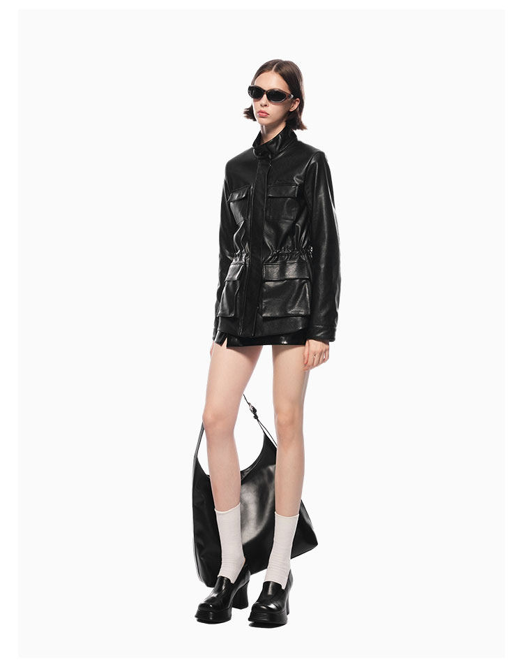 [Same Style as Wu Qianyu] Ann Andelman Workwear Leather Jacket with a High-End Feel, Drawstring Leather Waist-Cinching Black Leather Jacket