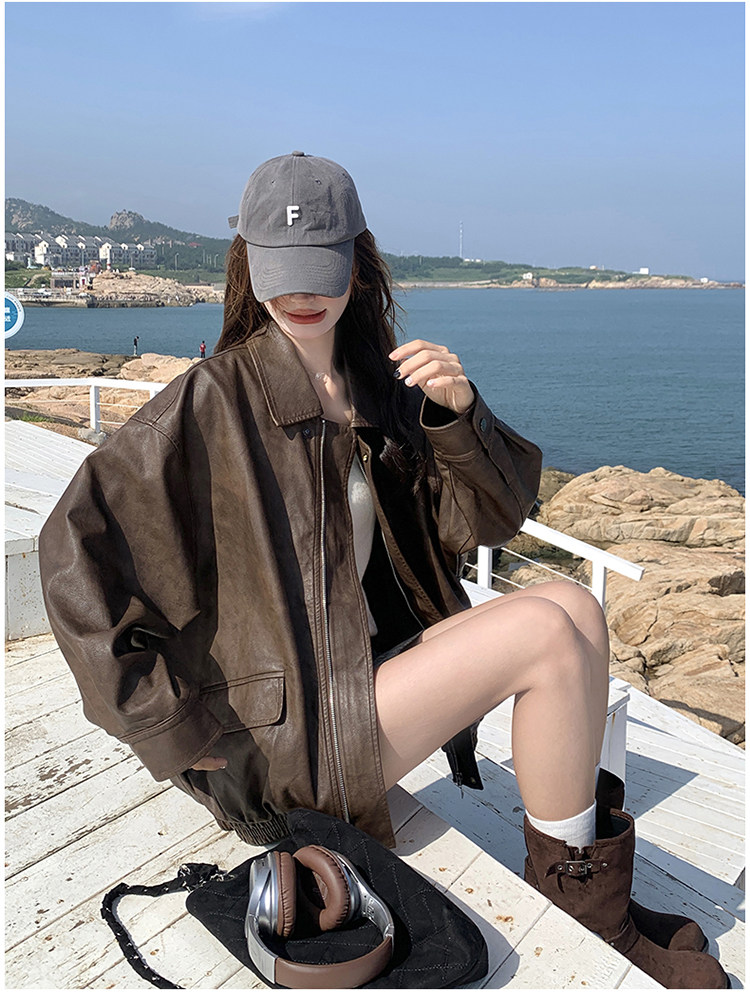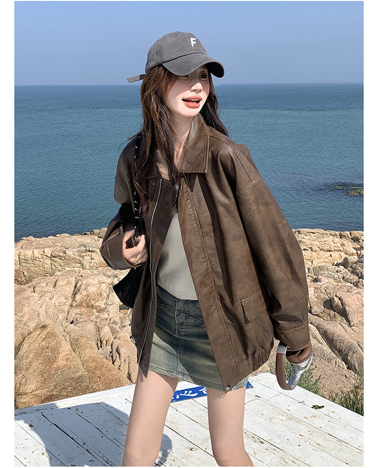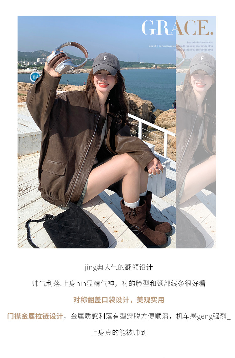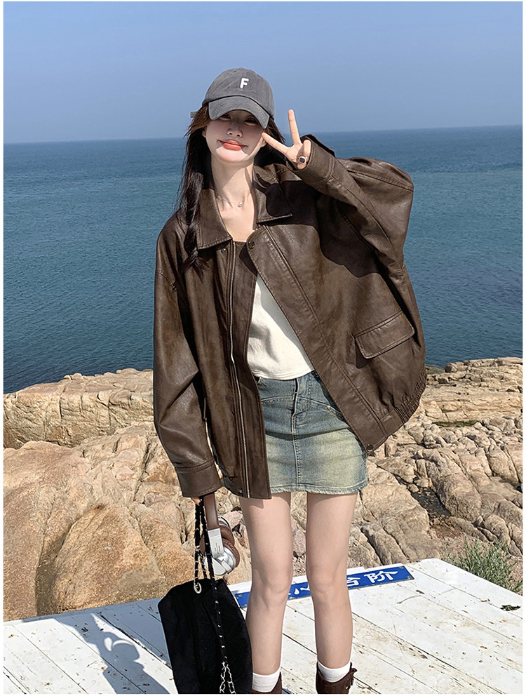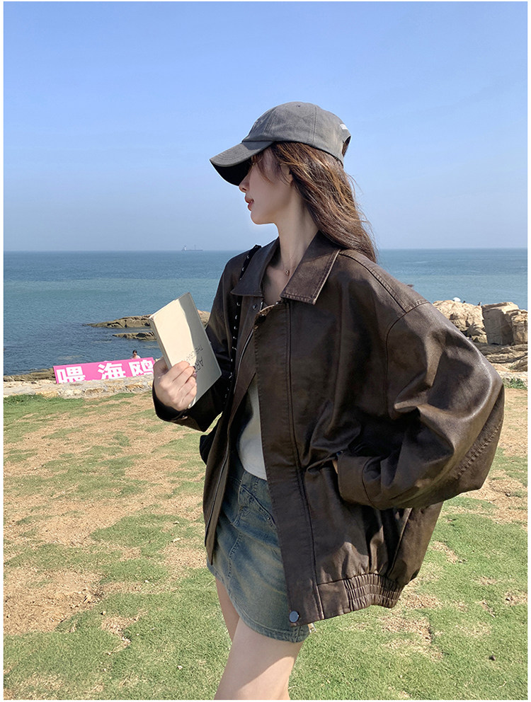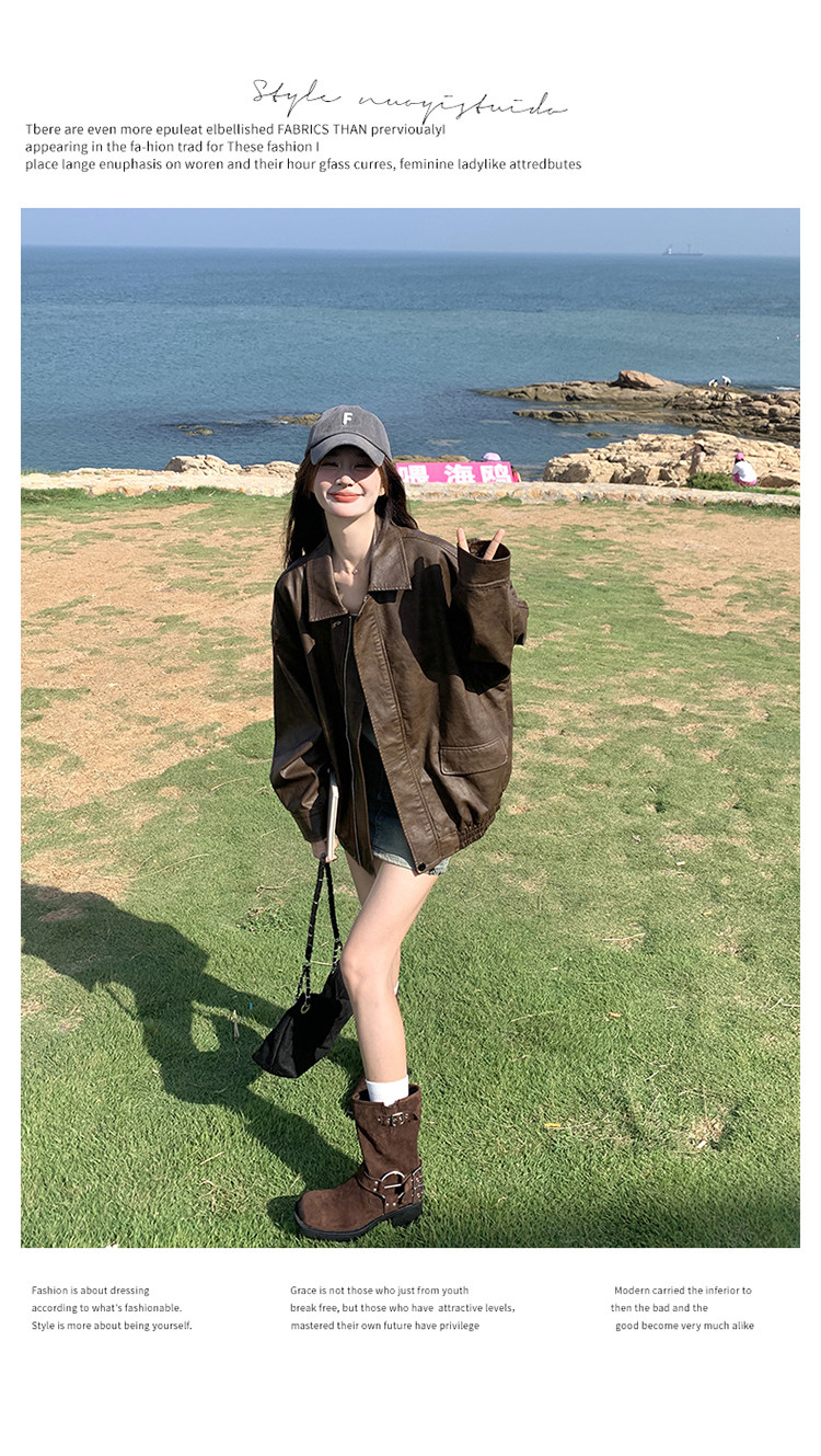 Meilade Leather Jacket for Women, 2026 Spring New Style, Cool and Stylish, High-End Feel, Petite American-Style Brown Biker Jacket