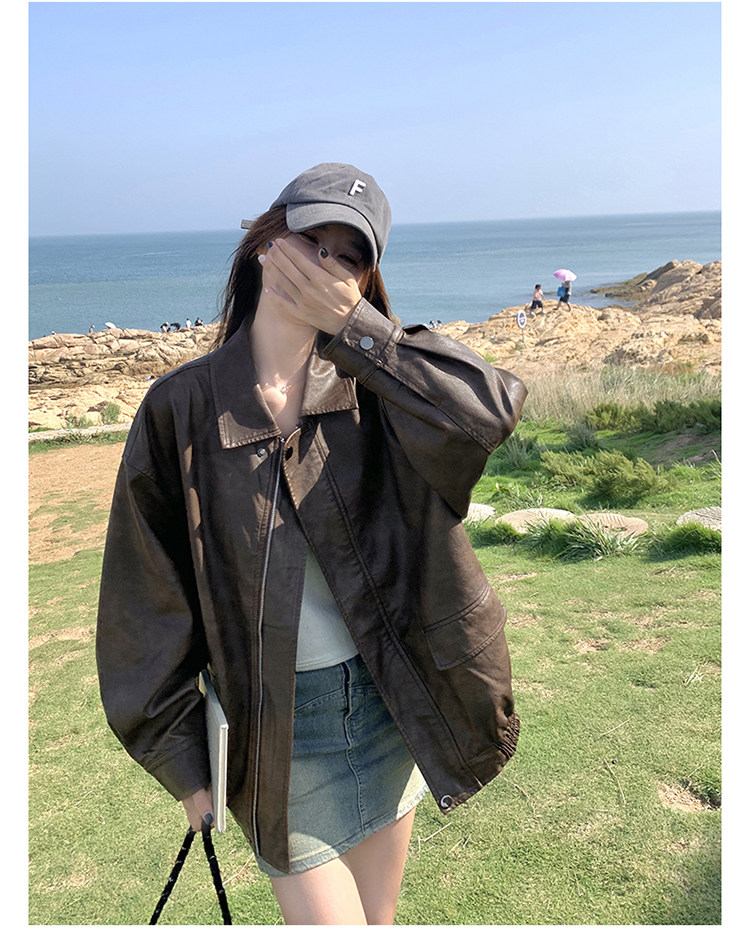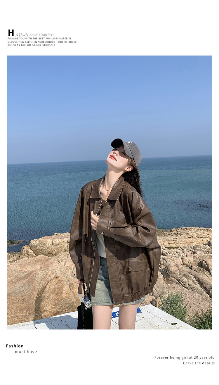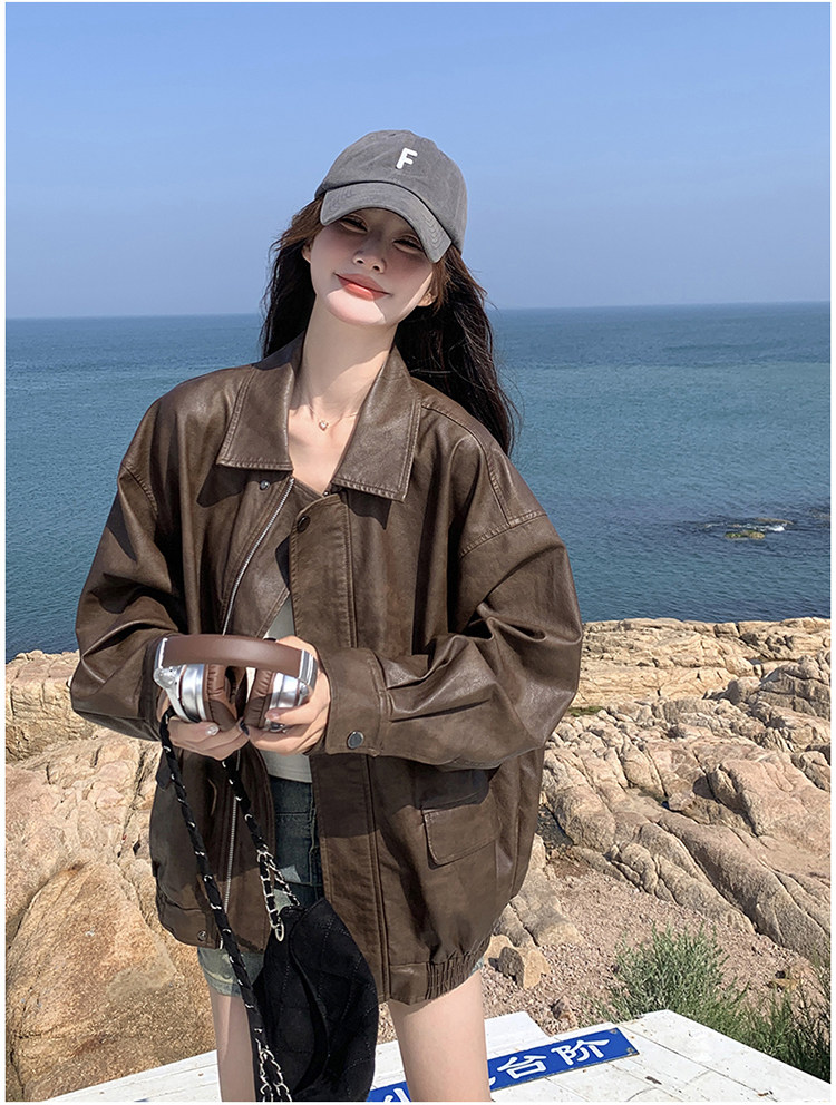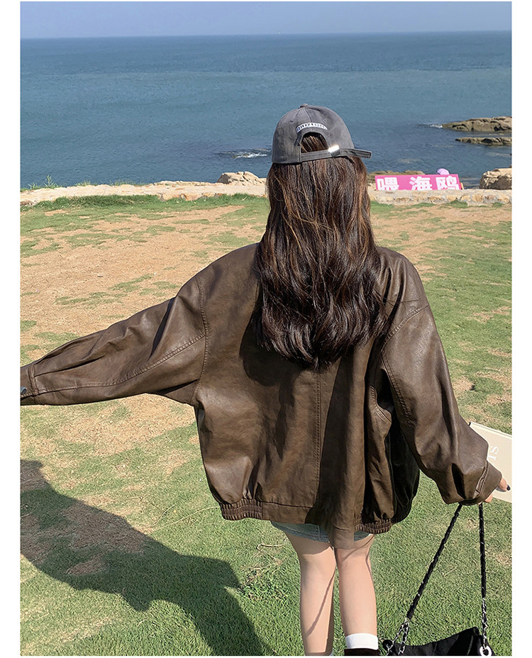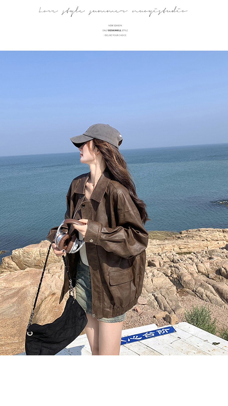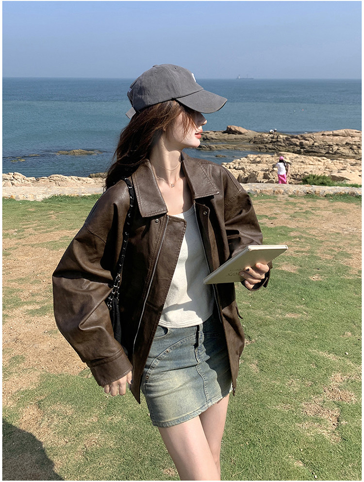 Meilade Leather Jacket for Women, 2026 Spring New Style, Cool and Stylish, High-End Feel, Petite American-Style Brown Biker Jacket