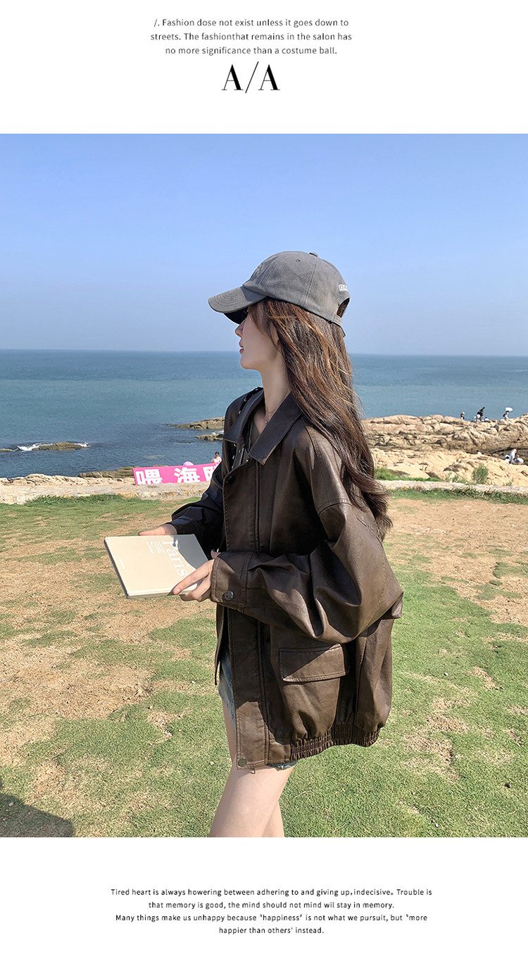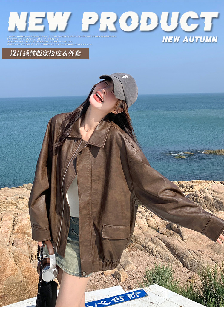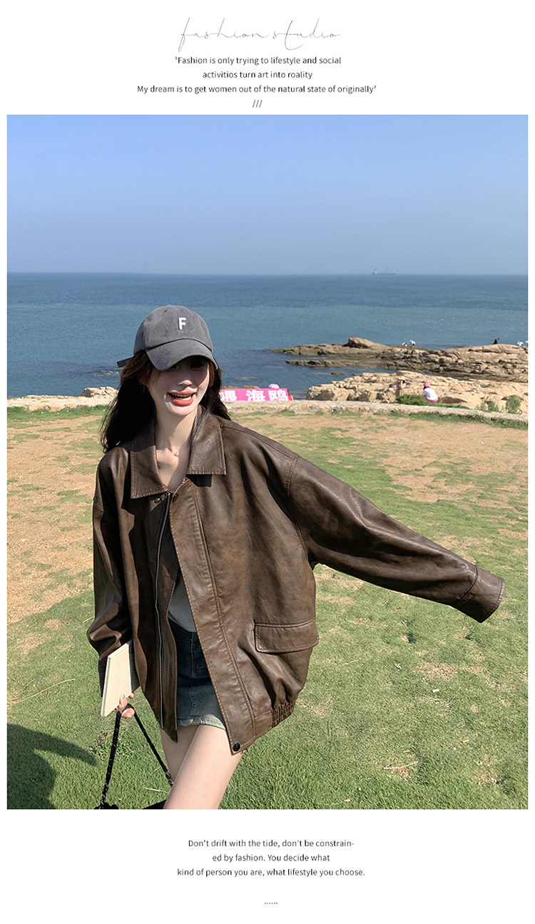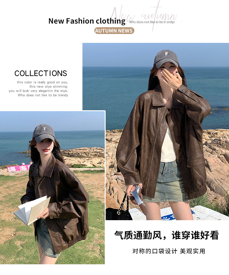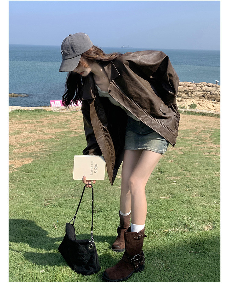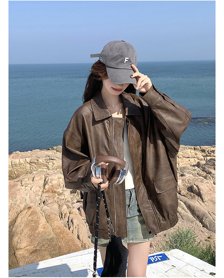 Meilade Leather Jacket for Women, 2026 Spring New Style, Cool and Stylish, High-End Feel, Petite American-Style Brown Biker Jacket